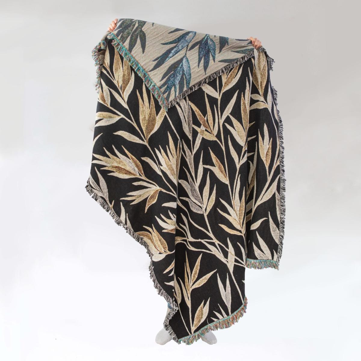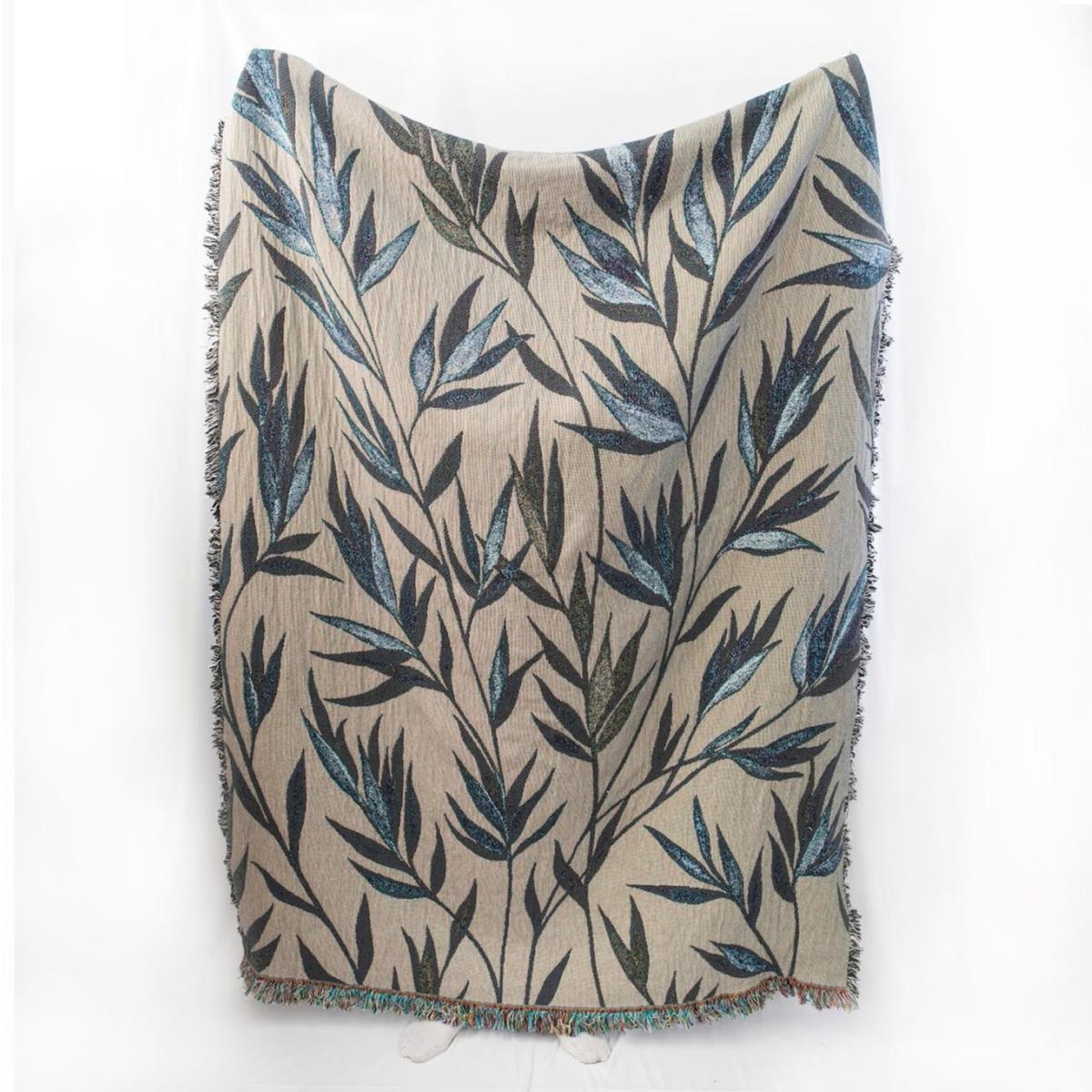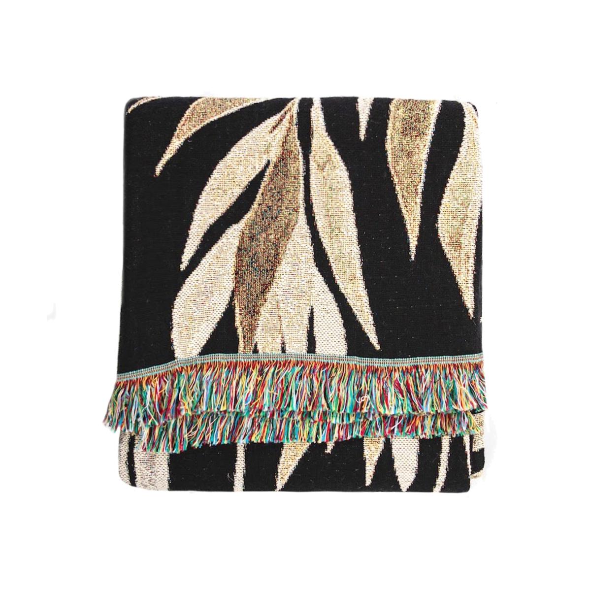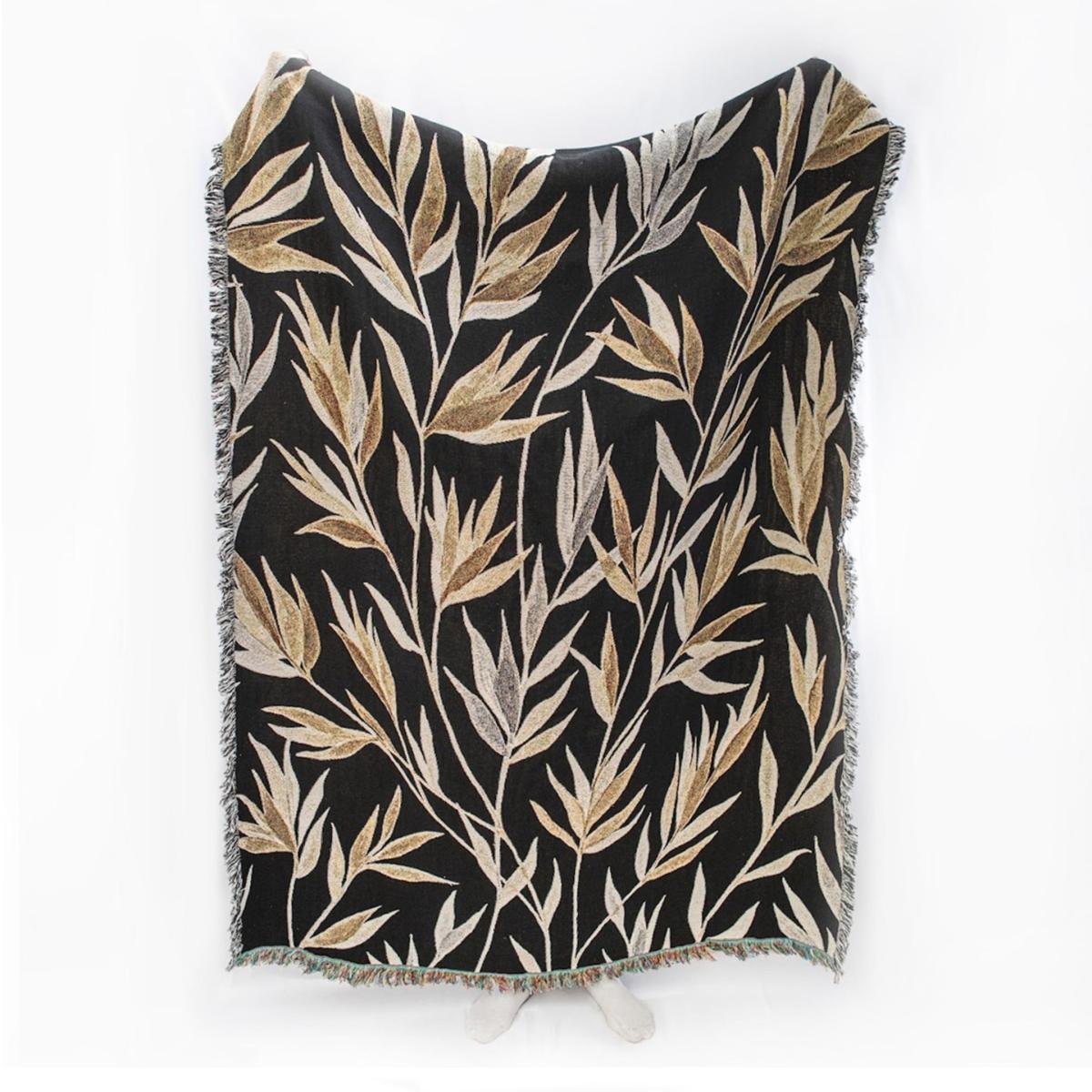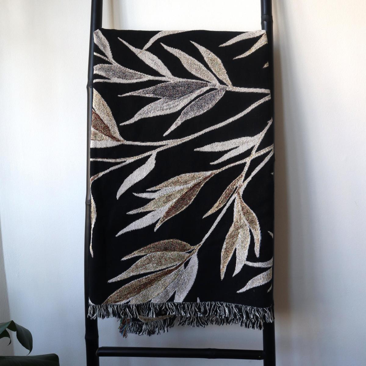 Add a touch of colour to your home with this gorgeous, dark botanical, leaf patterned throw. The Growth woven throw in Black is double sided featuring beautiful dark tones on the front with a contrasting light blue patterned back, providing 2 throws in 1! Designed by Rosanna in her London studio, she translates her original painted floral artwork into this beautiful high quality tactile blanket with wonderful fringe edging. Woven from recycled cotton, this tapestry throw is not only stunning it is both functional and environmentally friendly. Perfect for adding a touch of elegance to your bedding and sofa or on your wall as a fun and colourful jacquard wall hanging!