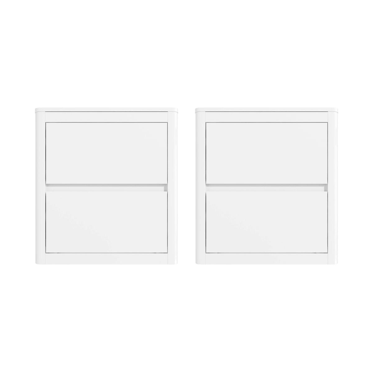This furniture set includes : 2 x Modern White High Gloss Bedside Table with 2 Drawers and Curved Edges - Lexi Features we love Pair of modern bedside tables, each with 2 drawers Seamless curved design and integrated handles A sleek white gloss finish gives it a natural shine Comes with preinstalled runners for easy assembly Full Lexi bedroom furniture collection available All about me Give your bedroom the finishing touch with this sleek set of bedside tables. With clean lines, curved edges and a flawless white high gloss finish, they'll suit any interior setting. Each bedside table has two drawers with contrasting mink interiors, perfect for keeping your bedside essentials close by. The tops are ideal for placing your bedtime read and standing a lamp, plus an alarm clock. Need to know Packed dimensions:W76.5 x D51.3 x H23.6 cm Packed weight: 23.6kg Dimensions:W57.5 x D40 x H61.5 cm Drawer dimensions:W43 x D33 x H18 cm Number of drawers: 2 Colour: White Finish: high gloss Material: Wood combination with preinstalled metal runners Assembly required: Yes Please note that this product comes with a protective film to prevent scratches during assembly.