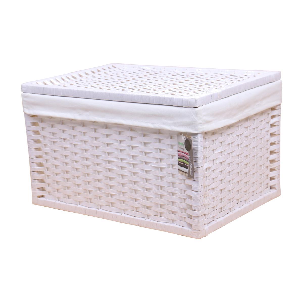 Featuring a lift top lid with metal hinges and fabric lining, this large trunk is crafted from woven white paper rope with a wooden frame and is available in a choice of sizes.