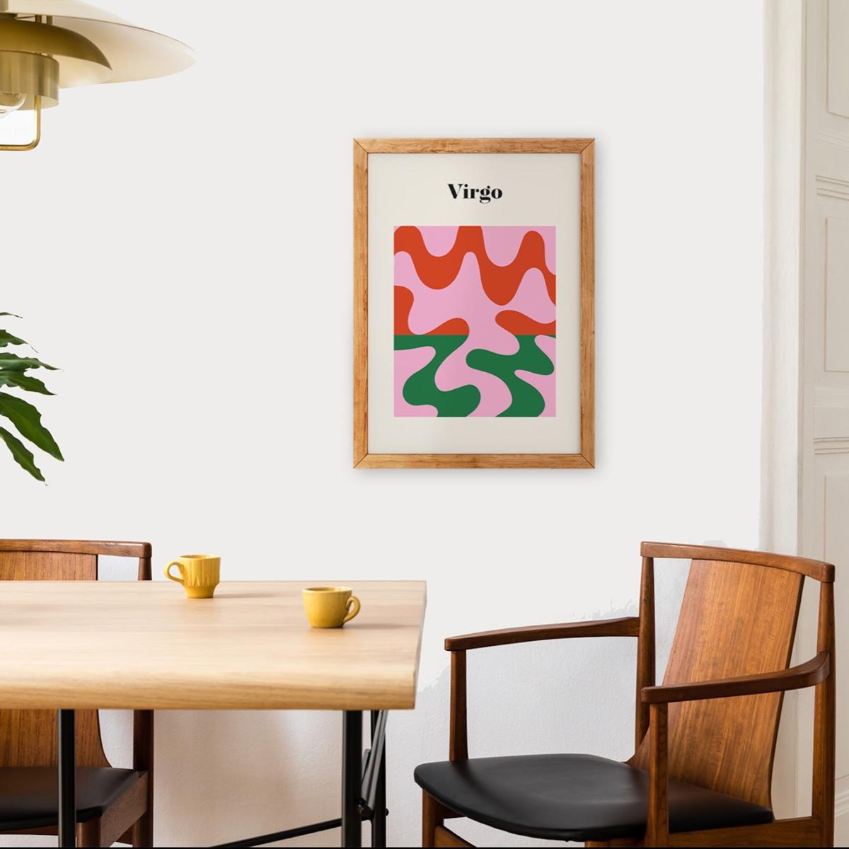 I love this star sign print for adding a pop of colour and personality to a space. It works particularly well in modern or eclectic interiors, where its vibrant reds, greens, and pinks can complement a pared-back colour palette or stand out as a statement piece. For styling, consider pairing it with minimalist furnishings to keep the focus on the artwork, or group it with other zodiac or abstract prints for a themed gallery wall. Placing it in a bedroom, home office, or living room with clean lines will bring a fresh, energetic vibe without overwhelming the room. Practical tip: frame it in a simple black frame to mirror its border, creating a cohesive look that enhances its bold colours.
