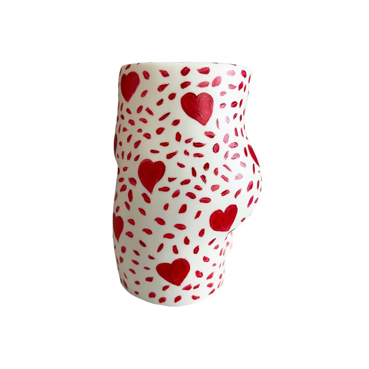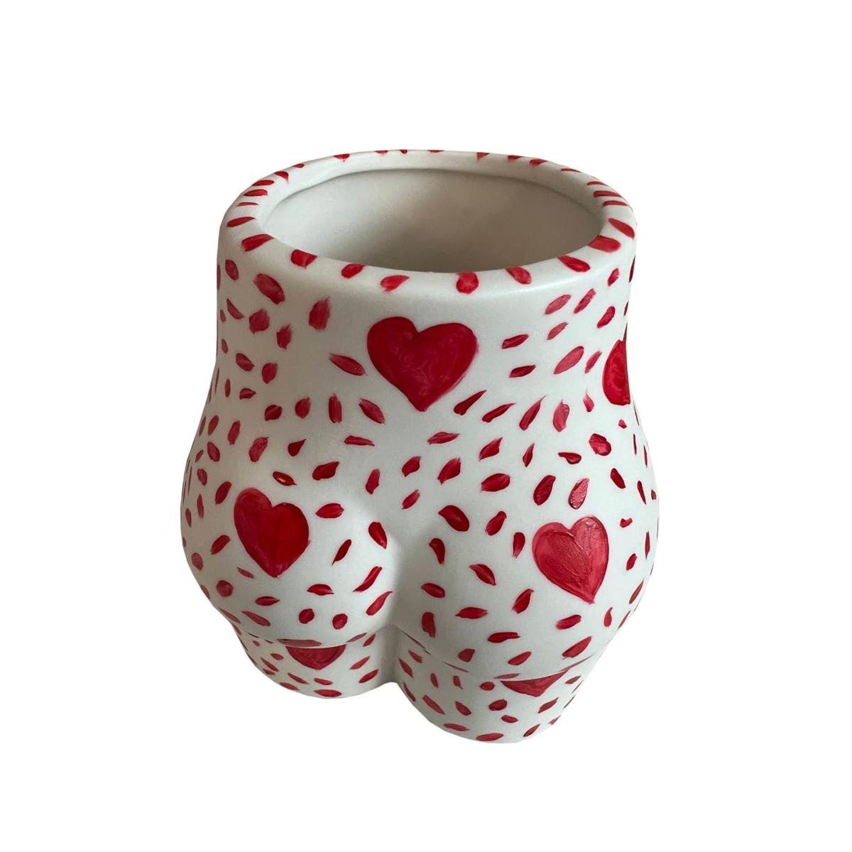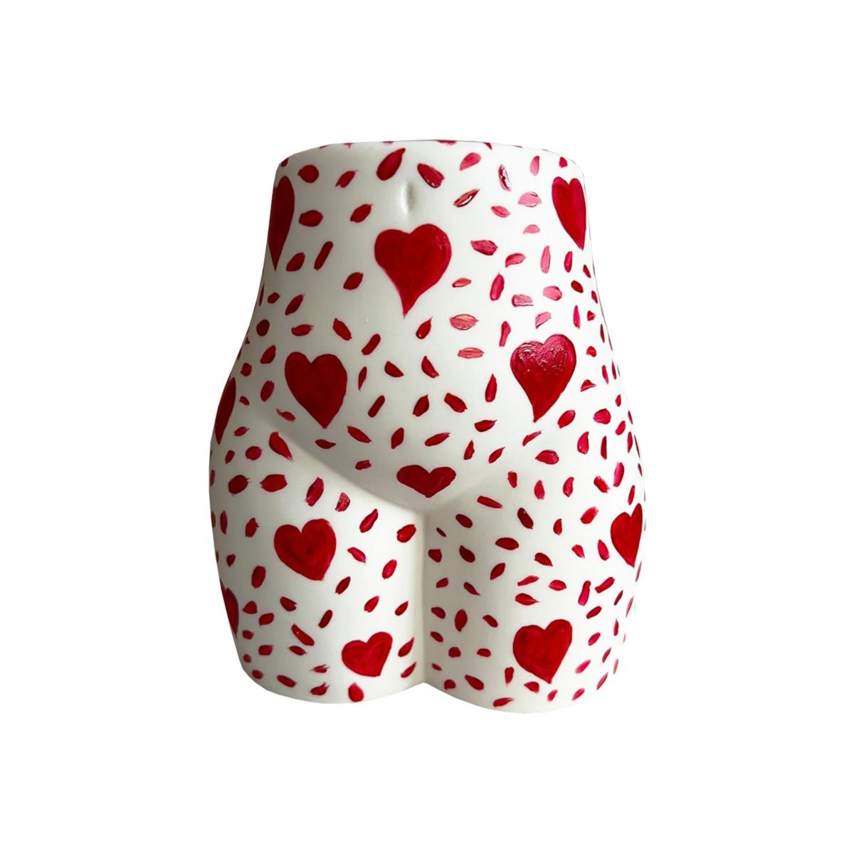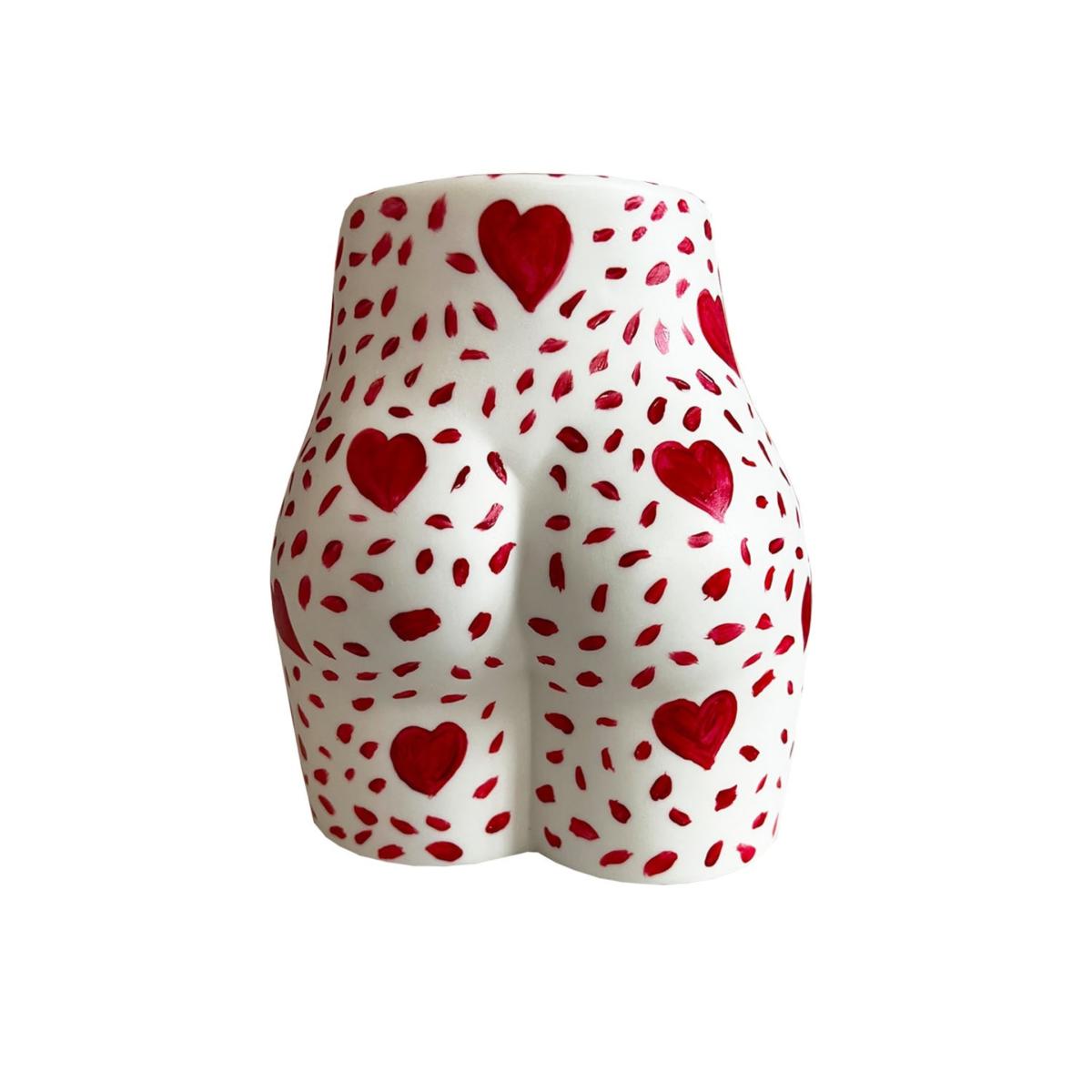 Hand-painted voluptuous booty vase, with hearts and leopard print all over in red. A sweet gift all year round, particularly valentines day. With a 7.5cm opening, a decent-sized plant can be planted or it can be used for stationary, fruit, or bits and pieces. A limited Edition piece.