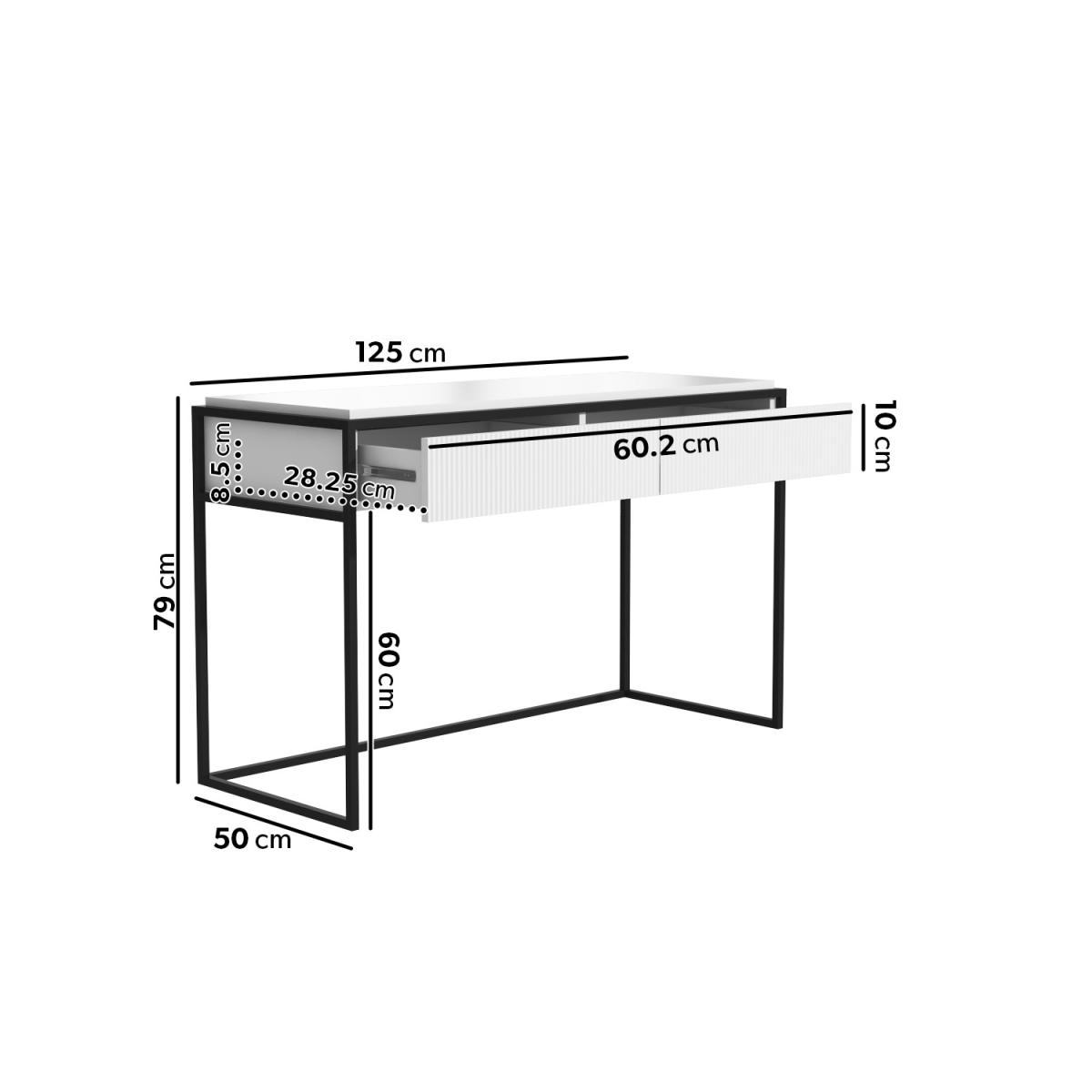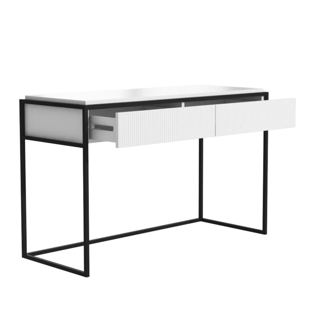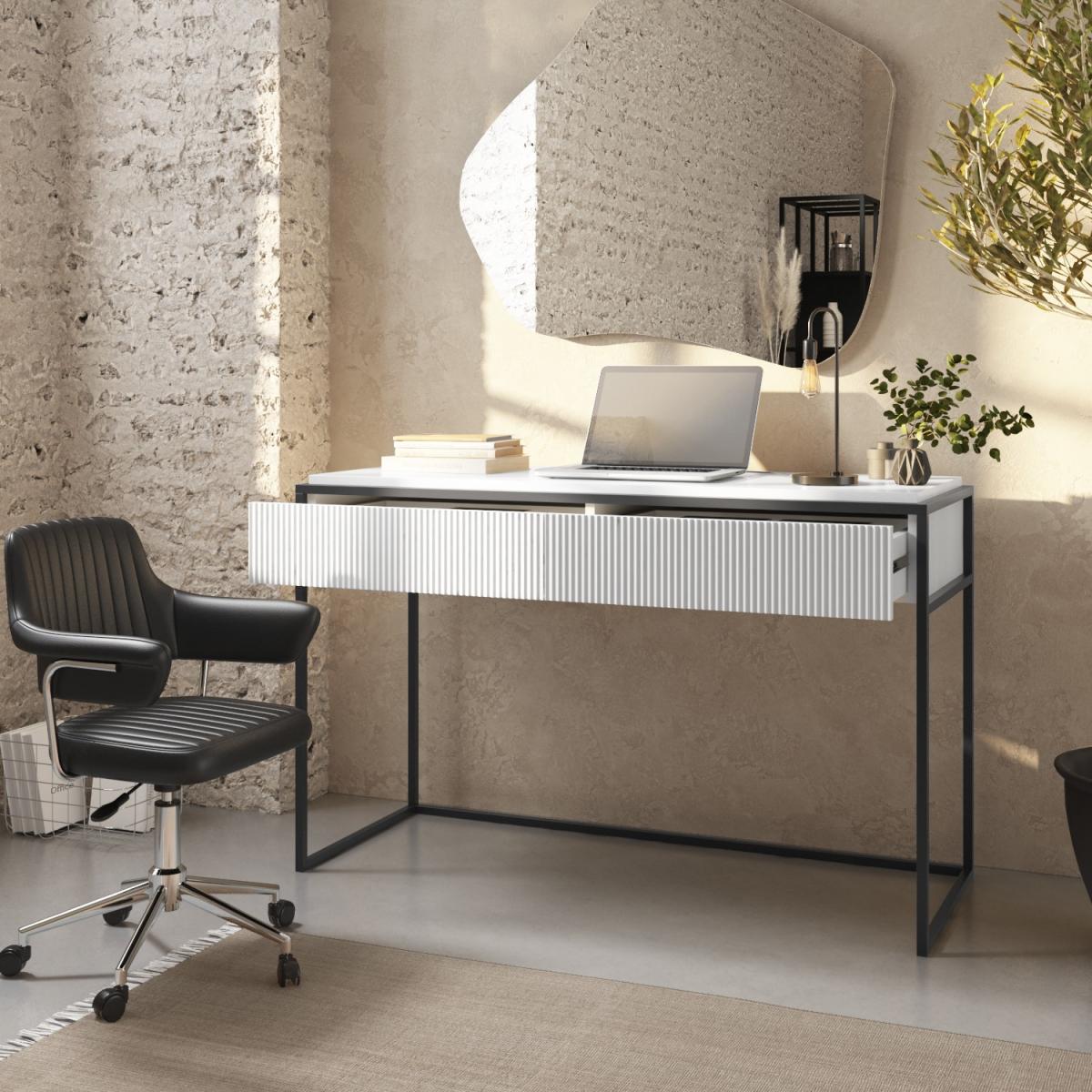I’m a fan of this ribbed-front white desk because its clean lines and slim black frame slot straight into Scandi, industrial or contemporary schemes without overwhelming the room. The subtle texture across the drawer front adds interest, while the single pull-out drawer keeps your workspace clutter-free. To style it, top the desk with a slim task lamp and a low-profile plant pot for a touch of greenery. Stash papers or stationery in the drawer, then anchor the area with a simple woven rug underneath. Pair with a black or charcoal upholstered chair to echo the frame, and keep cables hidden with an under-desk tray or adhesive clips for a neat finish.