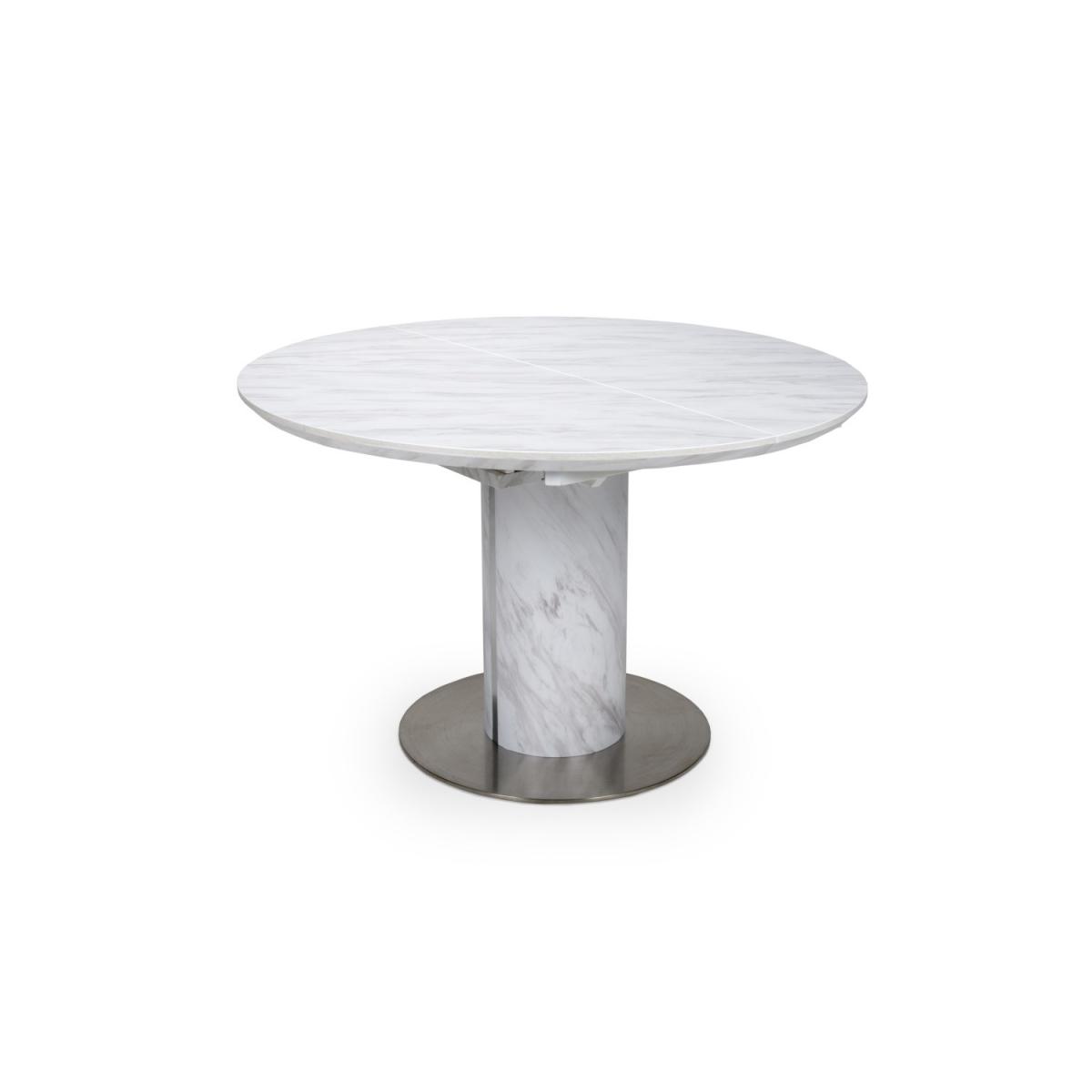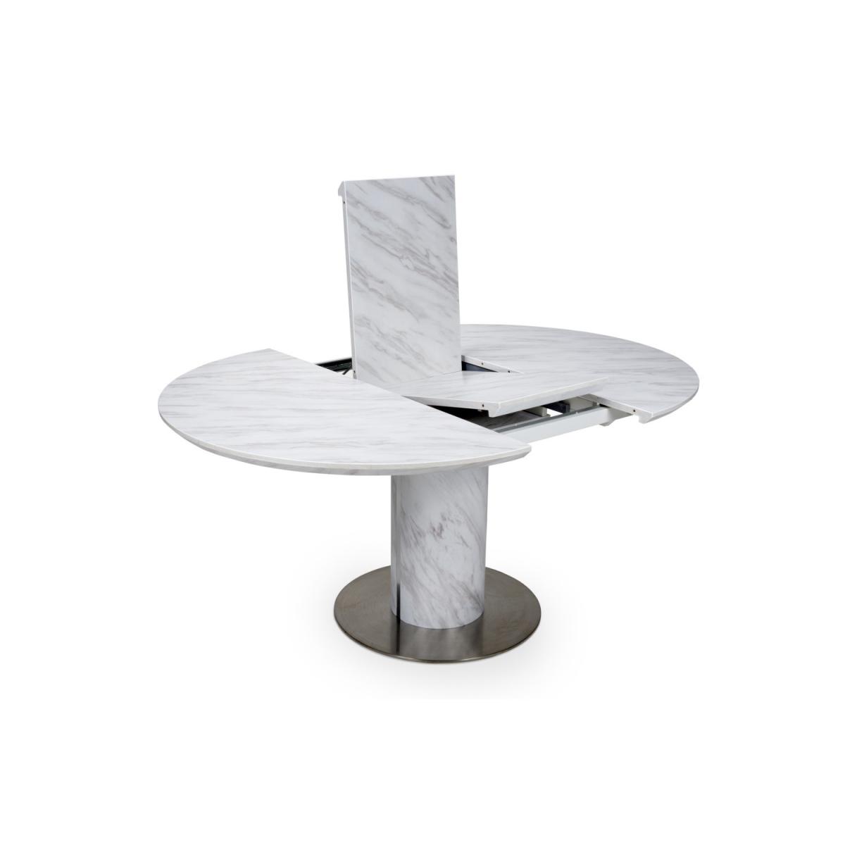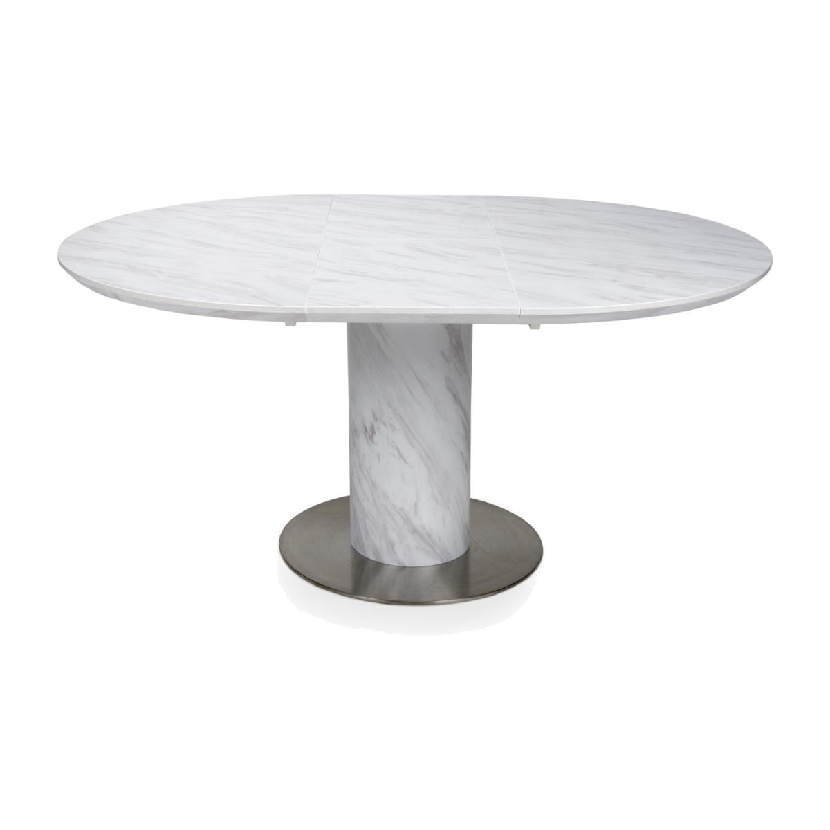 Dimensions:H76 x W120-160 x D120 cm The Etan marble effect extendable round dining table is the perfect table for entertaining. It features a durable, heat, scratch and stain resistant table top which is a must for today's busy homes. It has an easy glide mechanism making opening the butterfly extension very easy. The edges of the table are rounded for a more elegant feel. Features: Marble effect dining table Stainless steel base Melamine durable, easy clean, scratch & heat resistant surface Seats 6 people Butterfly design extending mechanism Assembly required