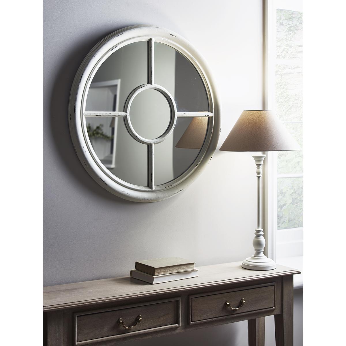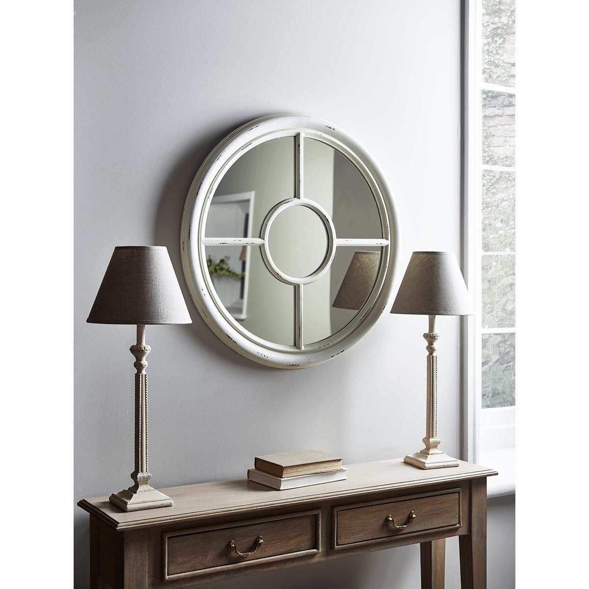 With a painted off-white, distressed frame and lovely round shape, our window mirror will make the perfect addition to your hallway or garden room. Inspired by an old chapel window, it also looks elegant over a mantelpiece.