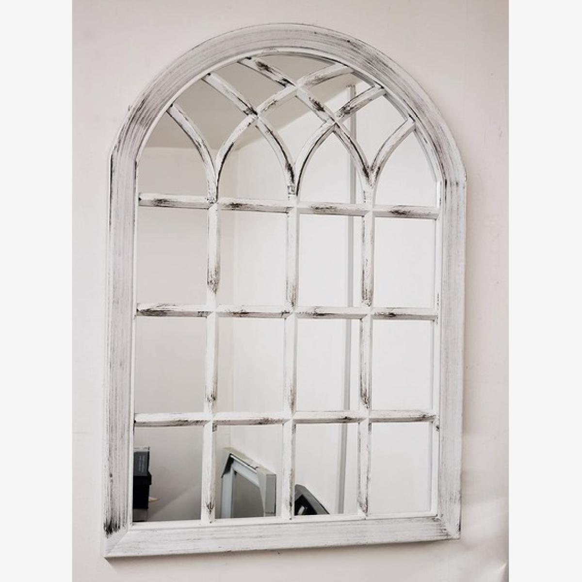 White Rustic Window Style Mirror. White Rustic Window Style Mirror. This Lovely Unique Style mirror Would be Stunning in a bedroom, or hallway and fit in with any colour scheme or decor Style. Gorgeous mirror with Rustic Detailing in the frame to Create an elegant look.