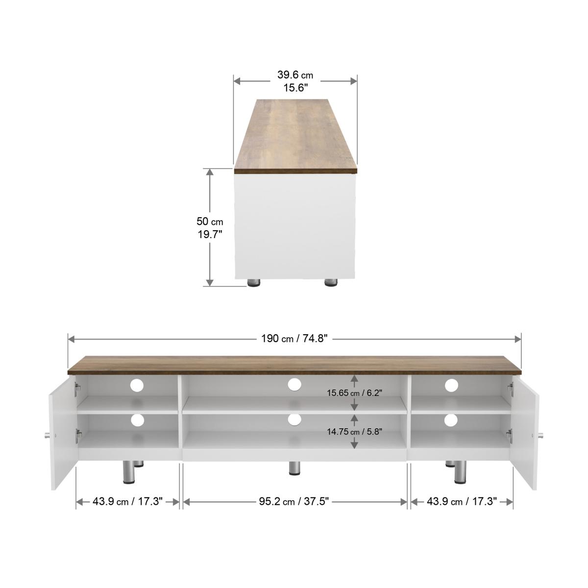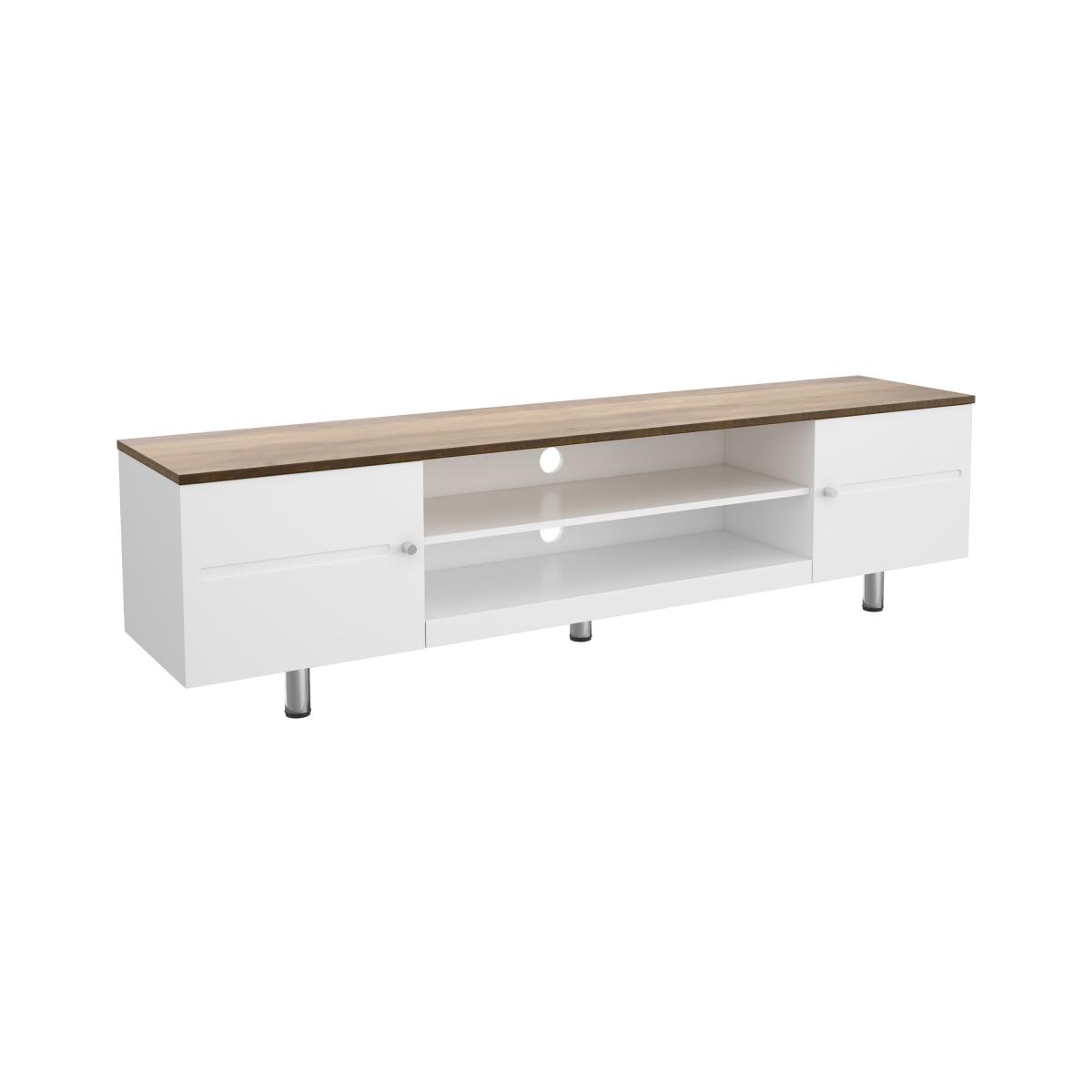 I’m a fan of this wide TV unit for its clean lines and simple wood-and-white finish, which immediately brightens a room without feeling fussy. Its low profile and combination of open shelves and concealed cupboards suit modern, Scandinavian or transitional interiors, giving you practical storage for media kit and cables. To style it, group a couple of slim houseplants or ceramic vases on the top alongside a small framed print, then tuck woven baskets into the open centre shelves for books or remotes. Soft rugs and cushions in natural tones will help balance the crisp look and keep the space feeling welcoming.