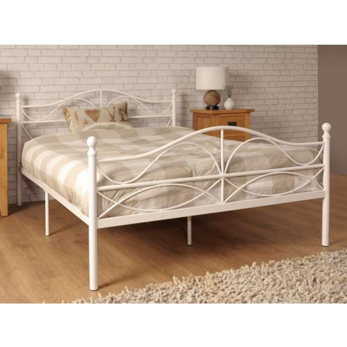 This French-inspired designer metal bed frame is available to purchase in either 3ft single, 4ft6 double or 5ft king size and sold in a white finish. The frame features a unique curved design on the head and footboard. The study designer metal frame is supported by a sprung slatted base which provides both comfort and support and adds to the high head end and footboard features that also support the frame.