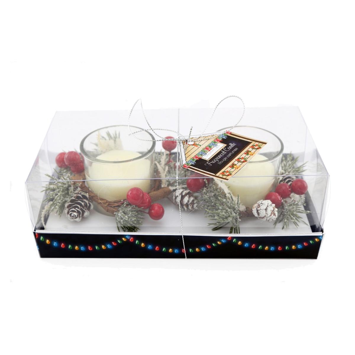 A set of Two glass candle pots including a white candle with the scent cinnamon spice. An attractive centre piece or decoration for any Christmas table. Two glass pots each with a wreath of berries, leaves and pine cones dusted with artificial snow.. These are gift boxed.