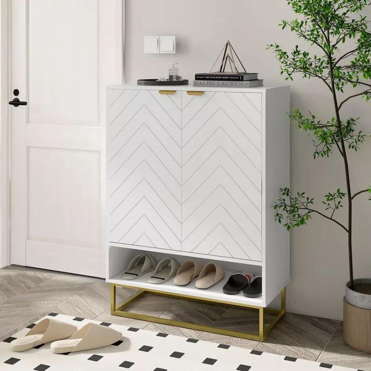 Add a touch of style to your entryway with this white shoe cabinet featuring two chevron-patterned doors. Its chic design provides an elegant way to store shoes while keeping them neatly out of sight. Perfect for modern interiors, this cabinet is both functional and fashionable.