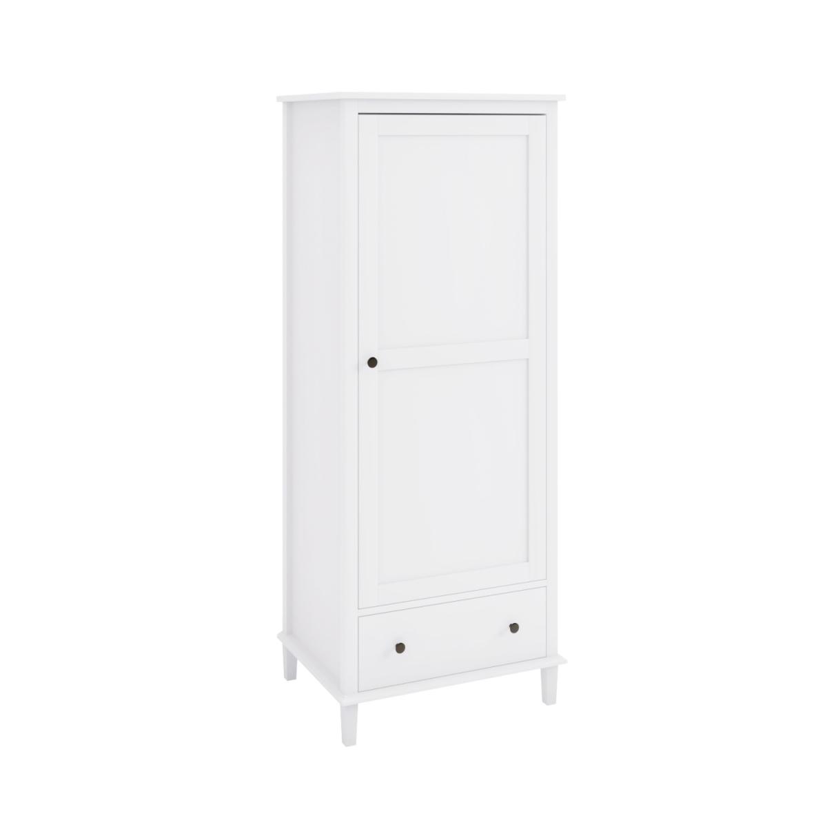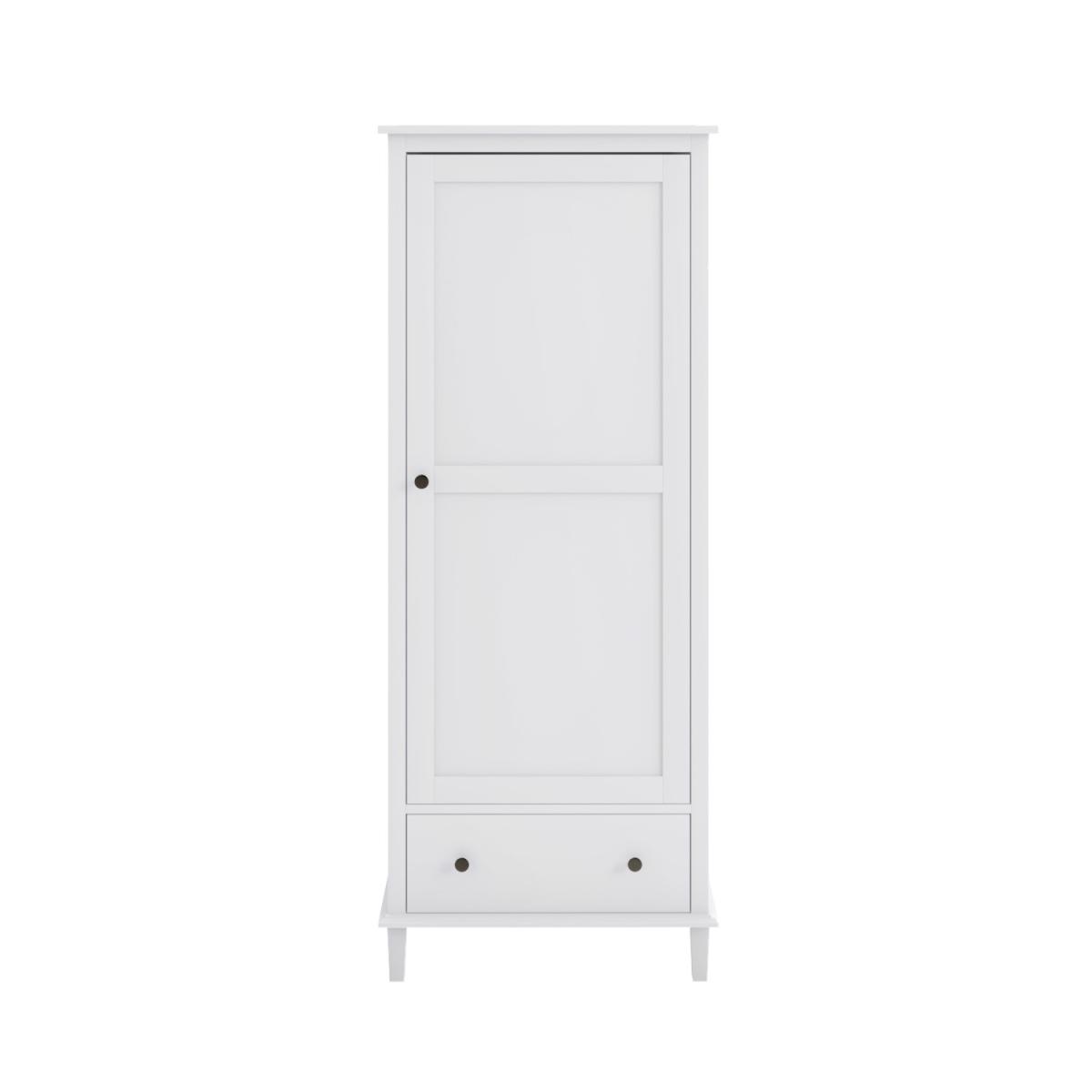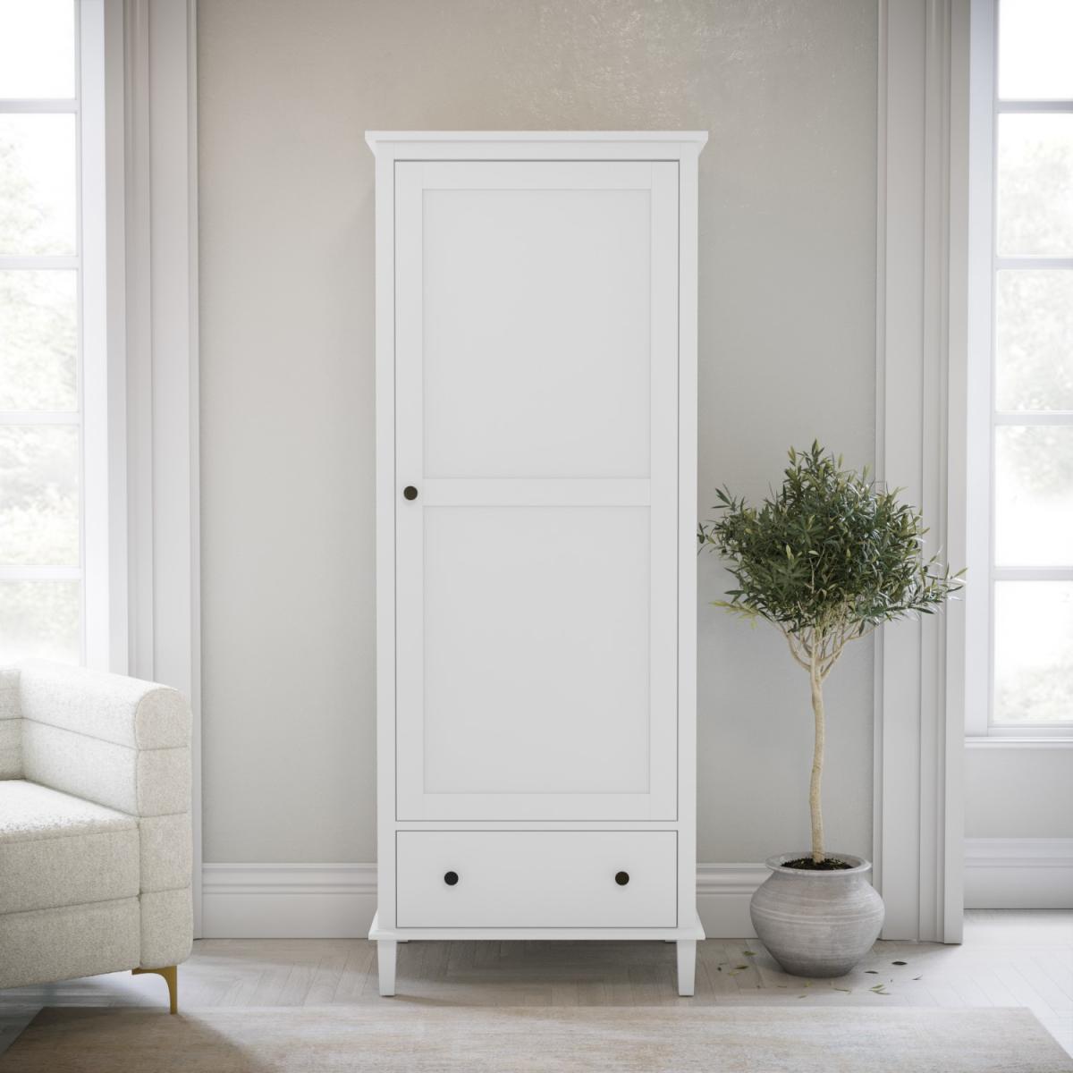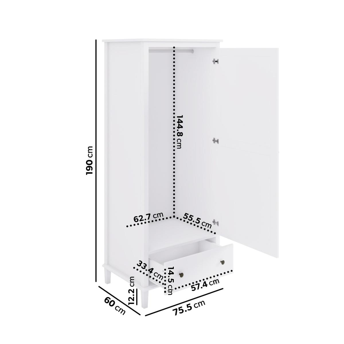All about me Enhance your bedroom with this striking single wardrobe. With its clean lines and white painted finish, it's sure to complement any bedroom decor. The doors open to a metal hanging rail to organise your clothes, and the bottom drawer is ideal for storing shoes or folded items. Style it with the other pieces from the Marlowe bedroom furniture collection to complete the look. Need to know Product dimensions:W75.5 x D60 x H190 cm Base to floor height: 12.2cm Inner drawer dimensions:W57.4 x D33.4 x H14.5 cm Hanging space dimensions:W62.7 x D55.5 x H144.8 cm Product weight: 39.1kg Number of drawers: 1 Colour: White Finish: Painted and antique brass (handles) Material: Solid pine wood (front, sides, top), MDF (back, drawer bases) and metal (handles and runners) Assembly required: Yes Packaging dimensions: Box 1: W87.4 x D69.6 x H8.9 cm / Box 2: W187.6 x D71.9 x H9.8 cm Packaging weights: Box 1: 14.3kg / Box 2: 29.6kg
