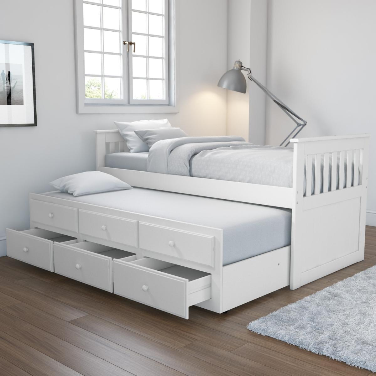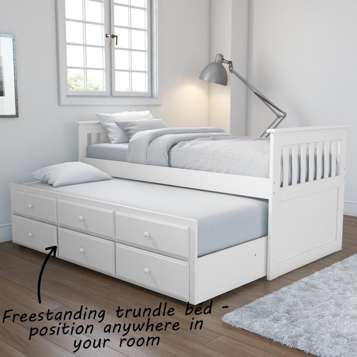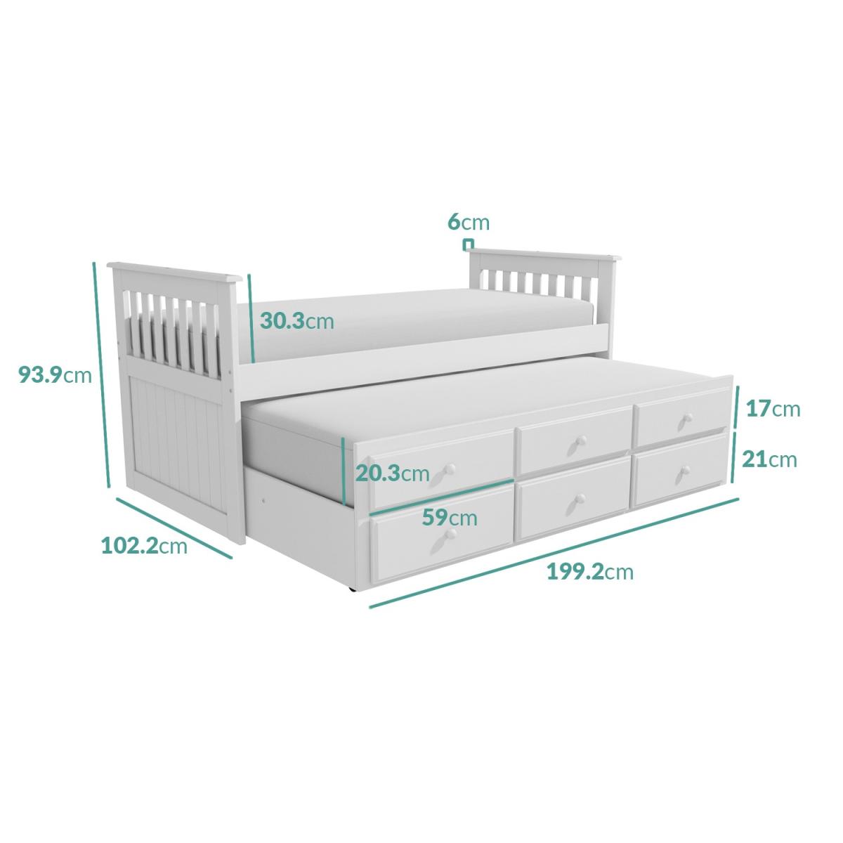 Features we love Simple design in pure white is easy to coordinate Space saving – two beds in the space of one. Use the top three dummy drawers to pull out extra bed. Bottom drawers help keep the clutter to a minimum Trundle can be positioned anywhere in the room Castors make the trundle easy to manoeuvre All about me. This cleverly designed trundle bed is the perfect space-saving solution for last minute sleepovers. Just beneath its stylish pine frame hides a second single bed that slides out when you need it and slides back when you don't. The second bed is mounted on easy glide castors which means you have the freedom to pull it all the way out and position it anywhere in your room. The trundle bed sits discreetly behind three storage drawers and three dummy drawers which cleverly act as handles for quick and easy access to the bed whilst maintaining a neat exterior. The three storage drawers are great for keeping your extra bedding and pillows out of sight but clost at hand when needed. The beds both have a durable build made from solid pine and MDF. The simple styling along with the white pine finish makes it easy to coordinate in both modern and traditional homes. Both have slatted bed bases for comfortable mattress support. You will need to purchase two mattresses separately and when choosing your mattress for the trundle make sure not to exceed a thickness of 19cm as any larger and it will struggle to fit beneath the main bed. The bed will require a little self-assembly but no special tools are required and all fixtures and fittings are included alongside a step by step manual. Need to know. Bed dimensions. W199.2 x D102.2 - 192.6 x H93.9 cm Drawers dimensions. W49.1 x D46.7 x H13.3 cm Trundle bed height. 38 cm Max mattress depth for trundle. 19 cm Finish. White lacquer Material. Solid pine and MDF Assembly required. Yes More info Always have a spare bed at the ready saves space whilst not in use. Ideal for children's rooms and guest rooms. Sitting on castors the trundle simply glides out when needed. Both beds are a standard UK single (3ft/90x190cm)Hardwearing MDF and solid pine build. Mattresses are not included and need to be purchased separately. Do not exceed a mattress thickness of 19cm for the trundle bed as it will struggle to fit beneath. Slatted bed base provide comfortable mattress support.