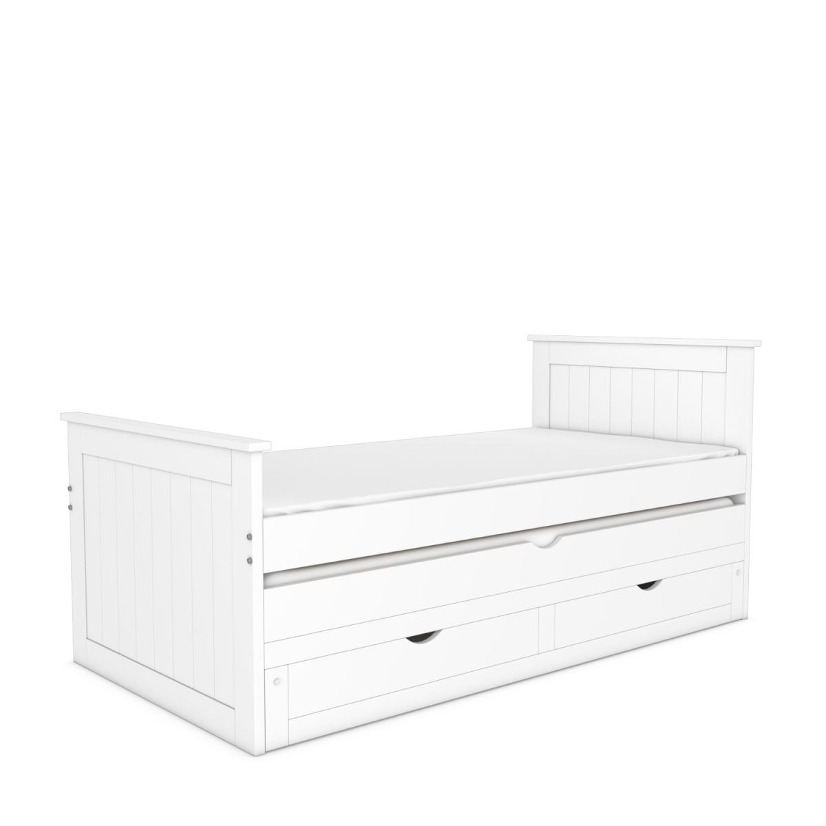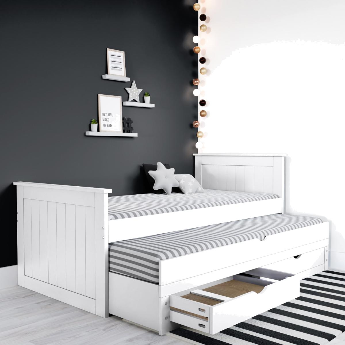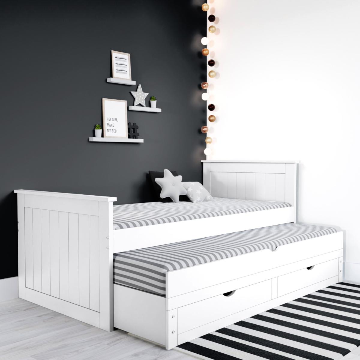 Classic design with handy space-saving trundle bed Unisex crisp white finish will suit any bedroom décor Trundled bed can be positioned anywhere in the room Ample storage for essentials with two underbed drawers Both beds fit a standard UK single mattress (3ft) Sanders captain bed is also available in Pale Grey Need to know Mattress size: Standard UK single (3ft) Max supported weight (excluding mattress): 80kg Max mattress depth: 16cm Colour: White Finish: Painted Material: Solid pine wood and MDF Bed slats: Solid pine wood Mattress included: No Assembly required: Yes