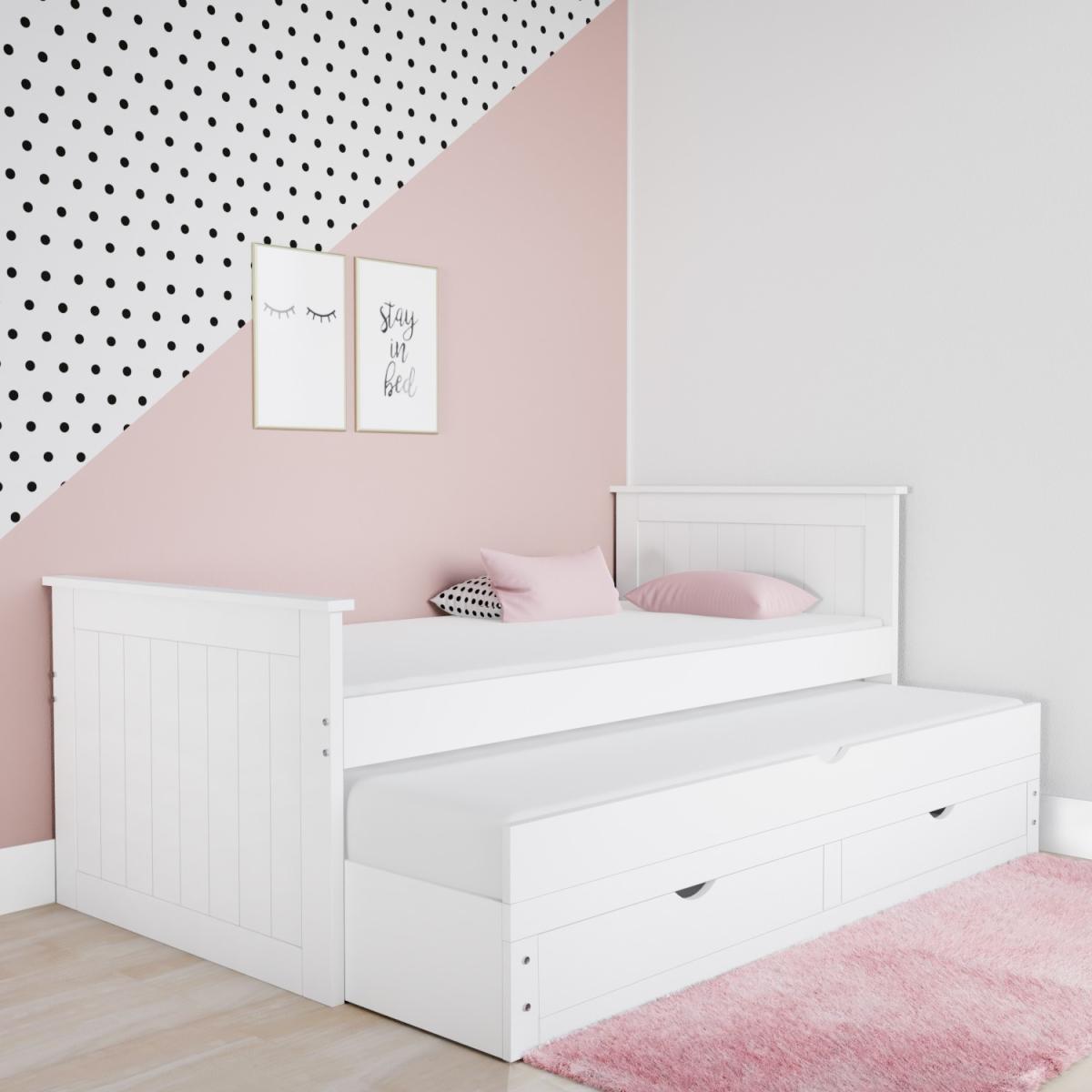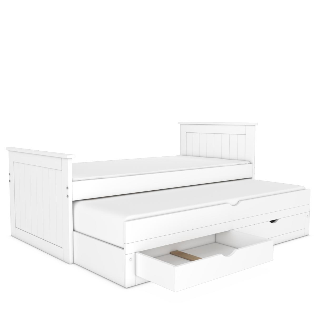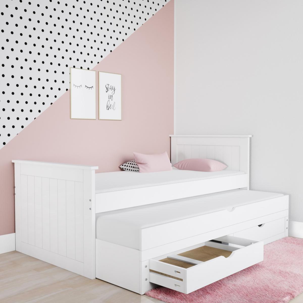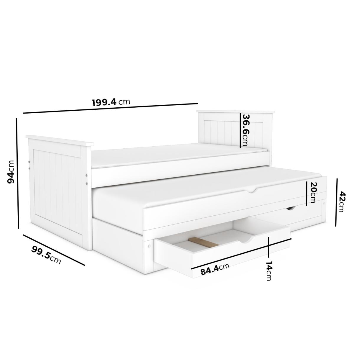 Classic design with handy space-saving trundle bed Unisex crisp white finish will suit any bedroom décor Trundled bed can be positioned anywhere in the room Ample storage for essentials with two underbed drawers Both beds fit a standard UK single mattress (3ft) Sanders captain bed is also available in Pale Grey Need to know Mattress size: Standard UK single (3ft) Max supported weight (excluding mattress): 80kg Max mattress depth: 16cm Colour: White Finish: Painted Material: Solid pine wood and MDF Bed slats: Solid pine wood Mattress included: No Assembly required: Yes