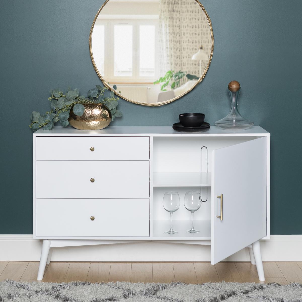 The perfect addition to your home, this white Foster sideboard helps you to hide away clutter and unsightly essentials. Not only is it convenient, but it is also a great looking piece, which offers a stylish touch to any room. Crafted from durable MDF, this flat panel sideboard features three large drawers, a side cabinet with adjustable shelving, and a cable management function at the back.