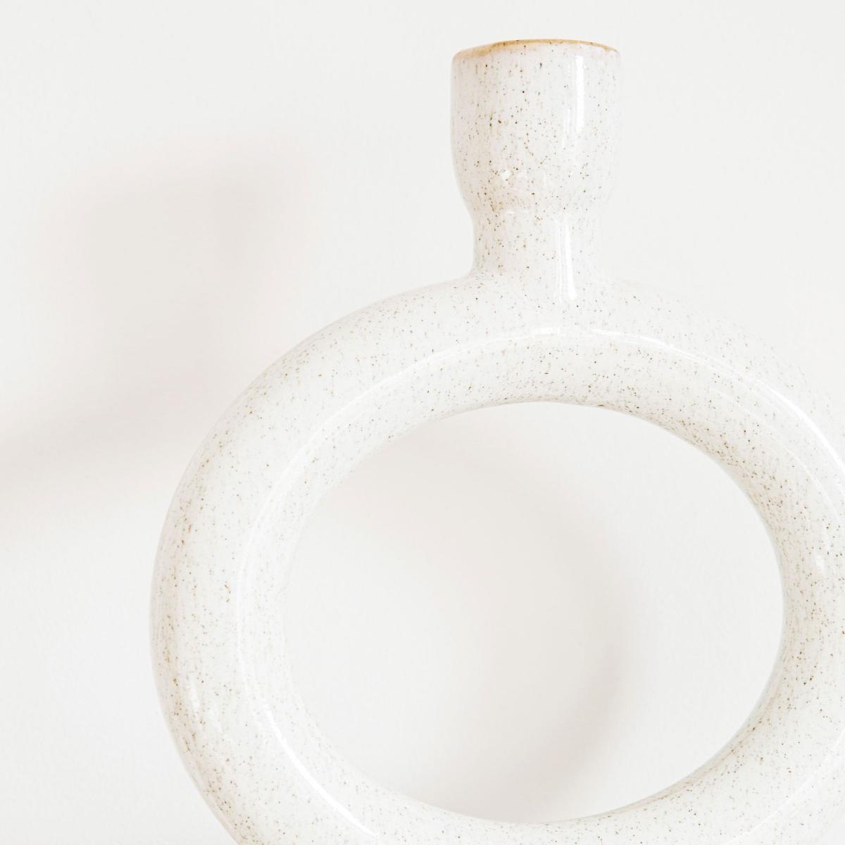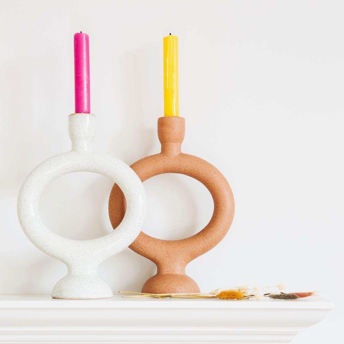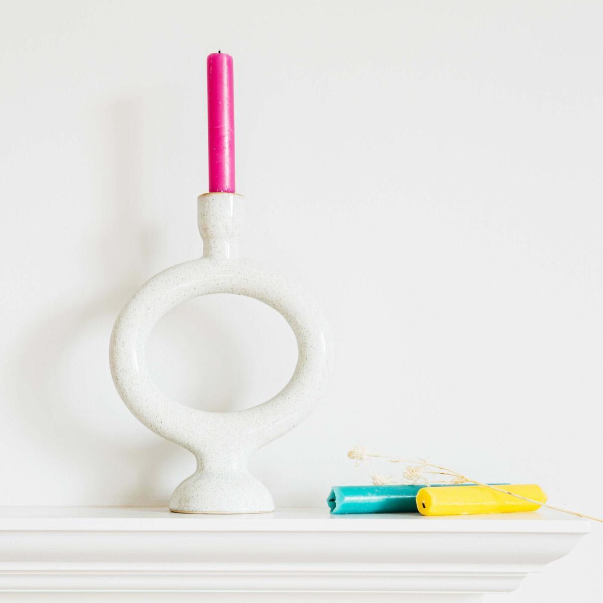 I love this white stone circle candle holder for its modern, sculptural form that adds visual interest without overwhelming a space. It works particularly well in minimalist or Scandinavian interiors where clean lines and simple shapes are key, and it can also serve as a statement piece on a console or dining table. For styling tips, try pairing it with neutral-toned candles for a cohesive look, or experiment with contrasting colours to make it pop. It's versatile enough to be used both with taper candles or smaller pillar candles, making it adaptable for different occasions or moods. Keep it as a standalone feature or group with other textured or geometric decorative objects for a curated, contemporary vibe.
