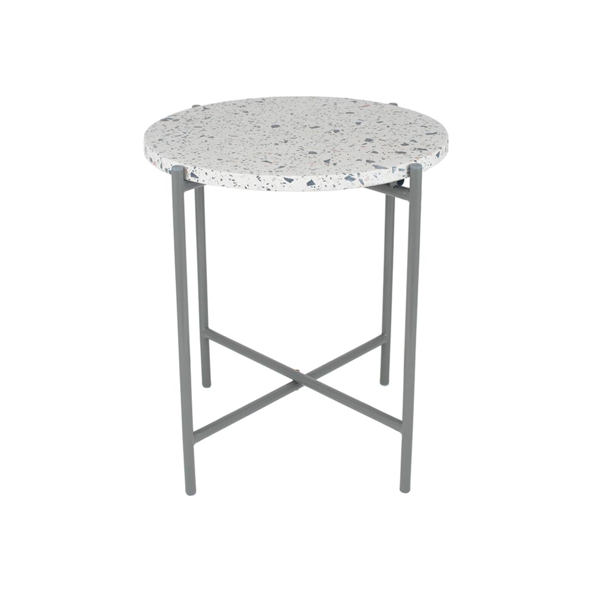 Terrazzo Table Large in White. Height: 48cm Width: 48cm Depth: 50cm The Terrazzo table is a stylish addition to any home. With it's smoothwhite composite top, scattered with monochrome chips, contrasting against the mattwhite metal legs. This table adds a modern touch and serves as a functional focal point in your home. Easily foldable to suit any situation and any room.