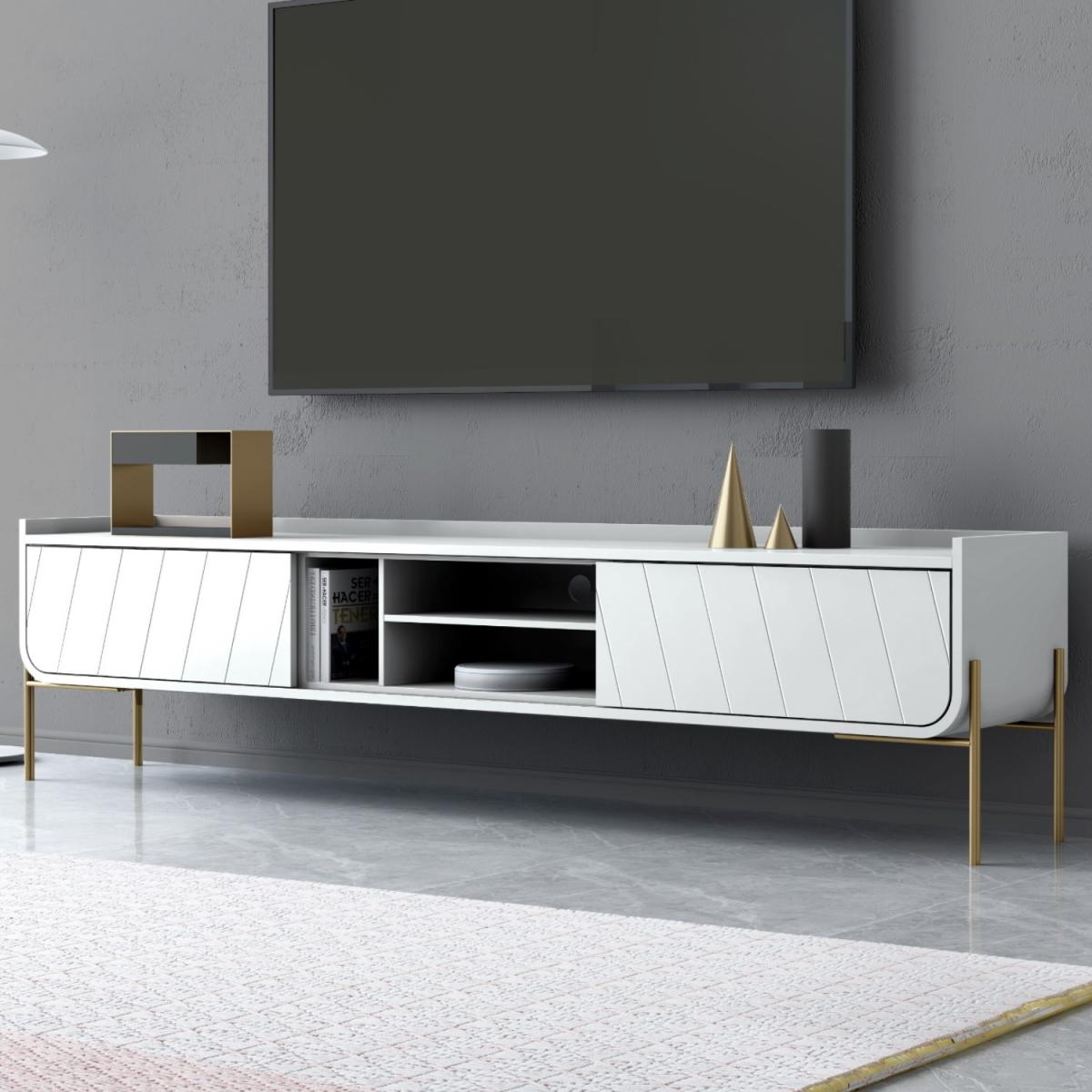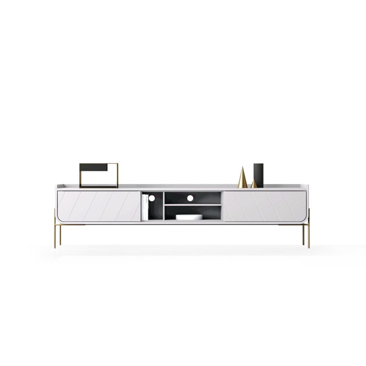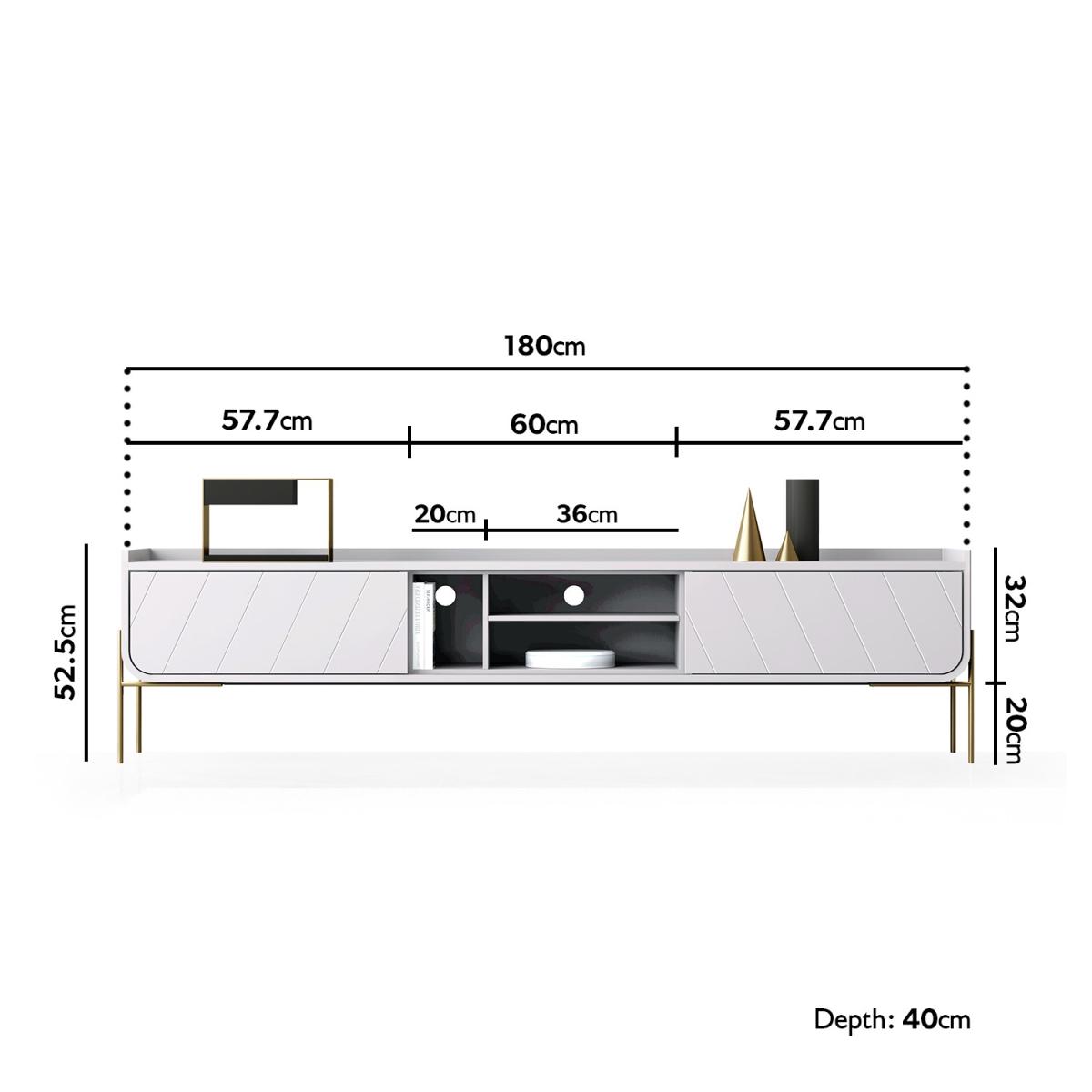 Features we love Contemporary TV unit with concealed storage. Features cut out inlaid detailing on the door fronts. Brushed gold legs complement the dark grey finish. Both open and closed storage for all your essentials. Each door is fitted on a metal runner and slides open. Minimal assembly required simply attach the legs. Need to know Dimensions Dimensions. H52.5 x W180 x D40 cm Open shelves dimensions (left). H18 x W20.4 x D36cm Open shelves dimensions (top right). H11 x W20.4 x D36cm Open shelves dimensions (bottom right). H10.6 x W20.4 x D36cm Closed shelving dimensions. H18 x W56 x D36cm. More info Weight. 52.5kg Colour. White with gold legs Finish. Painted Material. MDF plywood stainless-steel and premium hardware Construction. Metal runners for sliding doors Max Weight. This TV unit will hold up to 30kg Assembly required. Yes - just the legs..