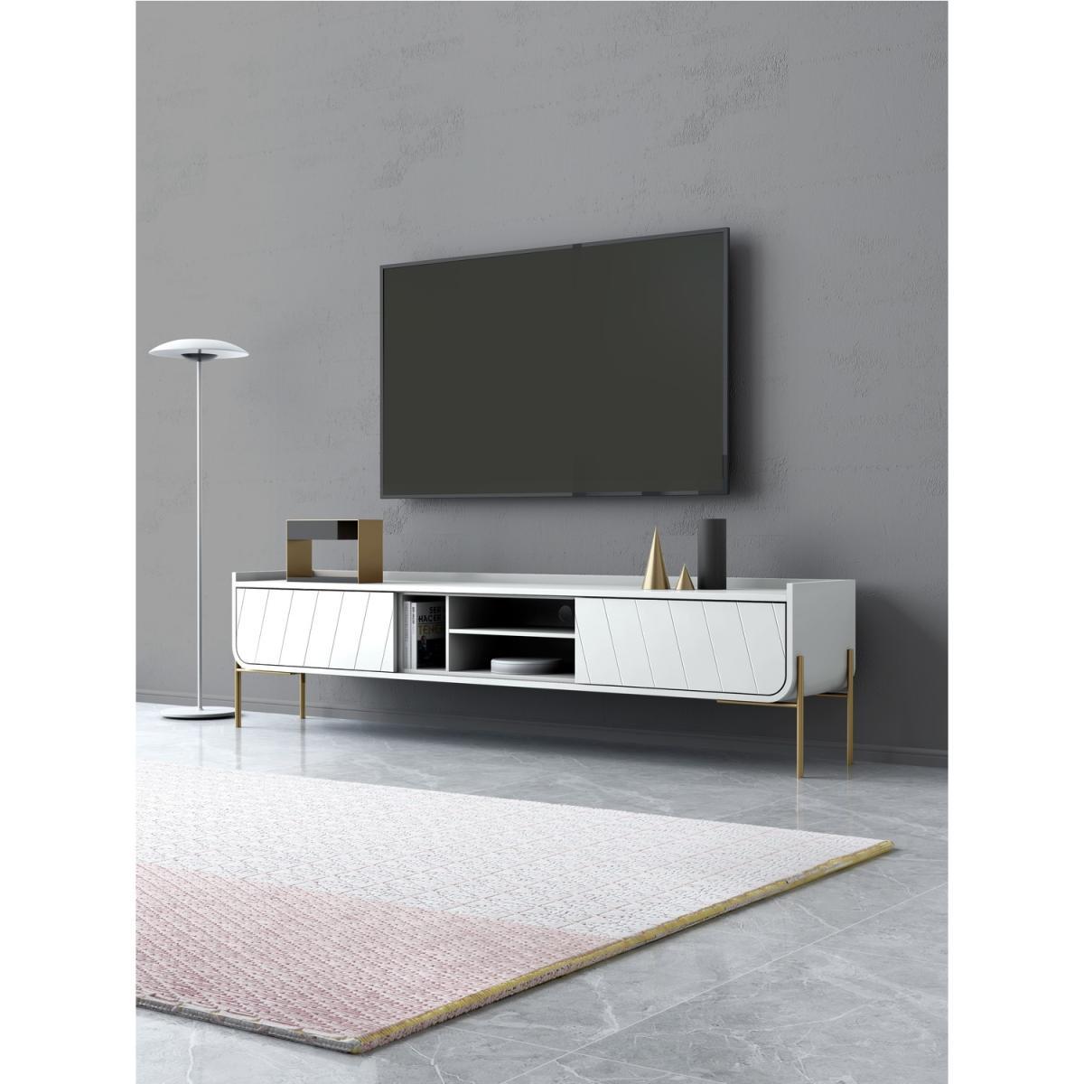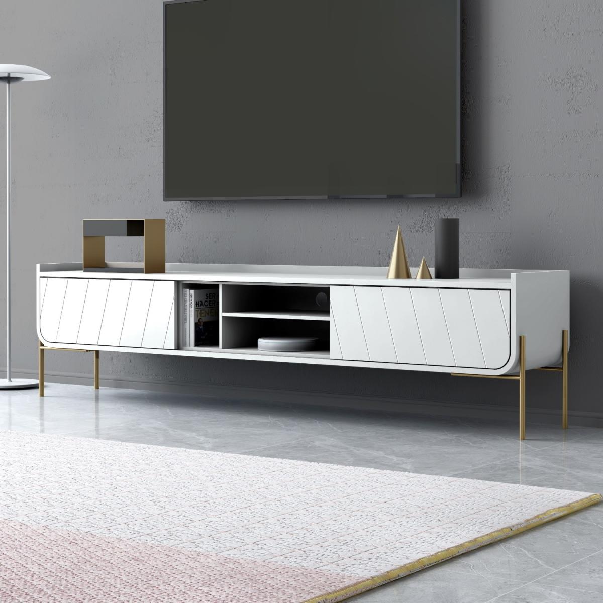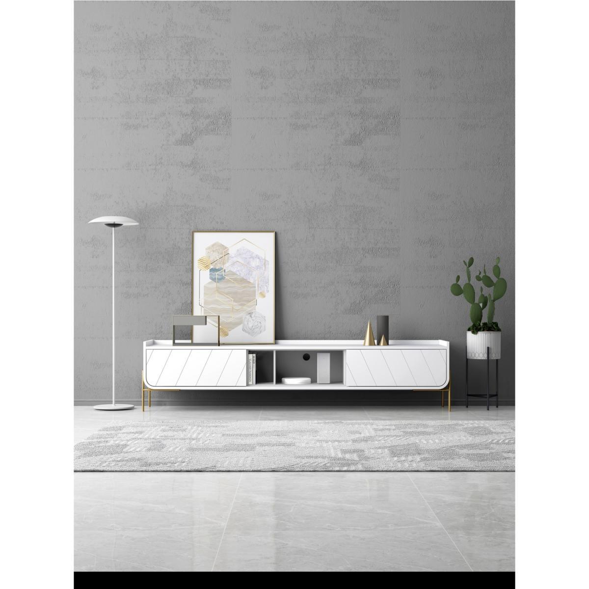 Features we love Contemporary TV unit with concealed storage. Features cut out inlaid detailing on the door fronts. Brushed gold legs complement the dark grey finish. Both open and closed storage for all your essentials. Each door is fitted on a metal runner and slides open. Minimal assembly required simply attach the legs. Need to know Dimensions Dimensions. H52.5 x W180 x D40 cm Open shelves dimensions (left). H18 x W20.4 x D36cm Open shelves dimensions (top right). H11 x W20.4 x D36cm Open shelves dimensions (bottom right). H10.6 x W20.4 x D36cm Closed shelving dimensions. H18 x W56 x D36cm. More info Weight. 52.5kg Colour. White with gold legs Finish. Painted Material. MDF plywood stainless-steel and premium hardware Construction. Metal runners for sliding doors Max Weight. This TV unit will hold up to 30kg Assembly required. Yes - just the legs..