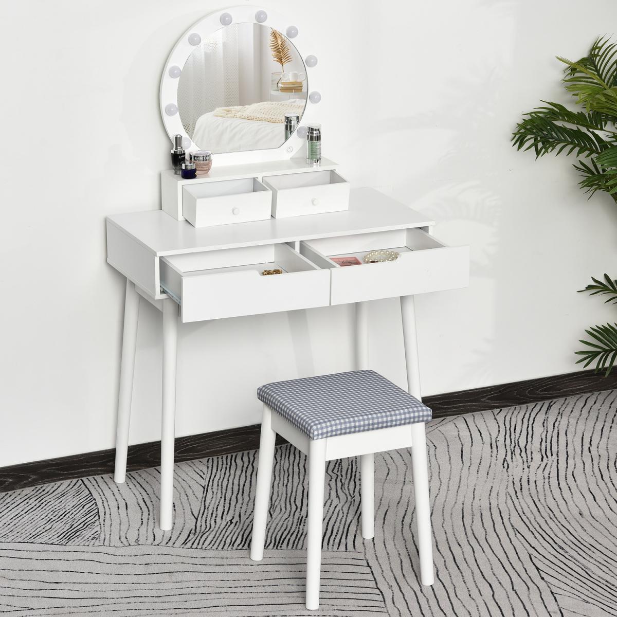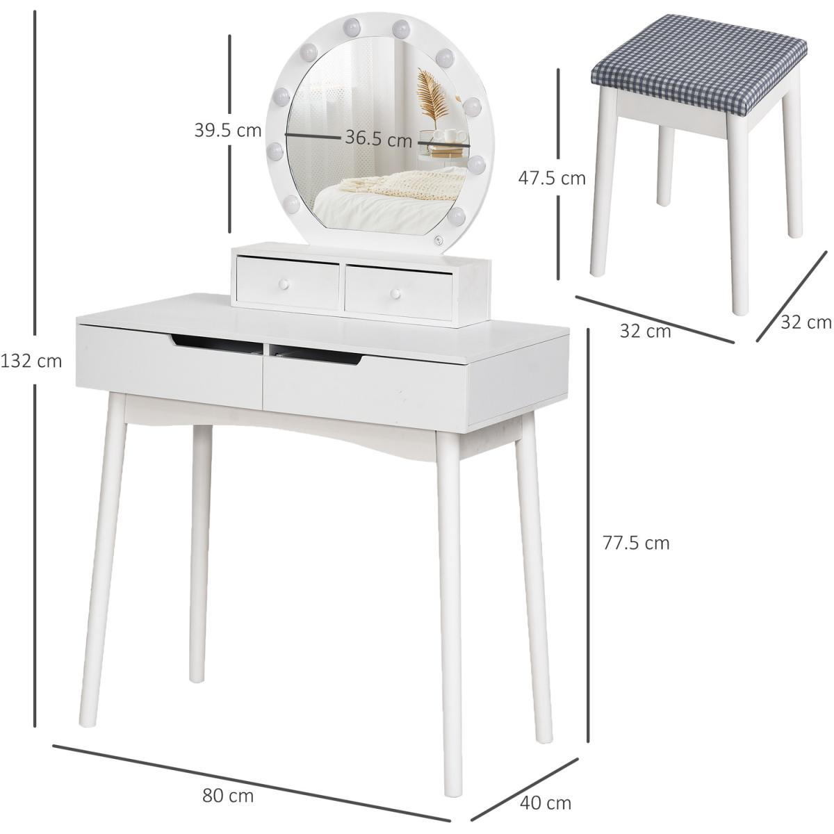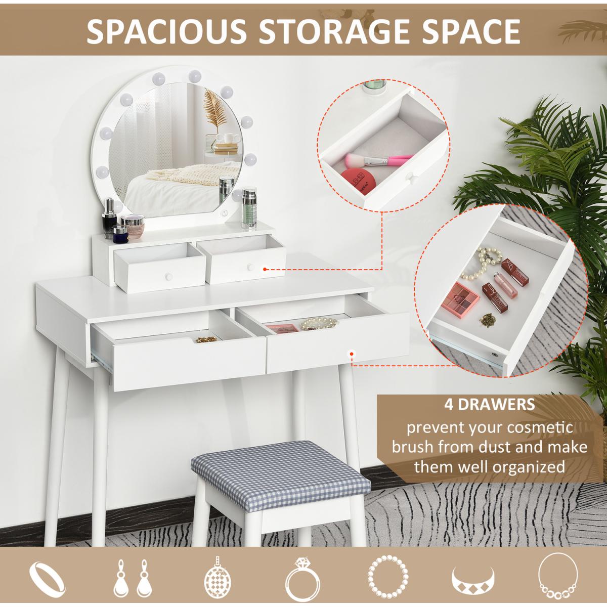 This HOMCOM Dressing table set is a great addition to any bedroom, comes with 4 drawers to keep jewellery, cosmetics or other items in order. A large mirror with LED lights makes your makeup more convenient, making it an ideal place for you to get ready. The set is completed with a matching comfortable stool, this elegant and concise styled set is perfect for any bedroom and decor.