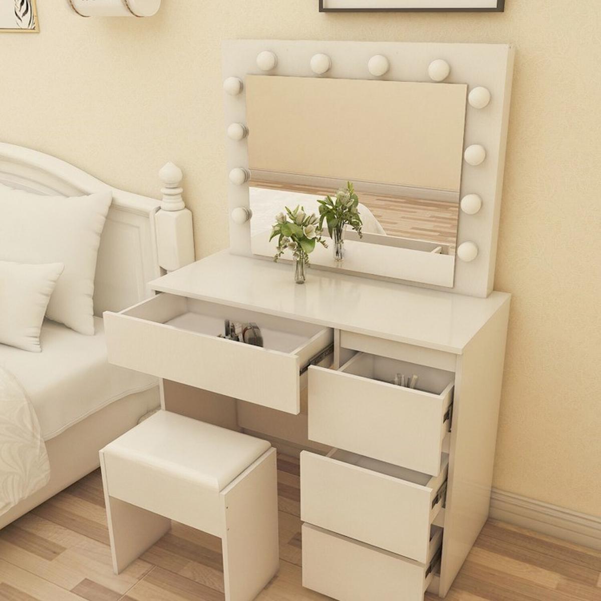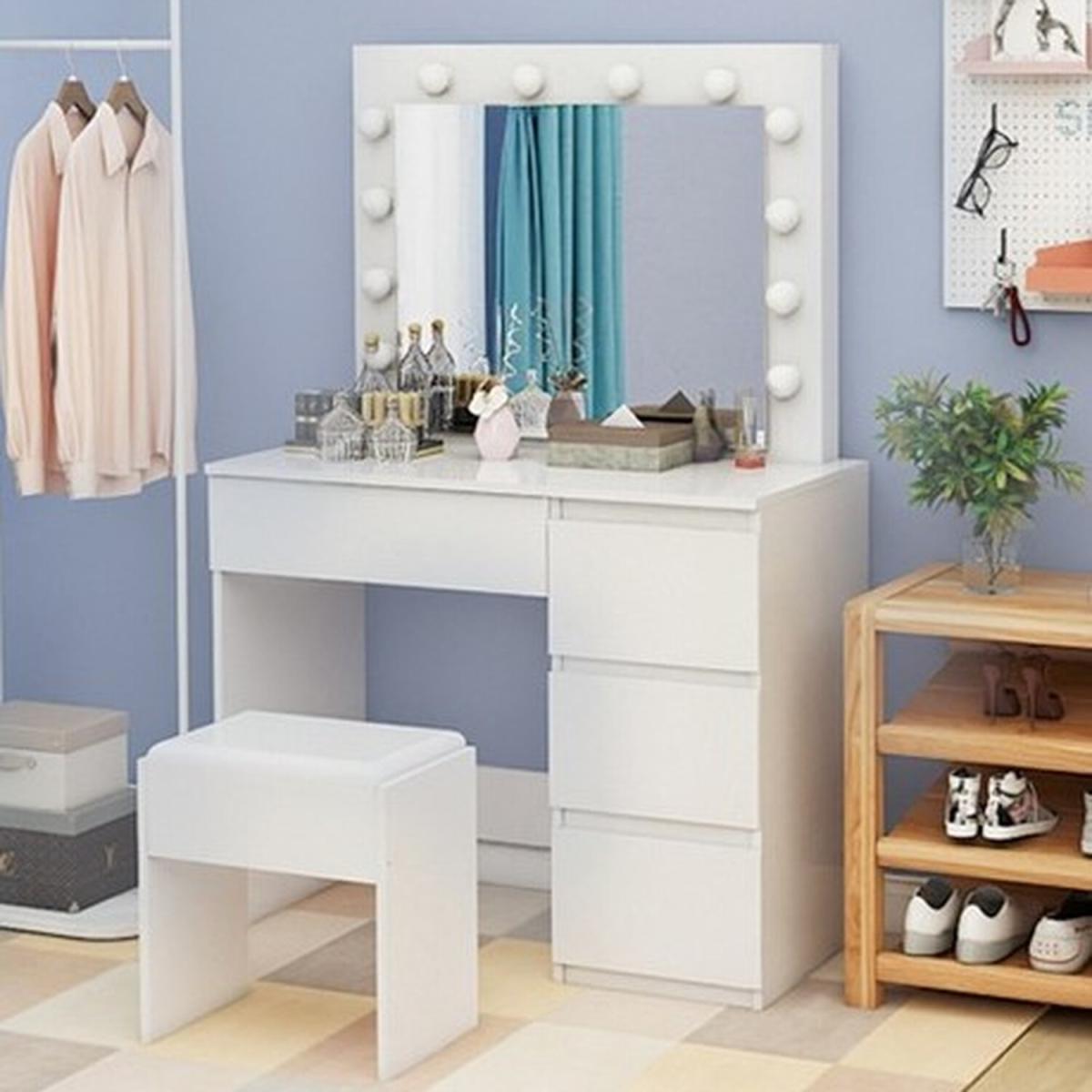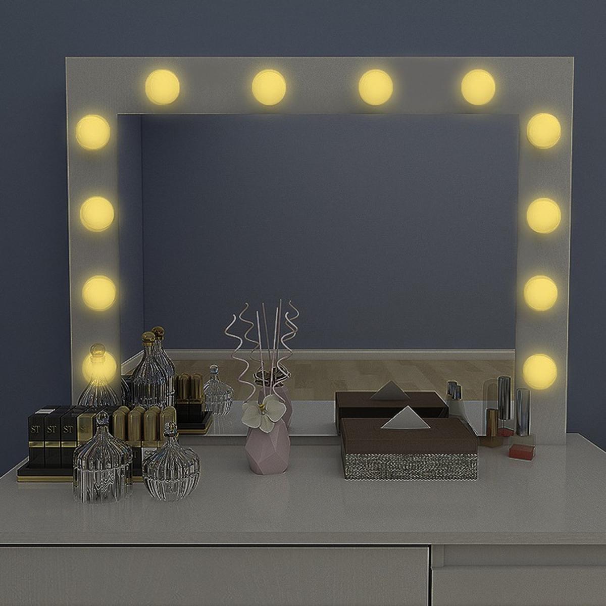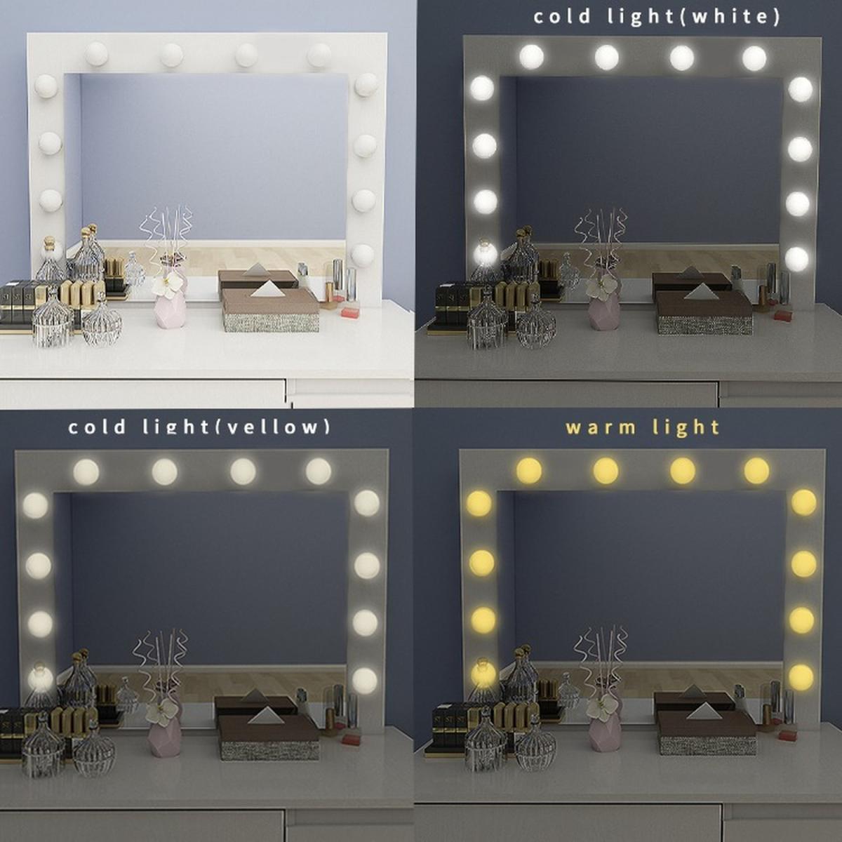 Transform your bedroom with this stunning dressing table set with padded stool. This beautifully designed dressing table was created with practicality and style in mind, to add glow and warmth to your bedroom. It has a generous large mirror with stunning Hollywood bulbs. Can change to 3 different tones. At a touch of a button, you can change the lighting to suit your mood and your needs. Comes with 3 classic handleless drawers to store away your jewellery, makeup and little treasures.
