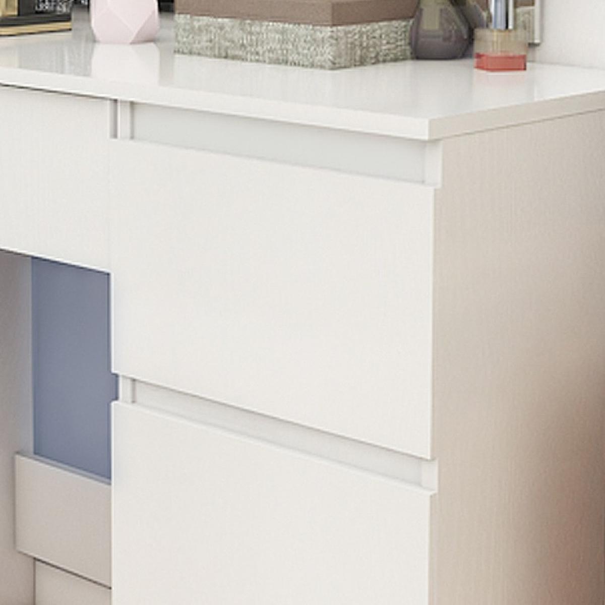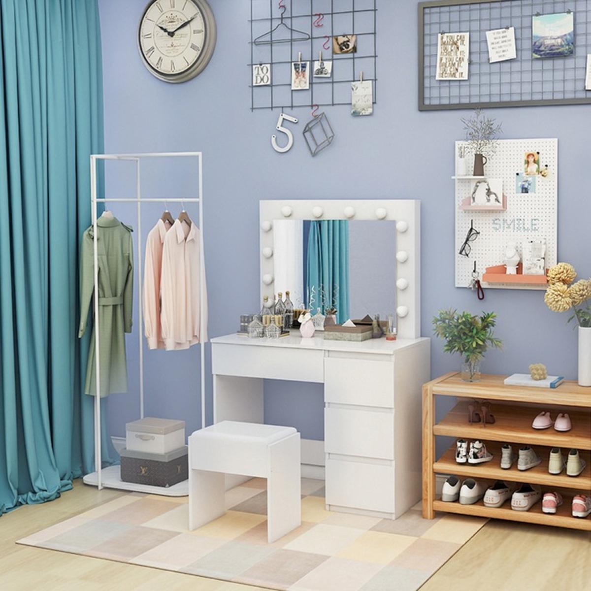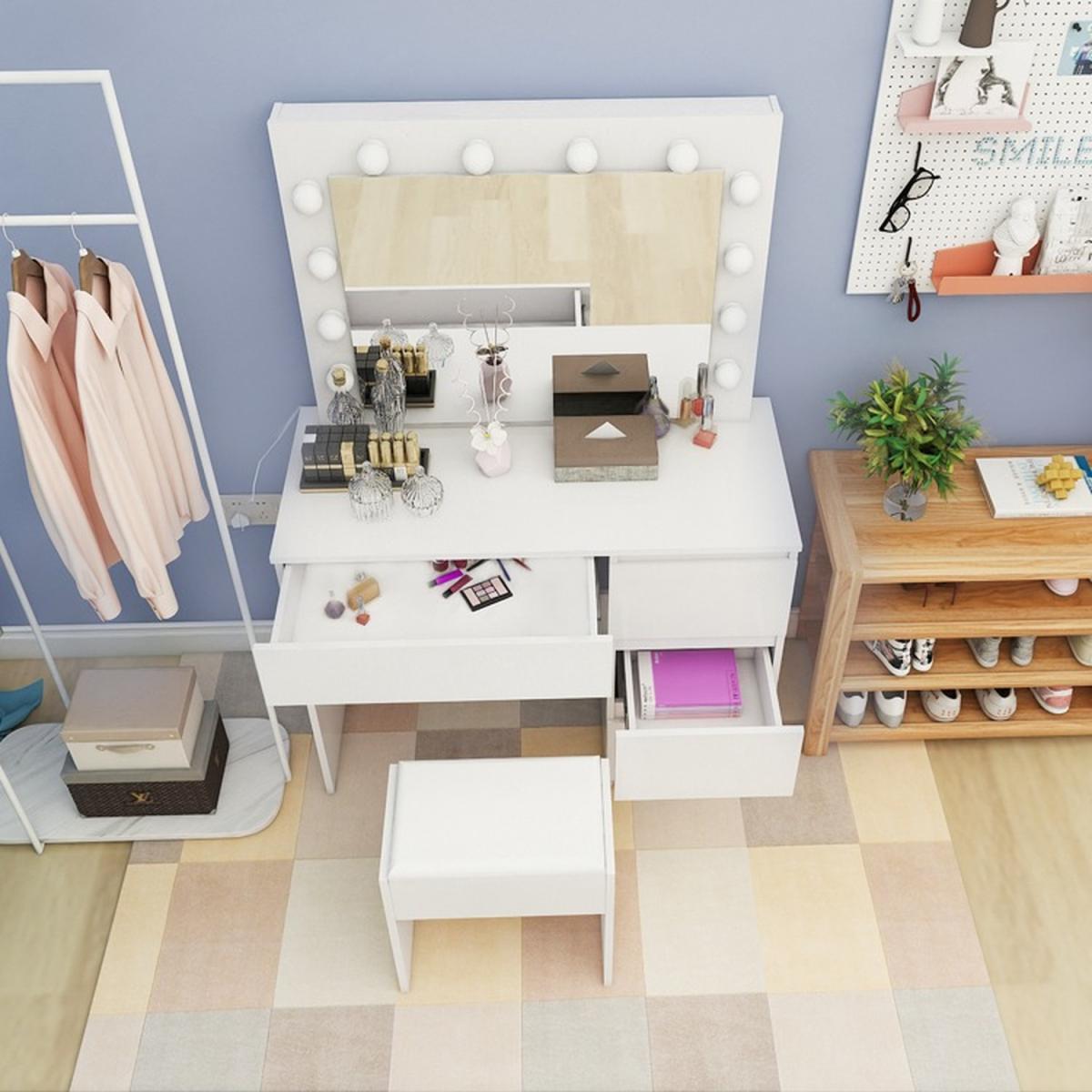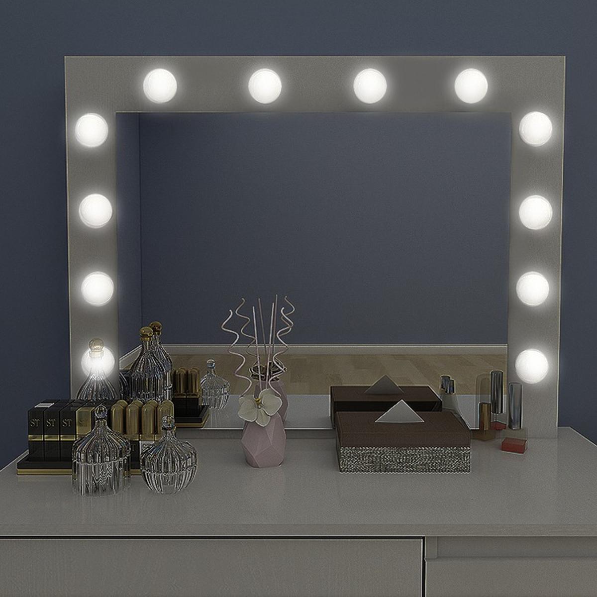 Transform your bedroom with this stunning dressing table set with padded stool. This beautifully designed dressing table was created with practicality and style in mind, to add glow and warmth to your bedroom. It has a generous large mirror with stunning Hollywood bulbs. Can change to 3 different tones. At a touch of a button, you can change the lighting to suit your mood and your needs. Comes with 3 classic handleless drawers to store away your jewellery, makeup and little treasures.