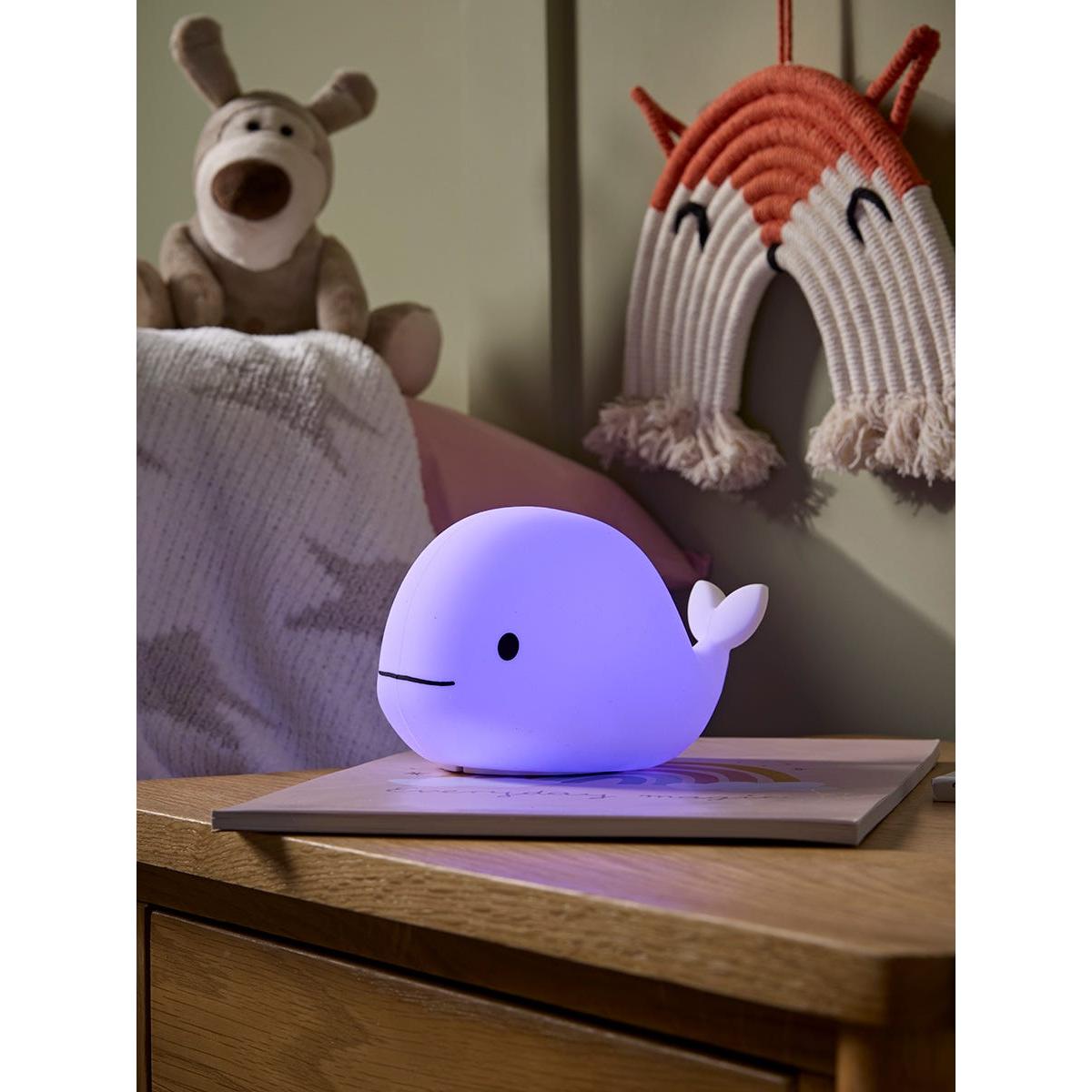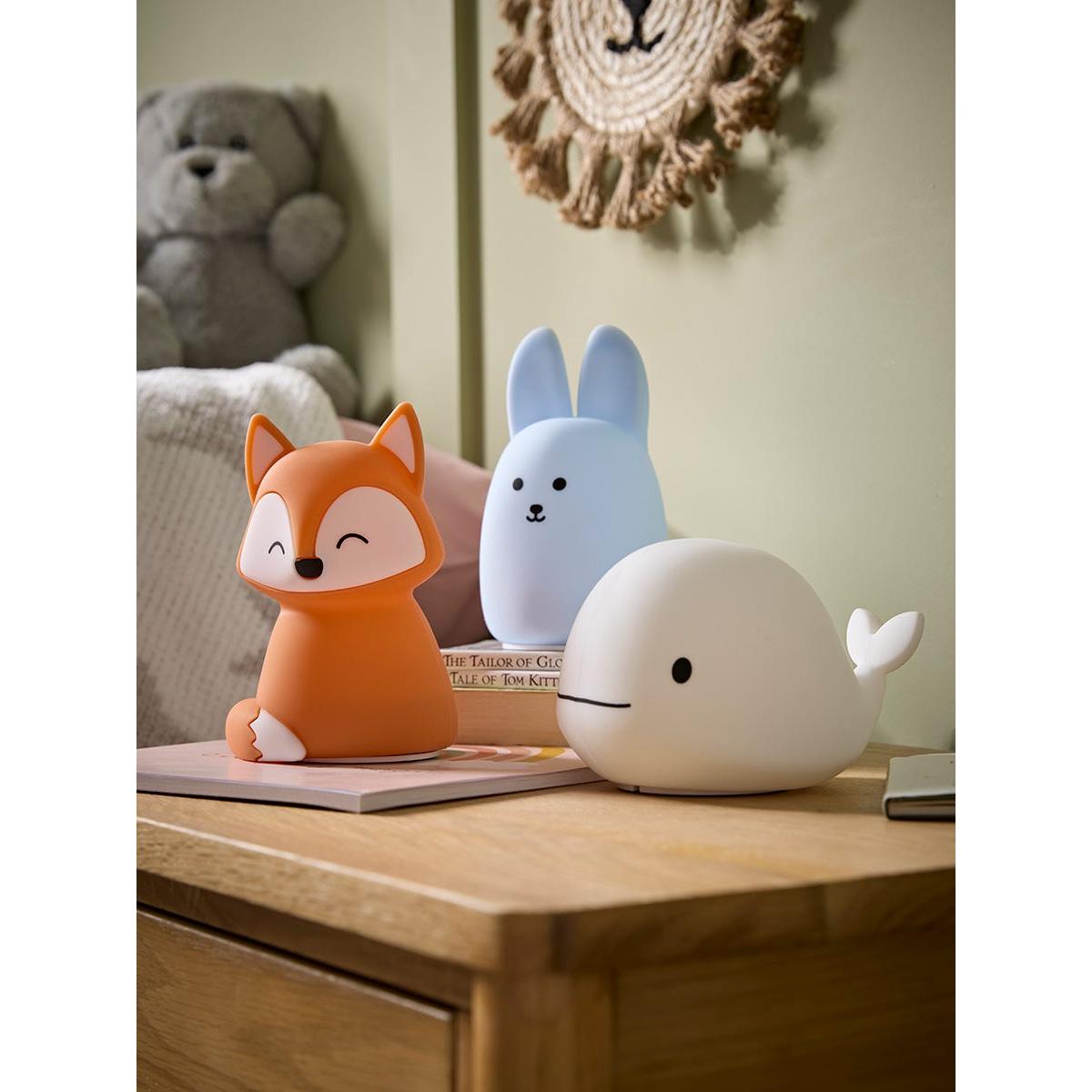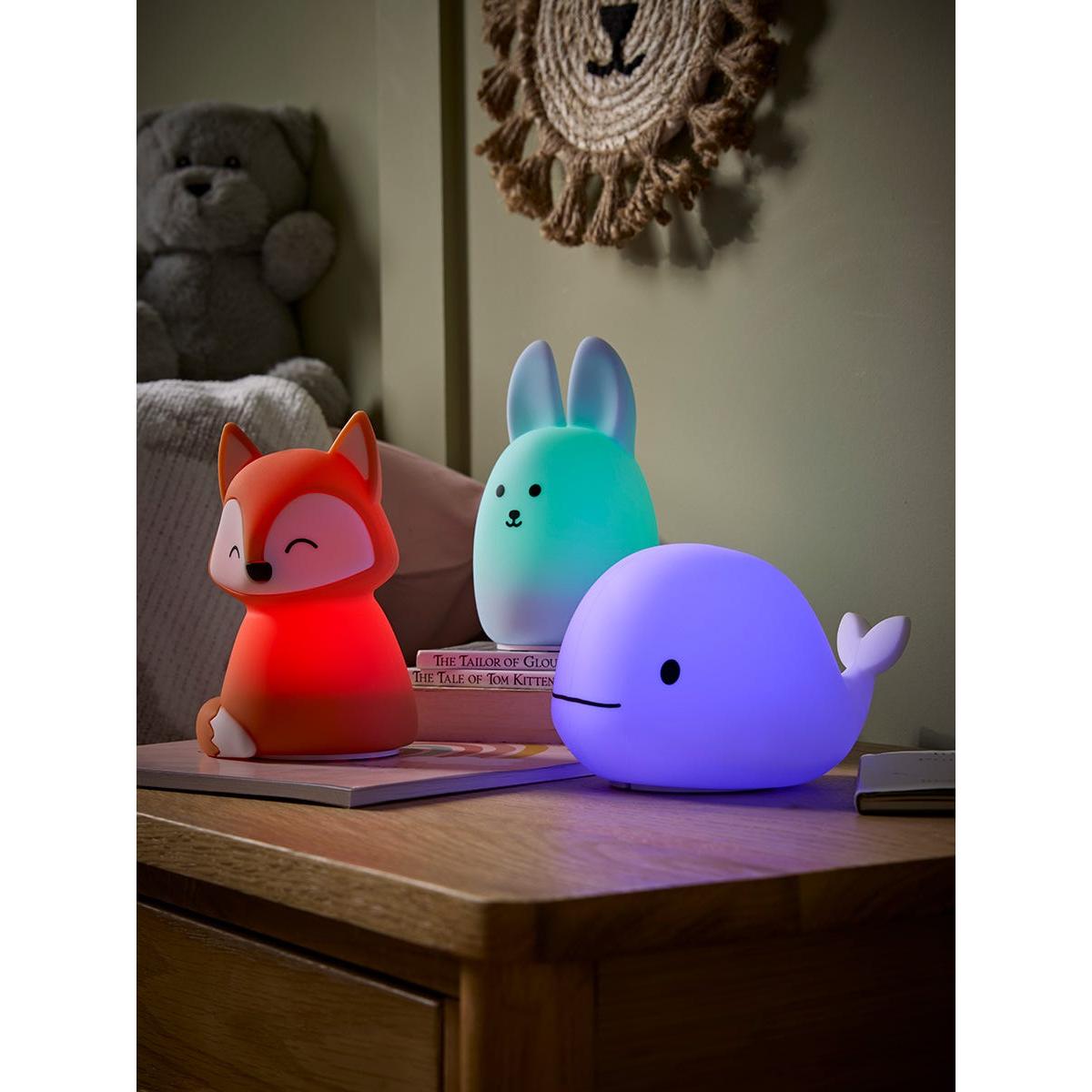 In the cute shape of a little whale, this nightlight offers some fun in your child's bedroom. With five different colour options available, this night light changes colour when you tap or shake, offering a fun glow around your child's bedroom.  Also available as a bunny or fox.