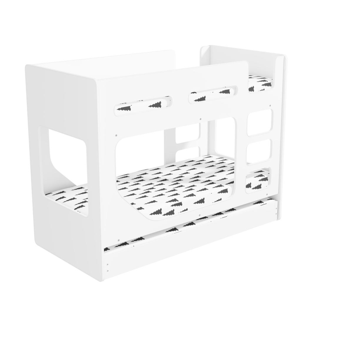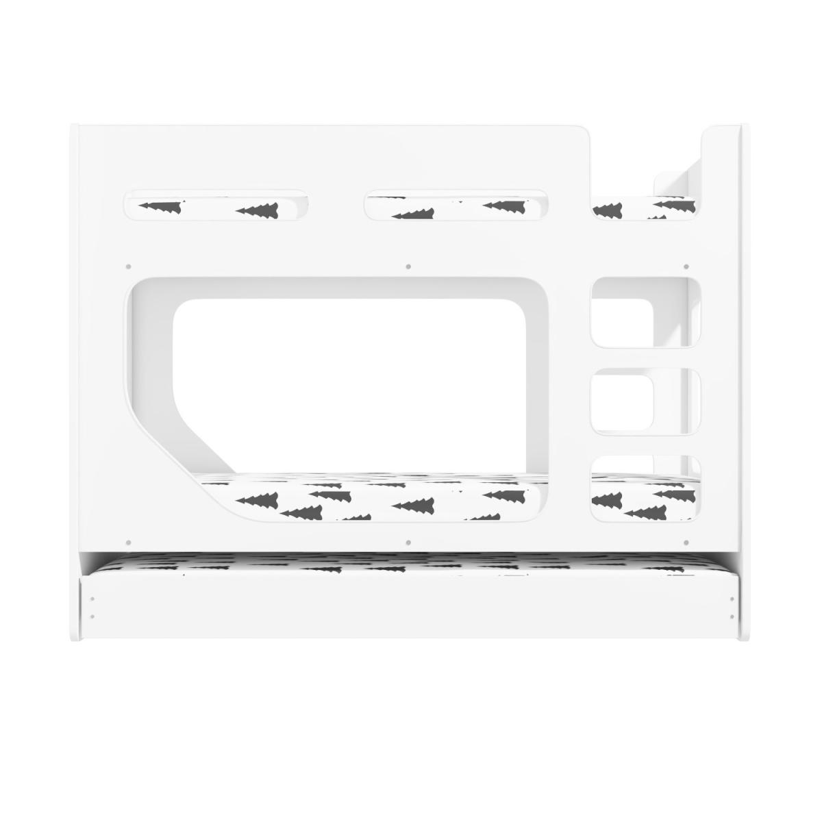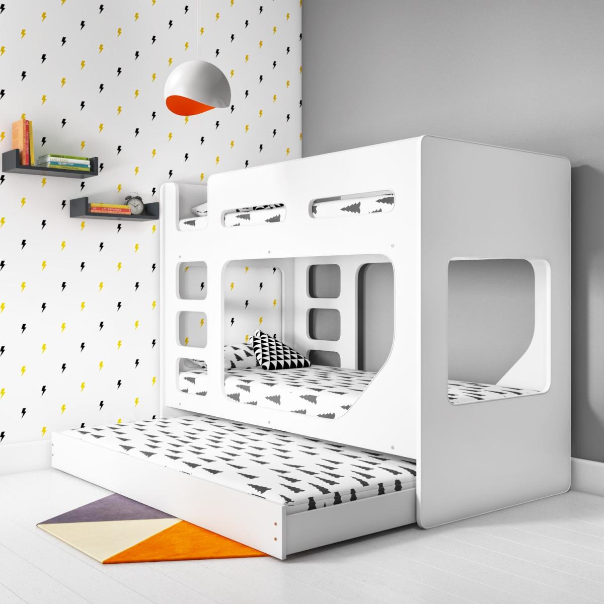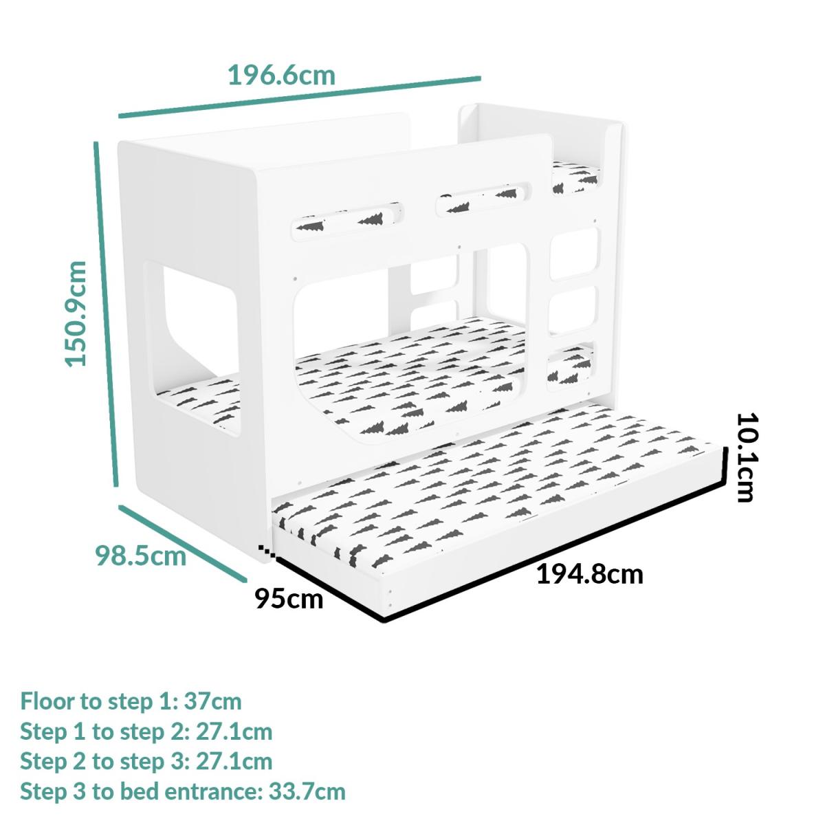 Features we love Transform into triple bunk bed with pull-out trundle. Built-in ladders on both sides. Curved-edged sturdy railings for sleeping safely Trundle has integrated wheels for ease of use Clean white finish is great with any bedroom style Need to know. Dimensions. W196.6 x D98.5-193.5 x H150.5 cm Size. Standard UK single 3ft/90x190cm Max mattress depth for trundle. 17.5 cm Material. Wood Finish. White Base. Slatted Mattress. Not included Max weight limit for the top bunk bottom bunk and trundle base including mattress. 120 kg Assembly required. Yes.