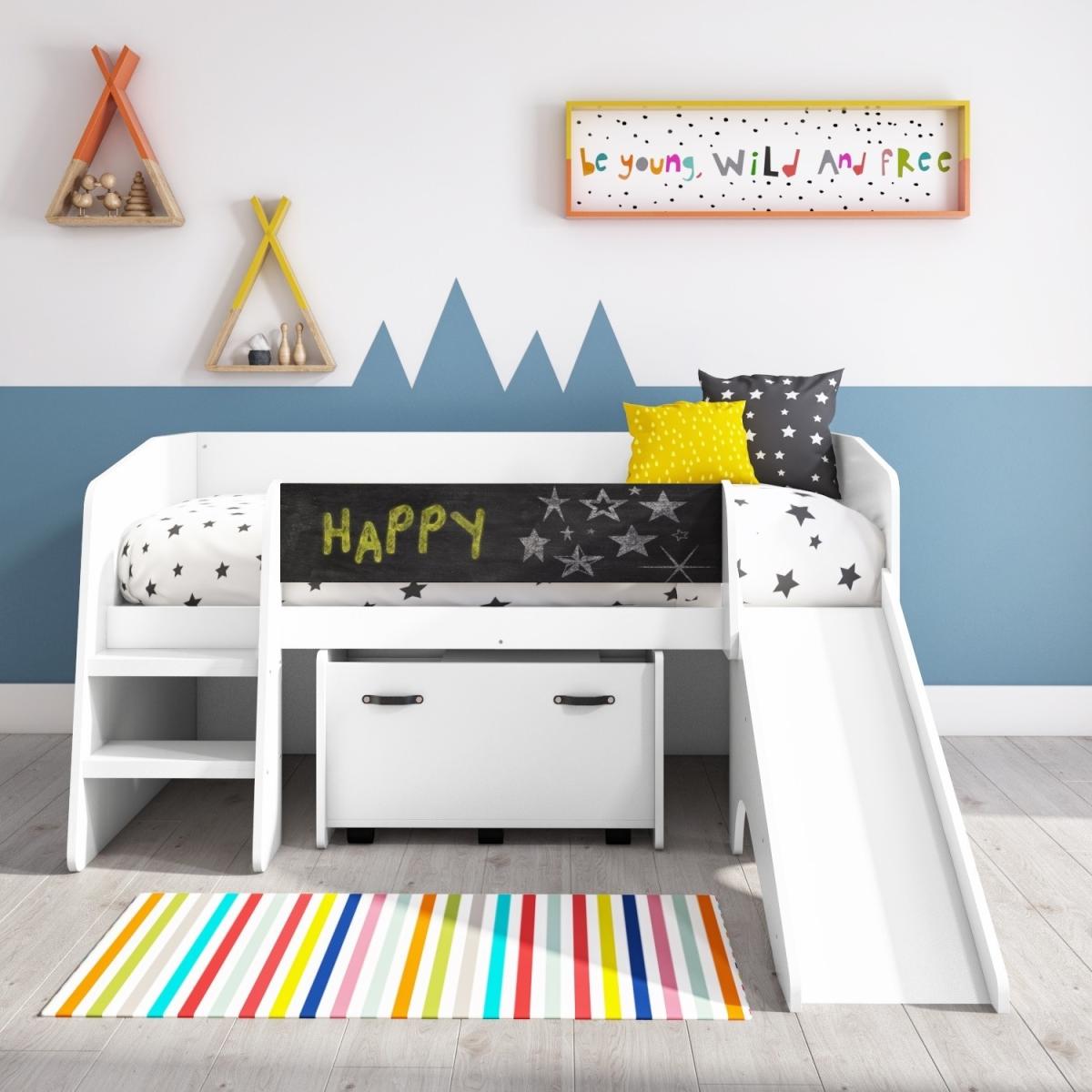Features we love Painted in a neutral white finish. Unisex design is perfect for both boys and girls. Fun design - with slide chalkboard and toy box Ample storage with generous sized pull-out toy box Chunky ladder and right-hand facing slide Fits a standard UK single mattress (3ft)Easy assembly Need to know. Total dimensions. W196 x D192.2 x H98.3 cm Storage box dimensions. W83 x D36.5 x H40.9 cm Mattress size. Standard UK single (90 x 190cm / 3ft) Colour. Neutral white Material. Solid wood combination (LVL) and PU leather (storage box handles) Finish. Painted Bed base. LVL slats Assembly required. Yes Mattresses included. No.