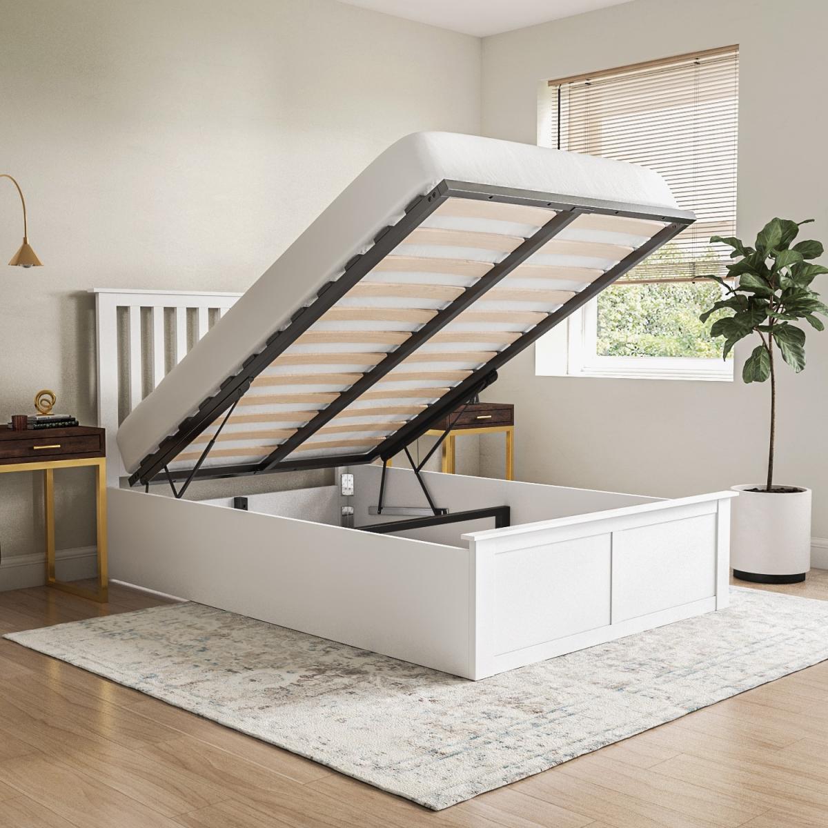 Features we love Small double white wooden bed with storage Generous ottoman storage with gas-lift mechanism Wooden slat base creates support for your mattress Timeless classic design will suit any home interior Also available in a standard size double All about me Utilise the space in your bedroom to the fullest with this white painted wooden bed. In a small double size that will save you space, this bed also has a hidden storage compartment underneath. Accessed by lifting up the base and mattress, the gas-lift mechanism makes the compartment easy to get to. The white painted finish will suit any home interior and create a light a fresh feel for your room. Need to know Dimensions:W132 x D203 x H111 cm Size:Standard UK Small Double (4ft/120x190cm) Inernal storage dimensions:W123 x D194.5 x H25.5 cm Colour:White Finish:Lacquered Material:Poplar and MDF Assembly required:Yes Please be advised the ottoman lift mechanism supports a weight of up to 55kg when open