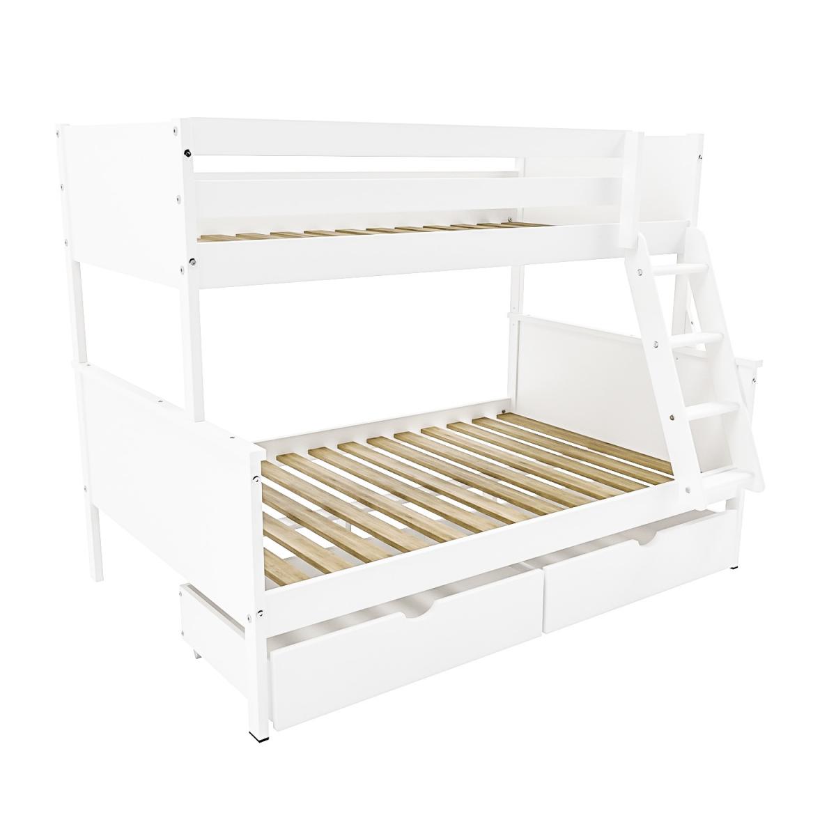 Features we love Triple Sleeper bunk bed with underbed storage drawers Neutral white painted finish suits any colour scheme Ideal for larger families, sleepovers or guest rooms Ladder can be fixed left or right upon assembly Fits a single mattress and small double mattress All about me Designed with versatility in mind, this trio bunk bed with storage makes the ideal space-saving solution. With a single bed and a small double bed, it's perfect for last-minute sleepovers at a moment's notice. It's great for adults and safe for little ones too, thanks to the raised sides at the top. With a solid pine construction and a sprung-slatted base, it has been made to last. It fits a UK single mattress and a UK small double mattress, which can be purchased with a 10% discount in our popular bundle package deals below. Need to know Packaging dimensions: Box 1: W50 x D120.8 x H10.1 cm / Box 2:W26.8 x D196.5 x H11.3 cm / Box 3:W31.2 x D124.6 x H13 cm / Box 4:W56.7 x D95.8 x H7.5 cm Packaging weights: Box1: 28.9kg / Box 2: 32.1kg / Box 3: 19.9kg / Box 4: 16.3kg Assembled dimensions:W136 x L196 x H154 cm Each drawer dimensions:W92.5 x D60.5x H21.7 cm Each inner drawer dimensions:W91.1 x D59 x H17 cm Product weight: 97.2kg Mattress size: UK single (90 x 190cm / 3ft) & UK small double (120 x 190cm) Max mattress height: 19cm Max weight capacity per bed: Top bunk - 90kg top / Bottom bunk - 120kg Colour: White Finish: Painted Material: Solid pine wood and MDF Bed base:Wooden slatted For use: Indoors Assembly required: Yes Mattresses included: No Please note: Mattresses aren't included so you have the freedom to select the mattresses of your choice