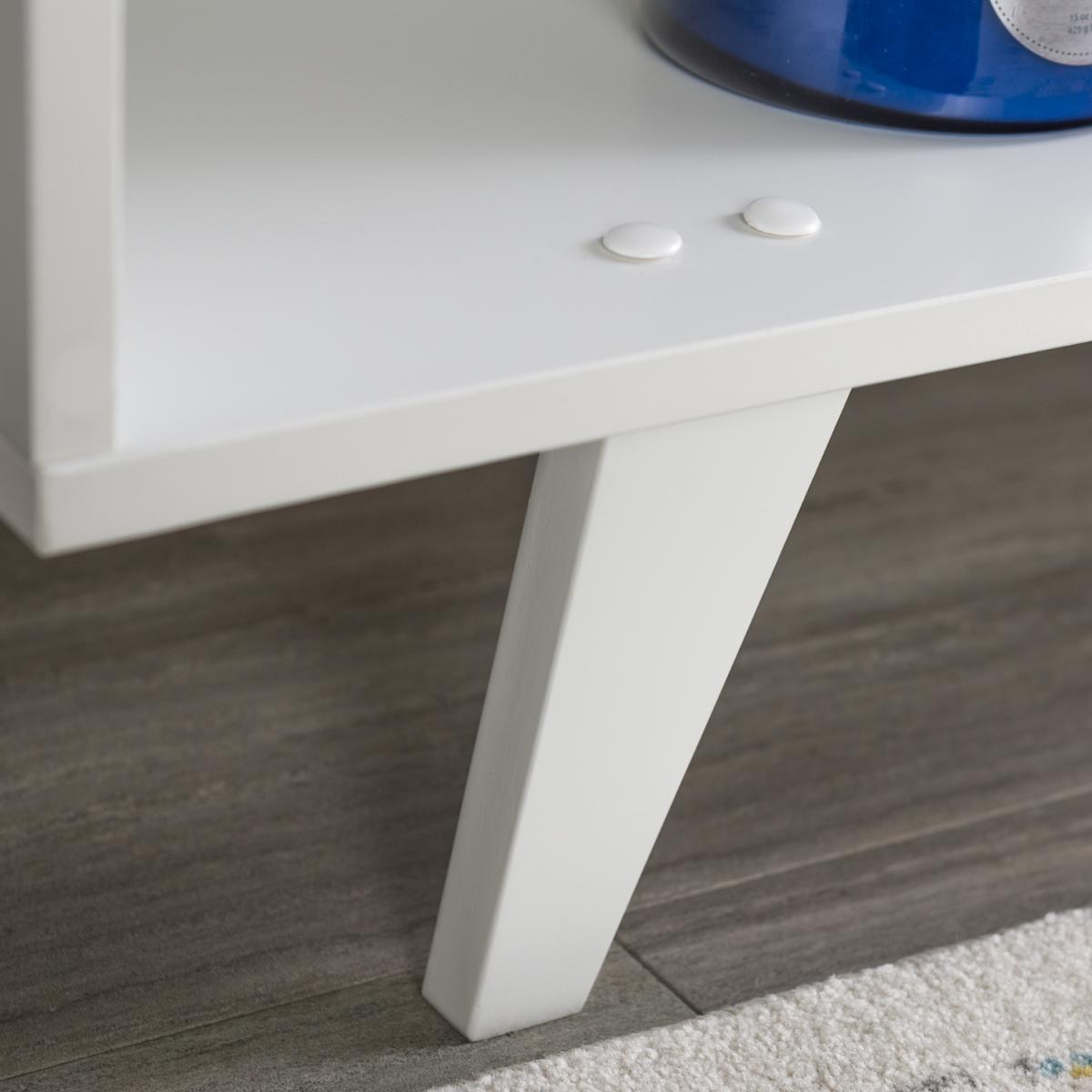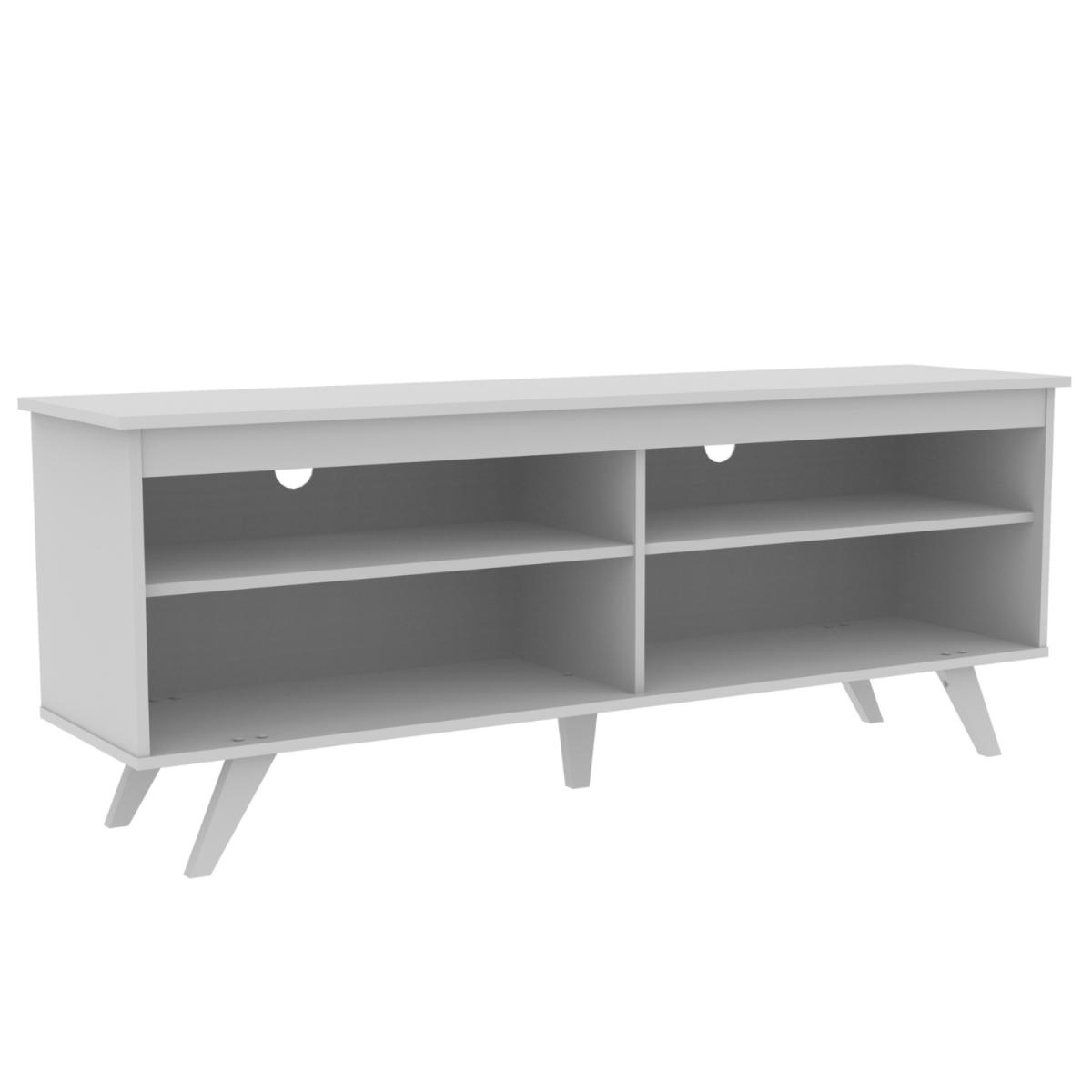 Dimensions H58cm x W147 x D38cm. Simplicity meets mid-century style in our white wooden TV unit. Giving a simple clean look to your living room so you'll enjoy having in your home. Built with sturdy high-grade MDF and featuring a stylish painted finish with angled legs this media console can accommodate most TV's up to 60 inches. Features. In a mid-century modern design style to look stylish in your home Ideal for your living room bedroom or home office to add storage space Open shelving gives you ample storage space for media units. Made from high-grade MDF with angled legs. Cable management features in back. Colour – White Easy assembly with step-by-step instructions..