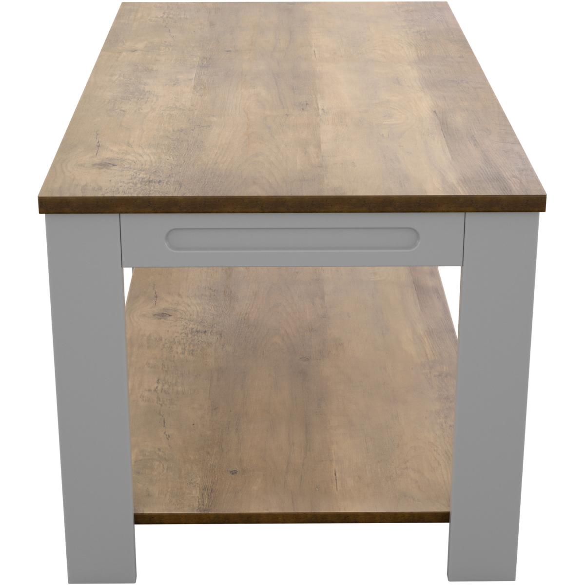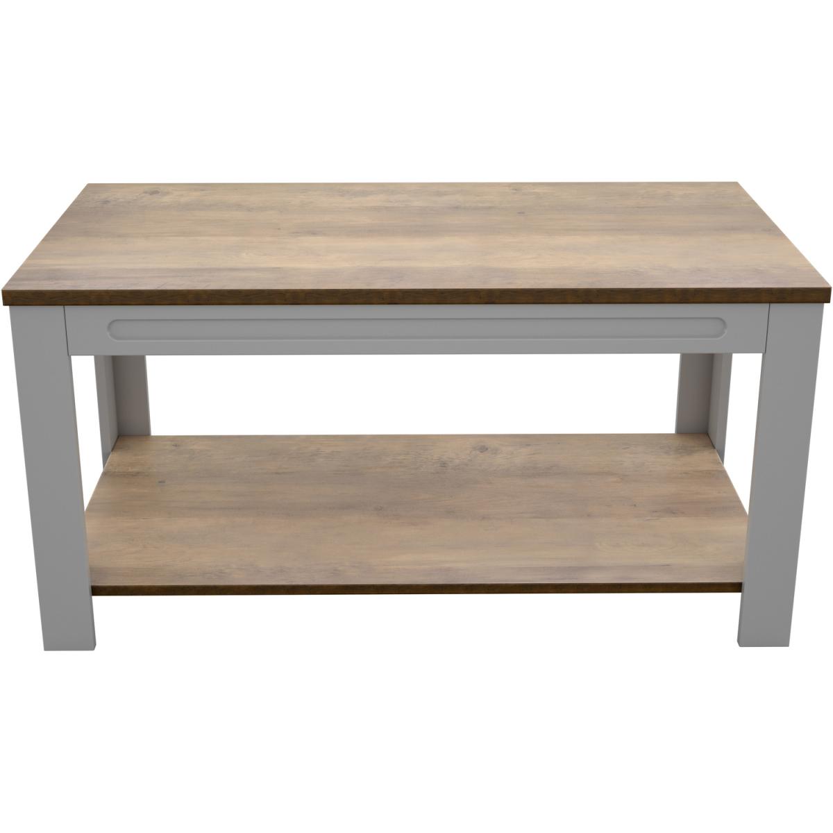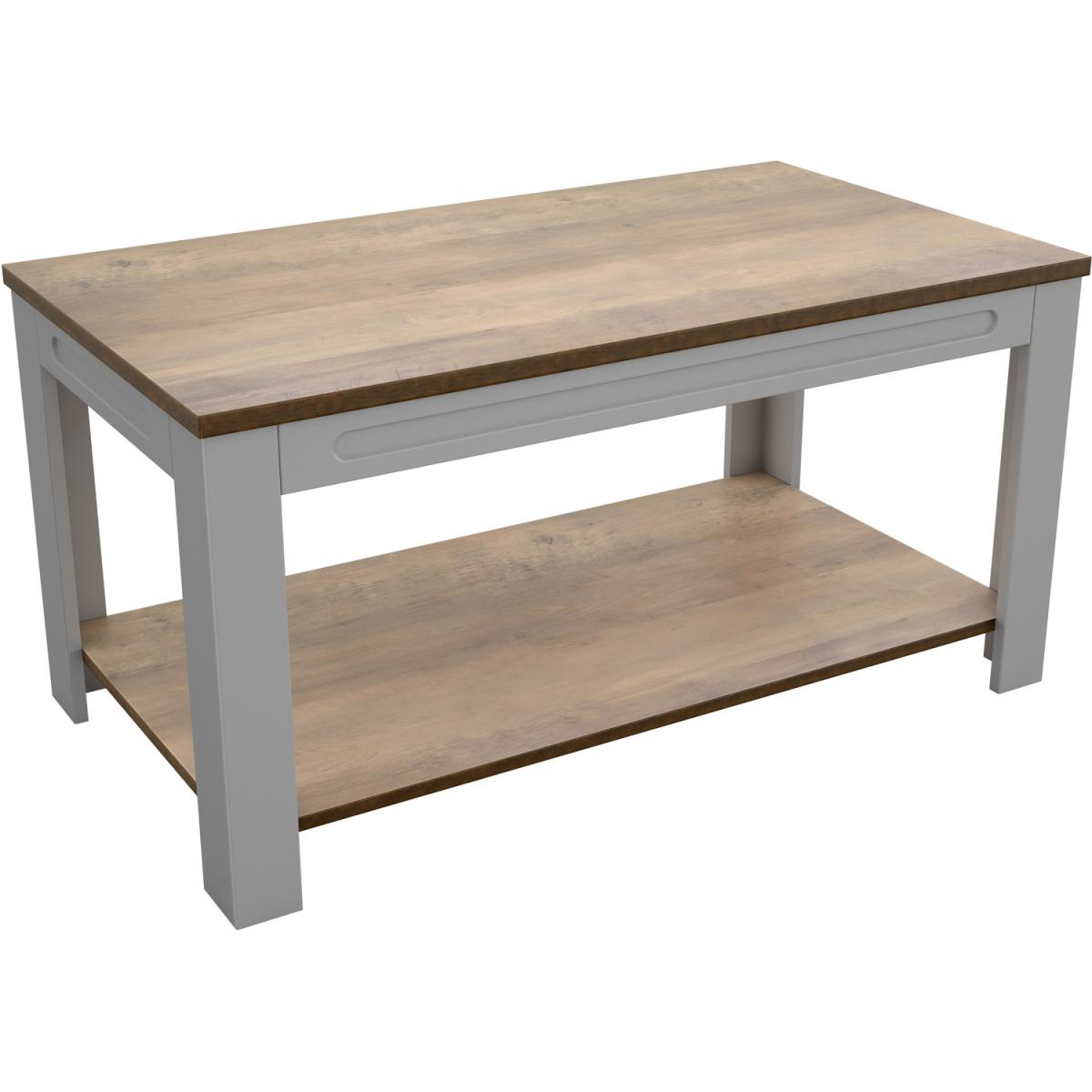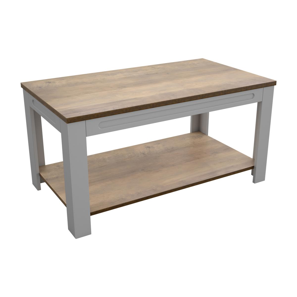 I’m a fan of this grey-with-oak-top coffee table because its clean lines and neutral tones slot easily into both modern Scandi schemes and more traditional country-style rooms. The lower shelf adds practical storage for baskets of throws or your favourite coffee-table books, keeping the top surface uncluttered. To style, start with a textured tray in a contrasting tone (think charcoal or soft black) and layer a small vase or succulent alongside a candle. Use the shelf below for woven baskets or a neat stack of magazines to add warmth and keep essentials close to hand without crowding the tabletop.