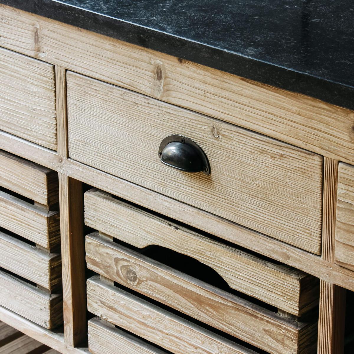 A versatile kitchen storage island handcrafted from recycled pine wood with a mottled limestone top and now in a whitewashed finish. Featuring eight pull drawers, eight handy crates and a metal rail to hang your tea towels, the Hudson is perfect forstoring all your kitchen essentials. Psst,. To download our handy guide to check if your new furniture will fit correctly into your space before you order. Due to the size and weight of this item additional charges may be applied for delivery to floors above ground level, and also to spaces with restricted access. Please contact our. Customer Services. Team for more information. Exclusive to G&G in the UK.