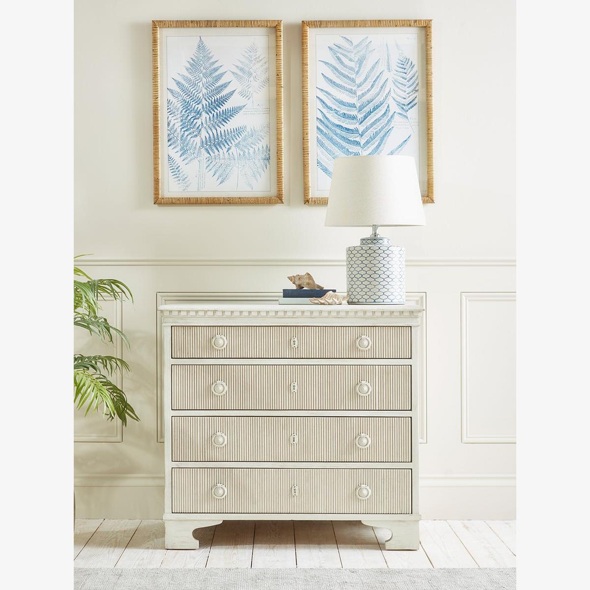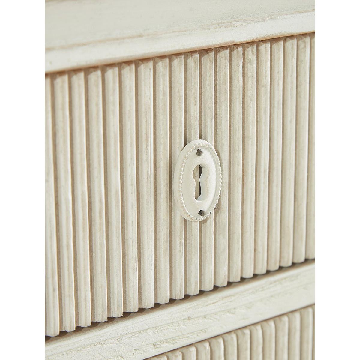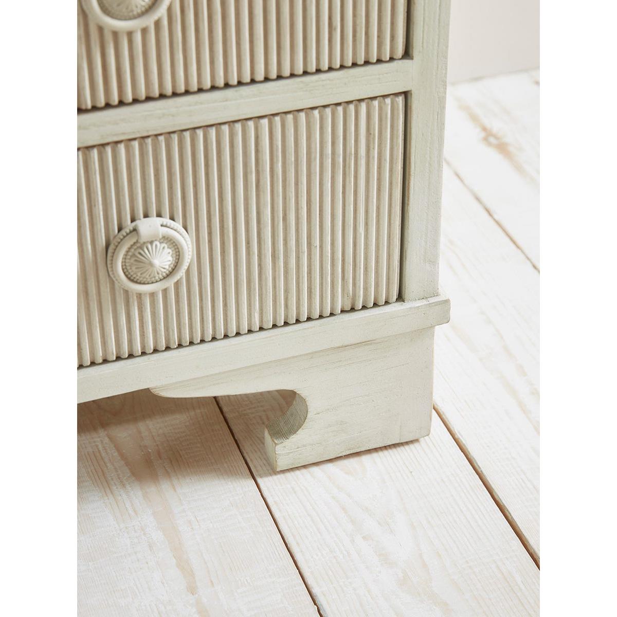 An exquisite addition to a pretty bedroom, this chest of drawers is whitewashed for a lighter look. Delicate design features such as reeded drawer fronts and painted metal hardware give it a feminine feel. With plenty of storage capacity in the four drawers it is a versatile as well as stylish piece of furniture.
