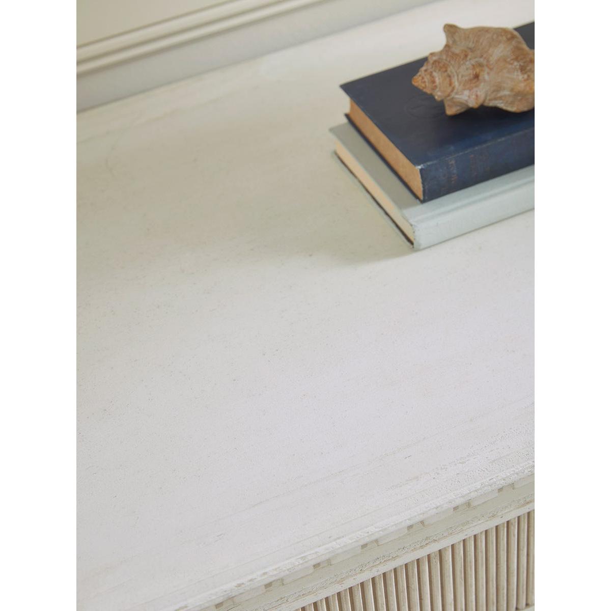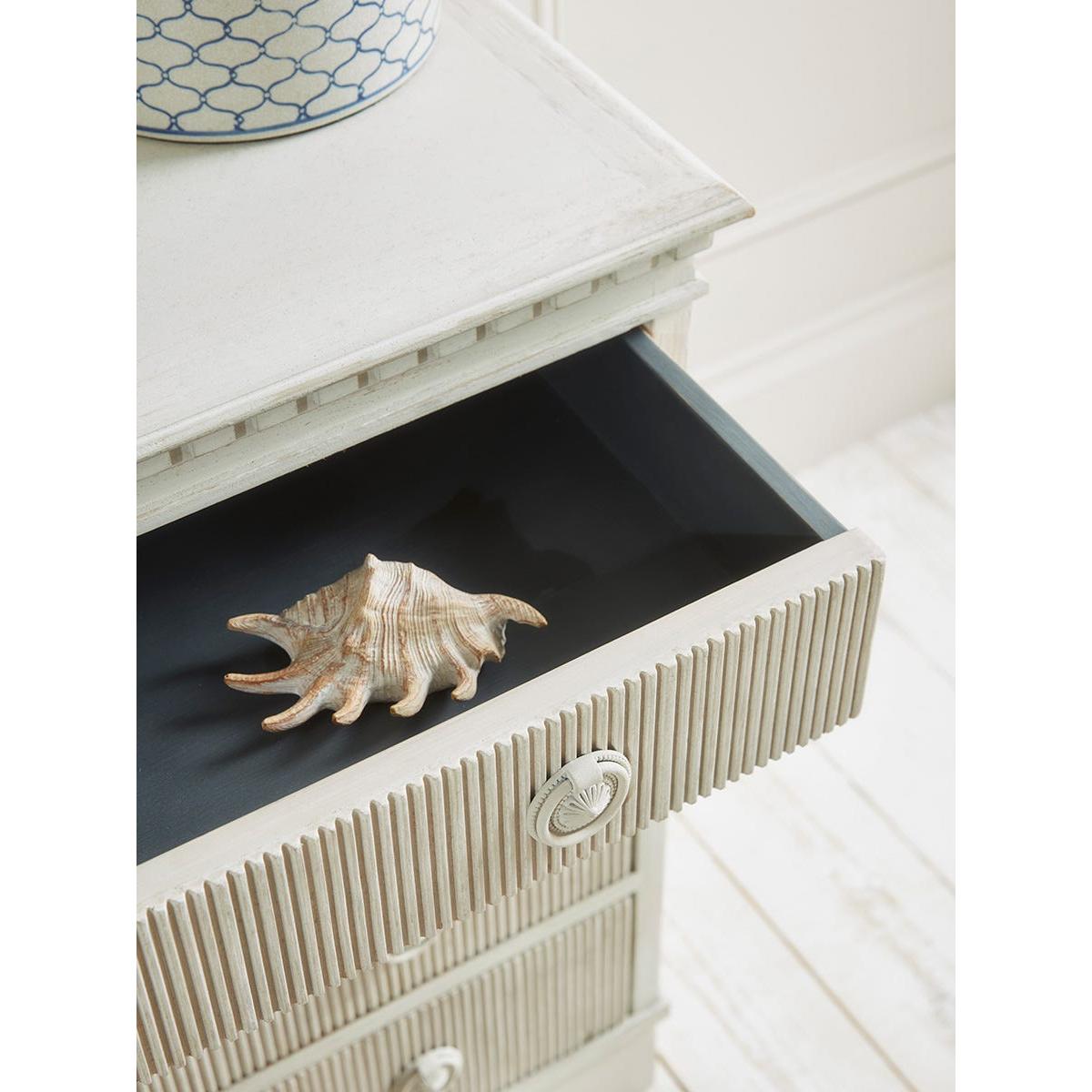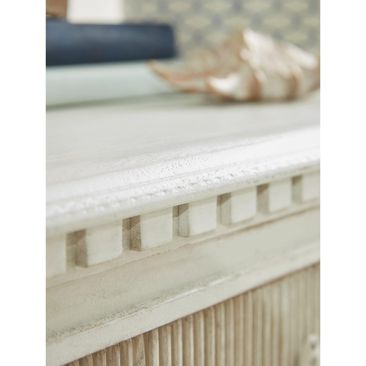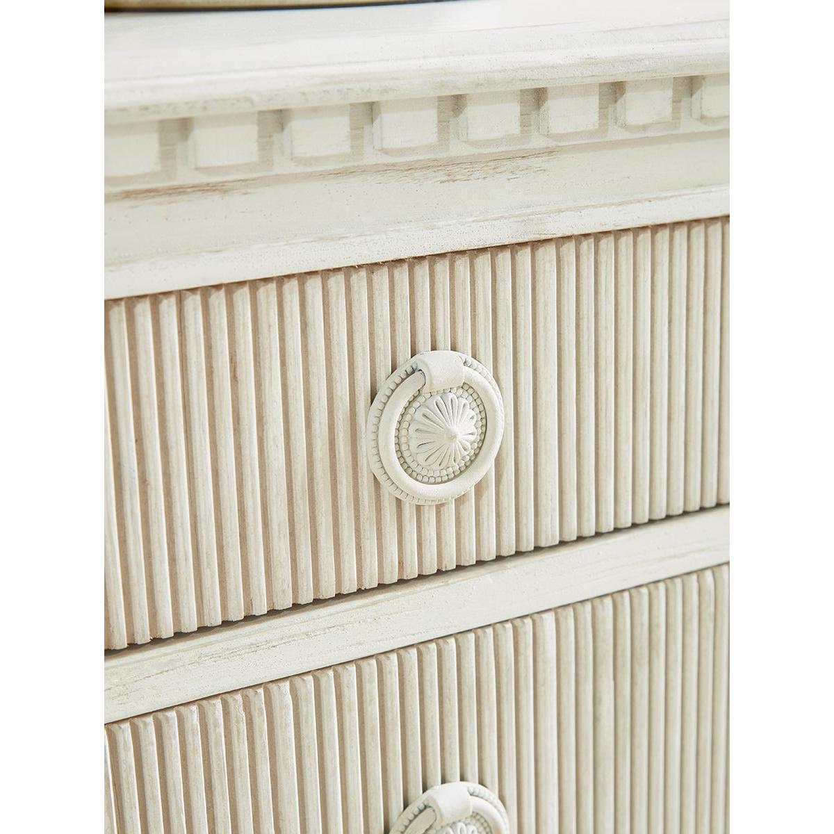 An exquisite addition to a pretty bedroom, this chest of drawers is whitewashed for a lighter look. Delicate design features such as reeded drawer fronts and painted metal hardware give it a feminine feel. With plenty of storage capacity in the four drawers it is a versatile as well as stylish piece of furniture.