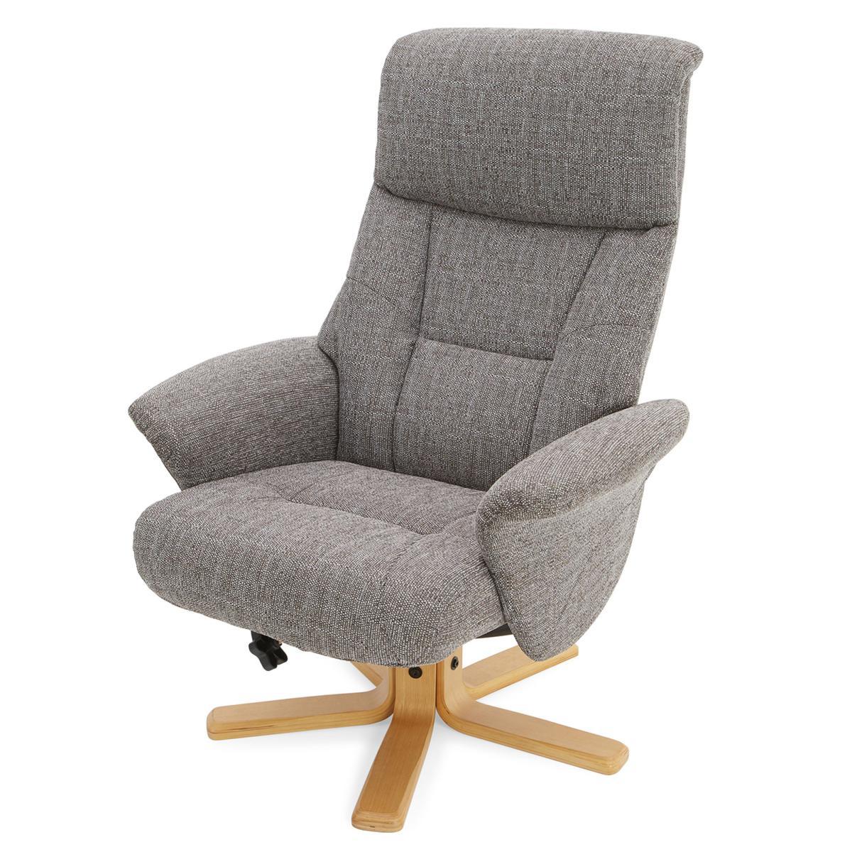 Beautifully crafted, this self-assembly swivel chair is upholstered in a soft polyester fabric and features a padded headrest and deep set padded back to provide utmost comfort. Designed in a grey colourway with wooden legs, this recliner chair is supplied with a matching footstool. Seat Height 45cm. Seat Width 47cm. Seat Depth 49cm. To check out our handy sizing guide to help you find out if you’ll be able to get your new furniture into your home.