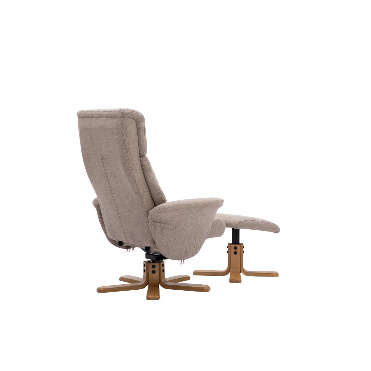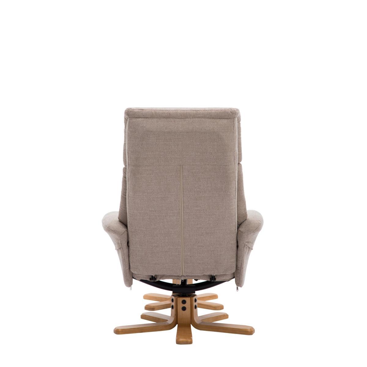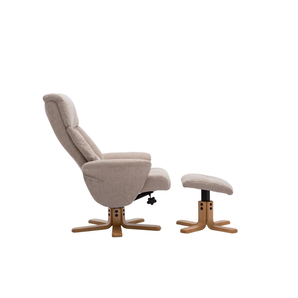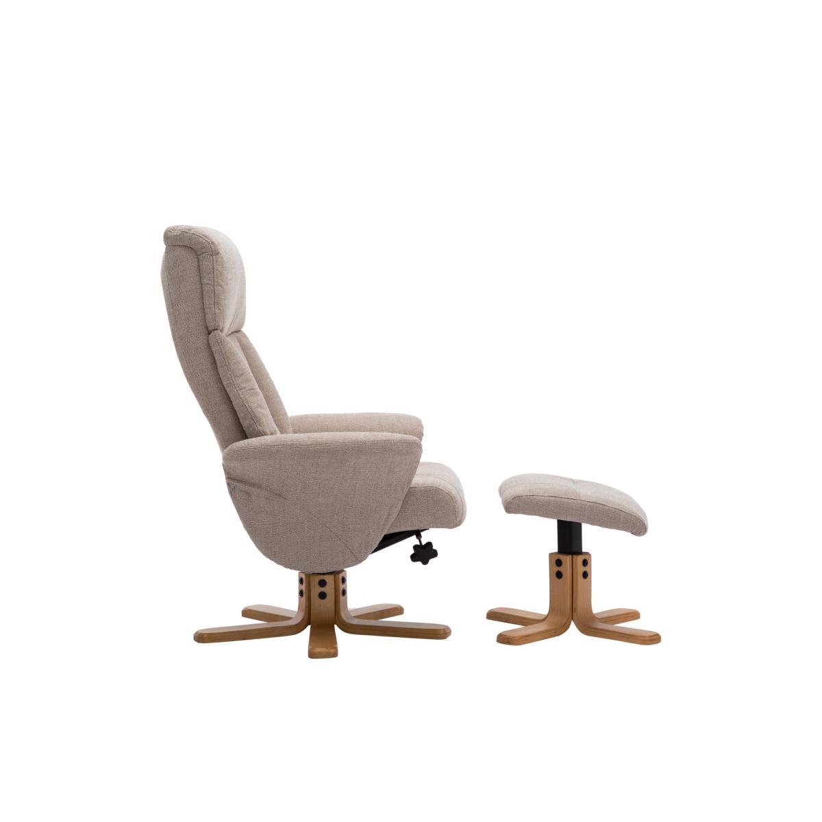 Dunelm Exclusive - Designed and Developed by Dunelm Beautifully crafted, this self-assembly swivel chair is upholstered in a soft polyester fabric and features a padded headrest and deep set padded back to provide utmost comfort. Designed in a natural colourway with wooden legs, this recliner chair is supplied with a matching footstool. Also available in Grey, click [here](https://www. dunelm. dunelm. com/infodocs/downloads/Furniture-Sizing-Guide. pdf) to check out our handy sizing guide to help you find out if you’ll be able to get your new furniture into your home.