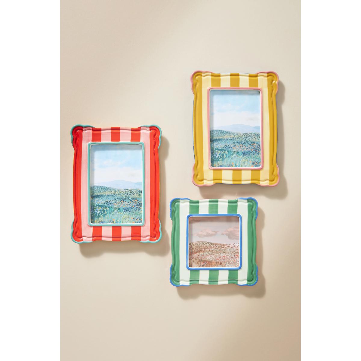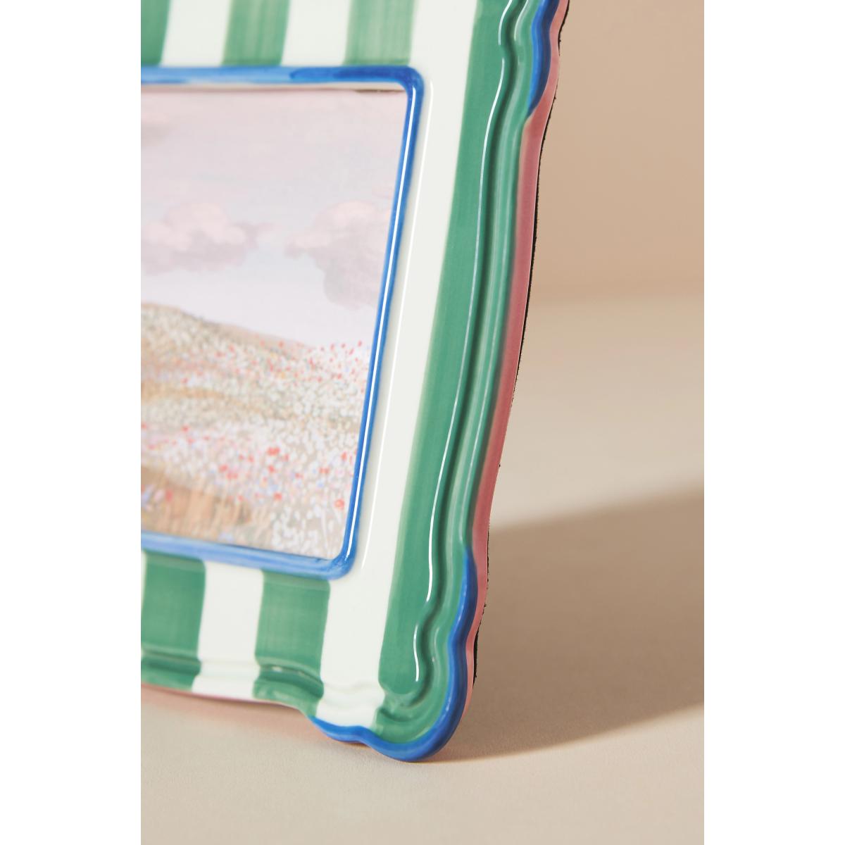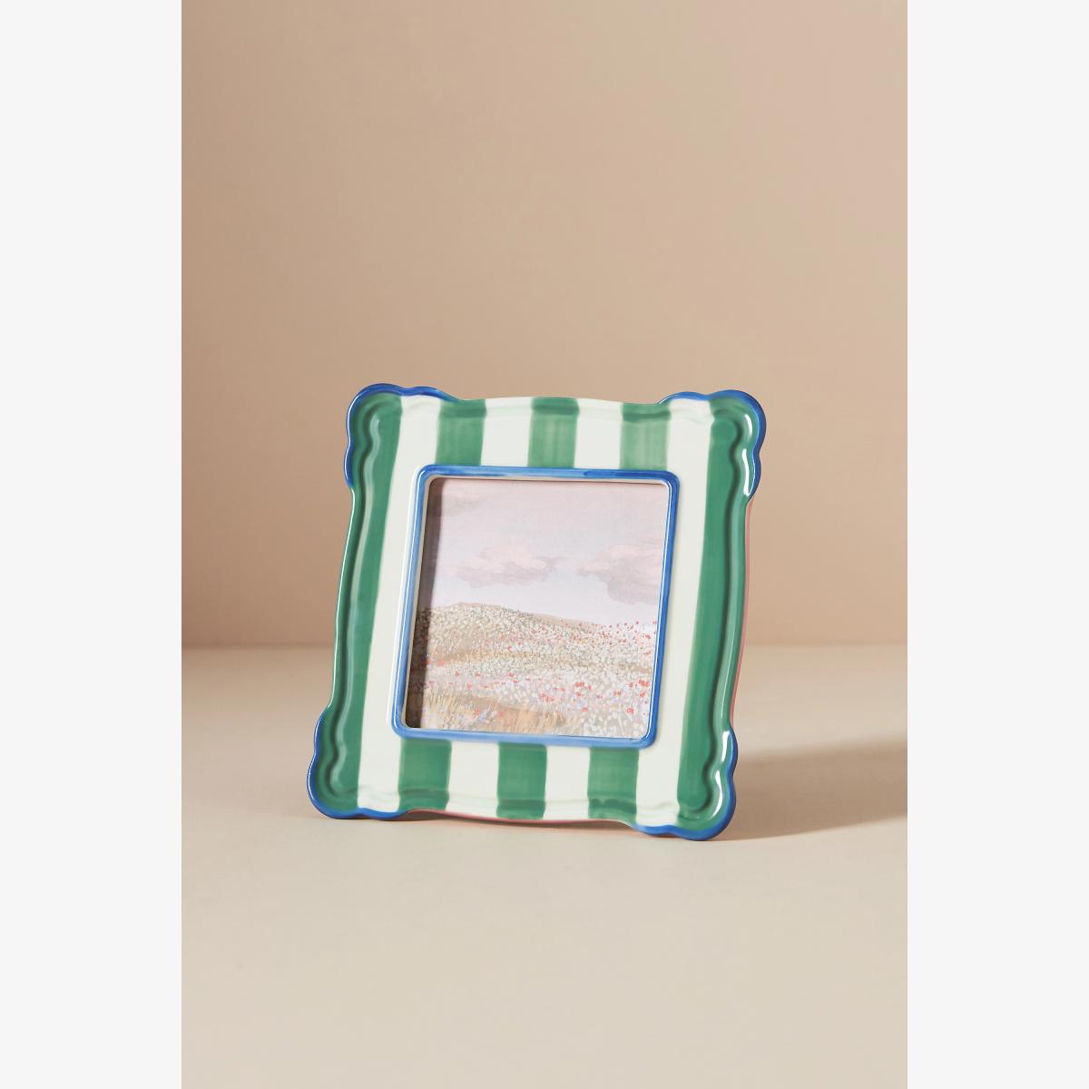 I’m really taken with that Whitney frame’s mix of deep blue scalloping and fresh green-and-white stripes - it brings a casual touch to both contemporary and country-style schemes. Its ceramic finish works well on a painted shelf or alongside natural materials like rattan and timber, helping to balance out heavier textures. For a clean look, slot it next to a small plant or muted vase, or group two or three at varying heights on a mantel. Keep surrounding accessories simple so the stripes pop, and consider pairing it with soft neutrals or matching jewel tones to tie the palette together.