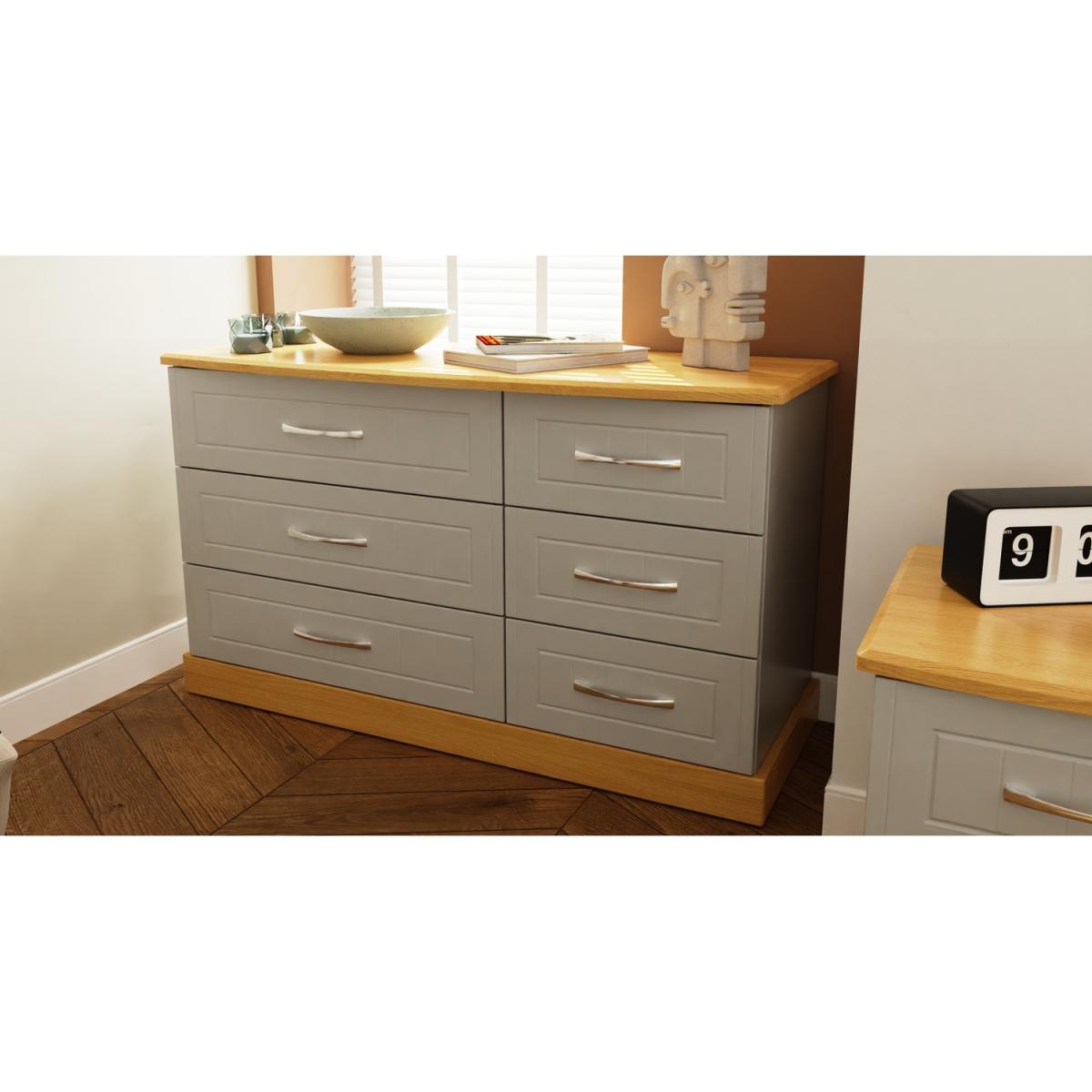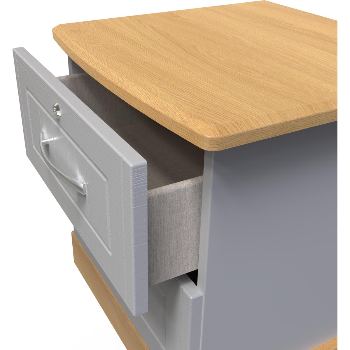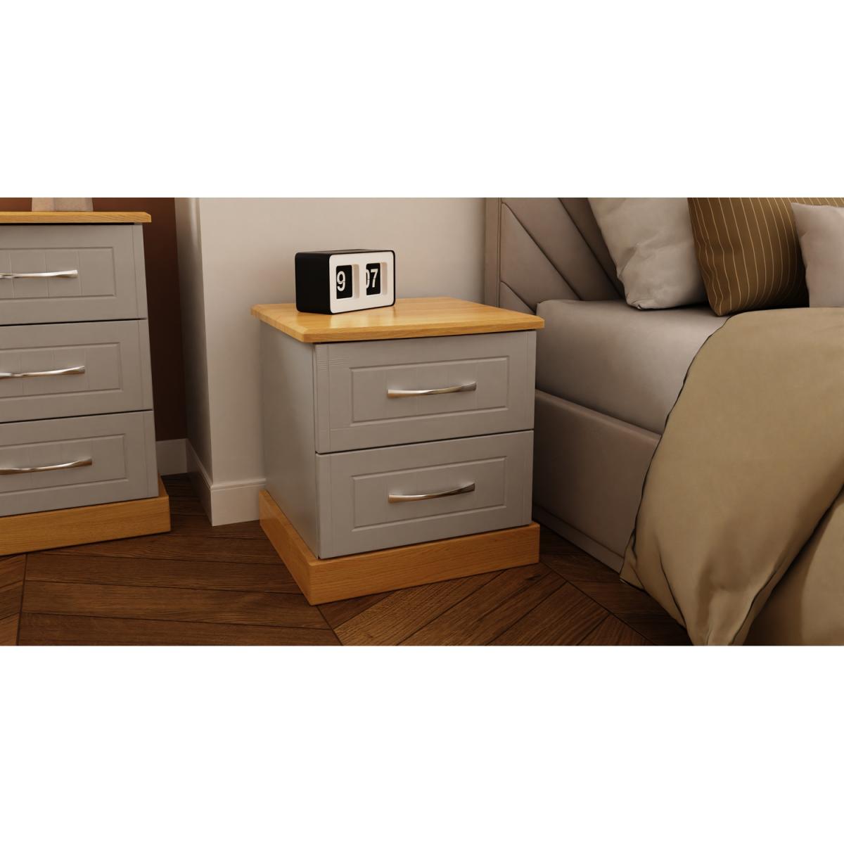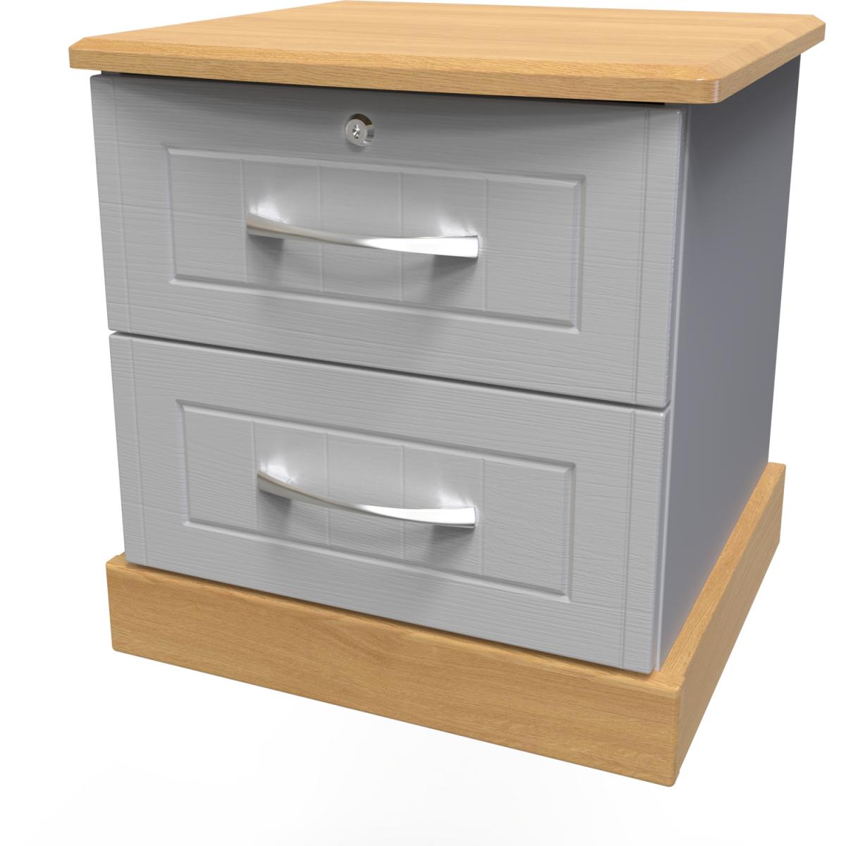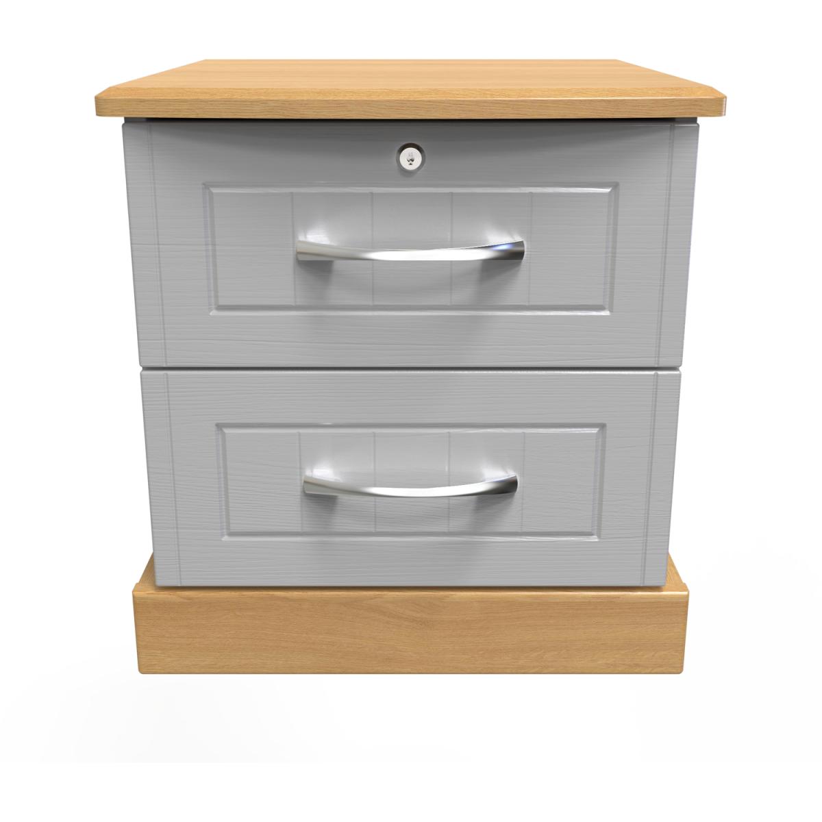 This lockable 2 drawer bedside cabinet is practical and stylish. Perfect for any bedside or as a free standing storage unit. This range combines classical elegance with a traditional design. Featuring curved bow handles and contrasting tops and plinths. Available ina range of scratch reistant finishes. All our furniture is made in the United Kingdom, to the highest quality. It is delivered direct to your location of choice by one of our two man delivery teams, and come full assembled (although legs may be removed to prevent damage in transit).