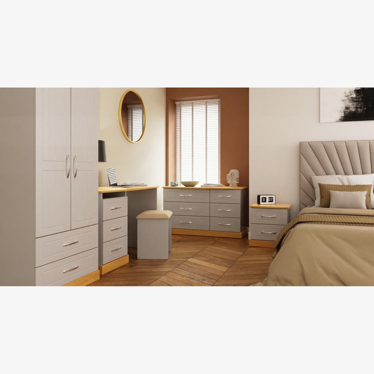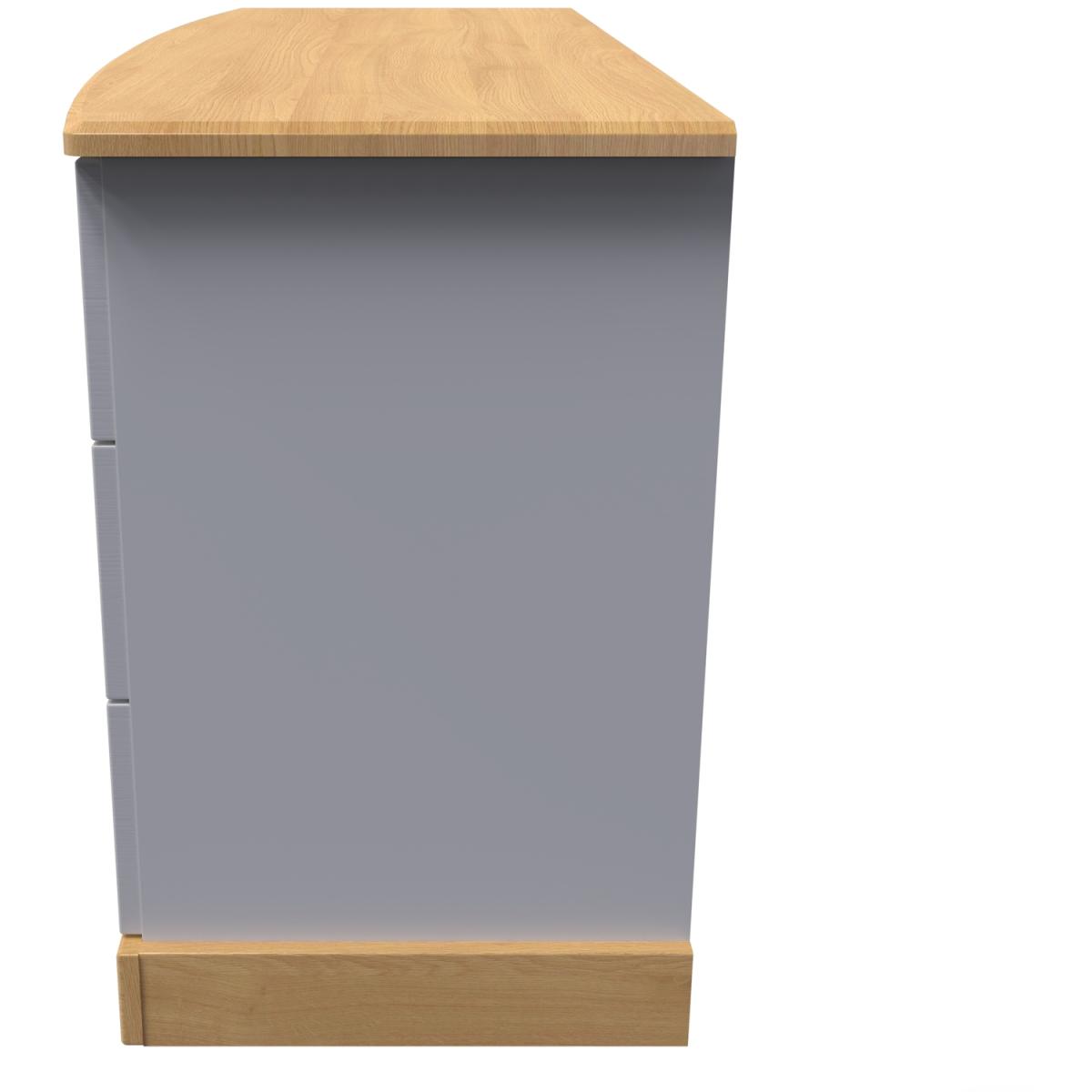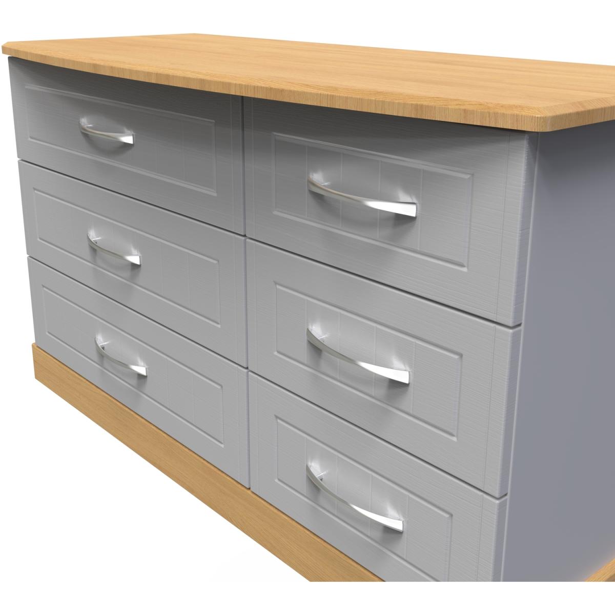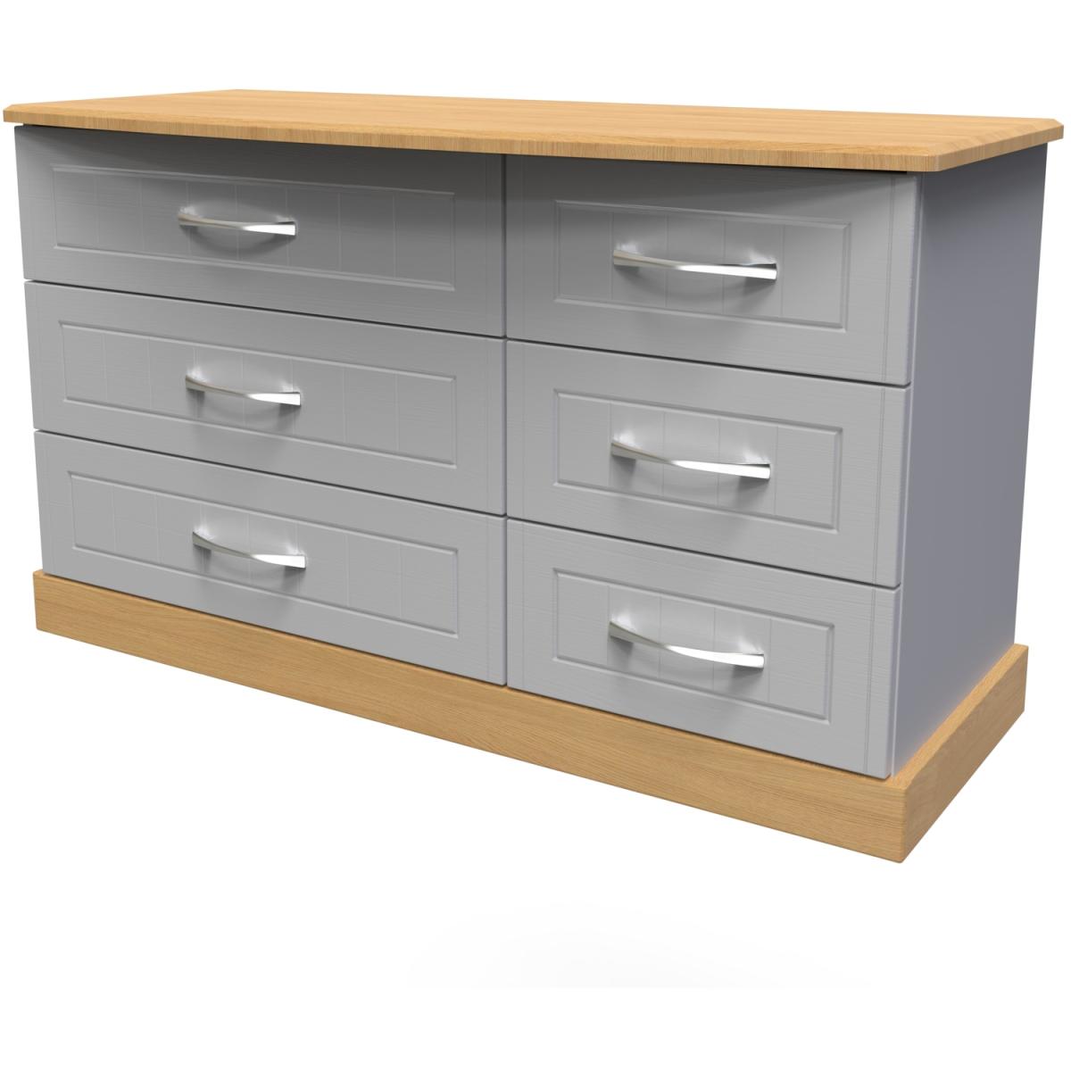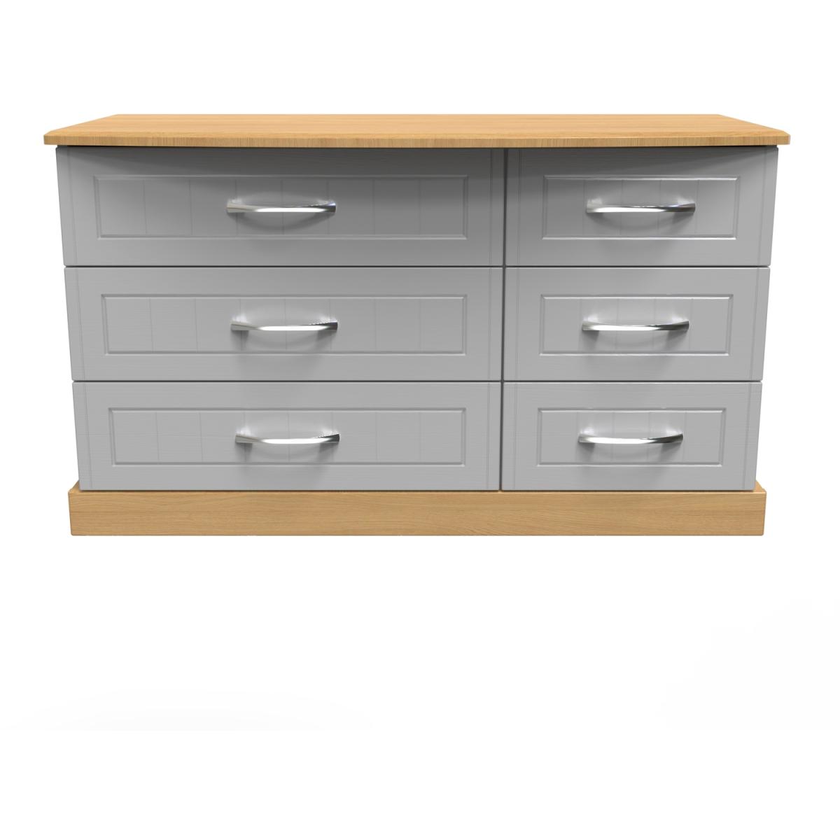 This 6 drawer dresser features a distinctive asymetric drawer design. The perfect storage solution for any room. This range combines classical elegance with a traditional design. Featuring curved bow handles and contrasting tops and plinths. Available ina range of scratch reistant finishes. All our furniture is made in the United Kingdom, to the highest quality. It is delivered direct to your location of choice by one of our two man delivery teams, and come full assembled (although legs may be removed to prevent damage in transit).