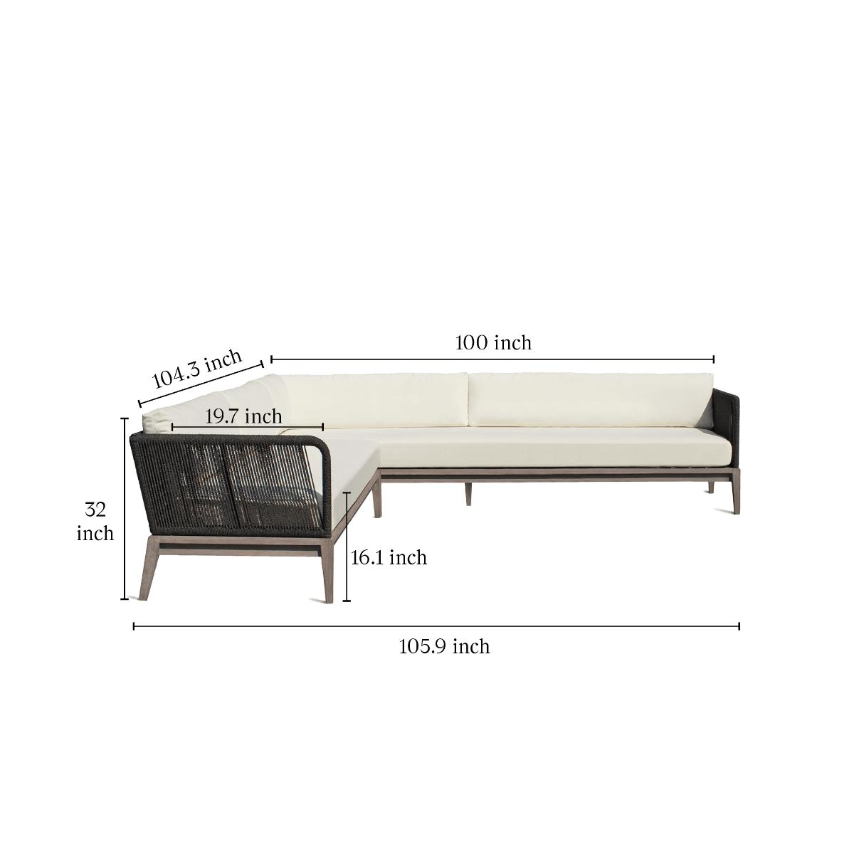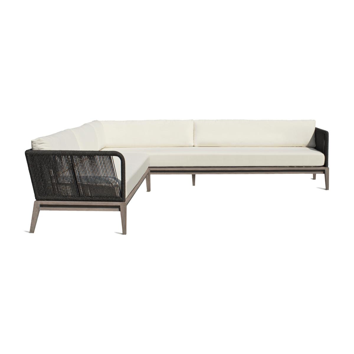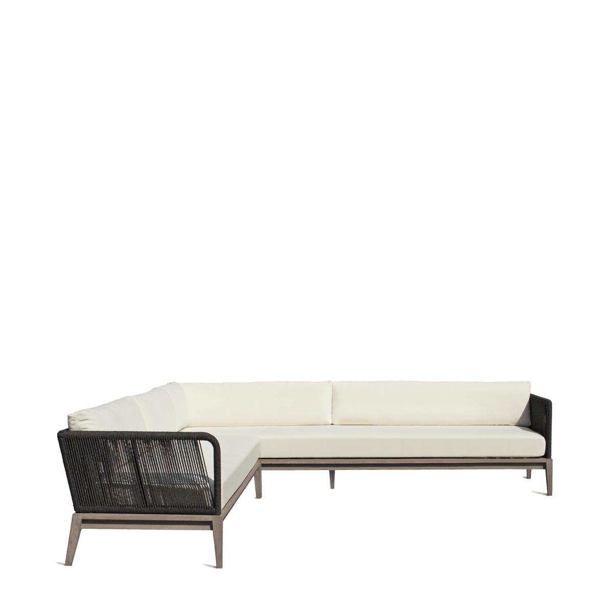 Our Whittaker Corner Sofa has a smart, angular appearance. The base is formed from teak, which is wire-brushed and hand painted for an authentic weathered wood appearance. Its seat is slatted so that the two pieces (the long sofa and the corner extension) can be joined together by two metal clips, while the armrests and back are formed from aluminium, wrapped in a weather-resistant rope. The sofa is topped with foam cushions wrapped in Dacron for extra comfort.