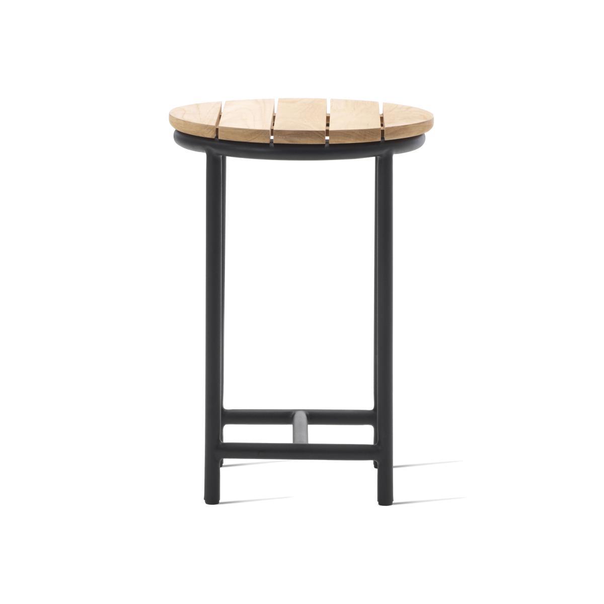 Created by Belgian designer Alain Gilles, the Wicked collection stands out for its elegant, warm style which will find its place both in the home and out in the garden. With its sober, clean lines, it stands out for its elegance and simplicity. The Wicked side table consists of a thick top made of solid teak slats, a naturally resistant, FSC-certified material. Sober and contemporary, the black aluminium structure adds an industrial dimension to the table. The Wicked side table emphasises durable, hard-wearing materials, meticulous details, know-how and a mixture of wood and aluminium. N. B. Teak can take on a natural patina over time to display a silver colour. If you want to keep its natural shade, we recommend you treat it with oil.