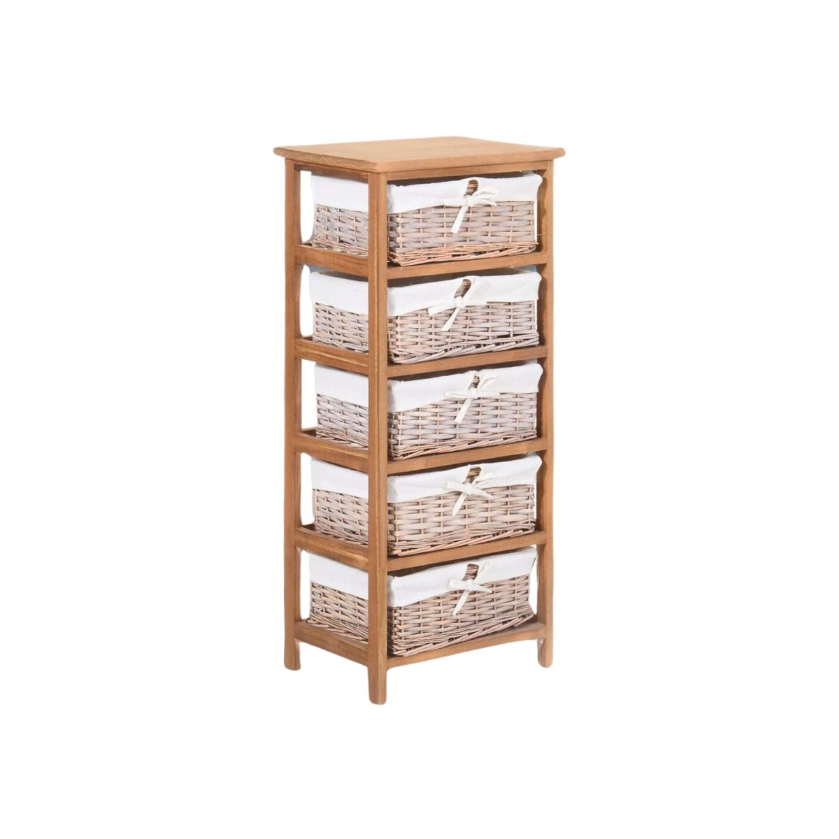 This chest of drawers offers ample storage space for various items such as clothing, books, crafts, and more, making it suitable for use in the bedroom, pantry, or office, providing functional storage with a touch of style. The included wicker baskets are woven for extra strength and feature an inner lining for added protection. They not only enhance the aesthetic appeal of the storage unit but also provide a natural and elegant look to your space. Constructed with a robust wood frame, this storage chest ensures strength and durability to withstand everyday use. The top coating adds an extra layer of protection against damage, while the four legs ensure even balance and stability. Available in various configurations, including 5-drawer, 4-drawer, and 3-drawer options, each with dimensions of 90. H x 40. L x 29. Wcm, 73. H x 40. L x 29. Wcm, and 58. H x 40. L x 29Wcm respectively, providing versatility to suit different storage needs. Effortless Assembly With a maximum weight capacity of 50kg, assembly is required upon delivery. However, the assembly process is straightforward, allowing you to set up the chest of drawers with ease.
