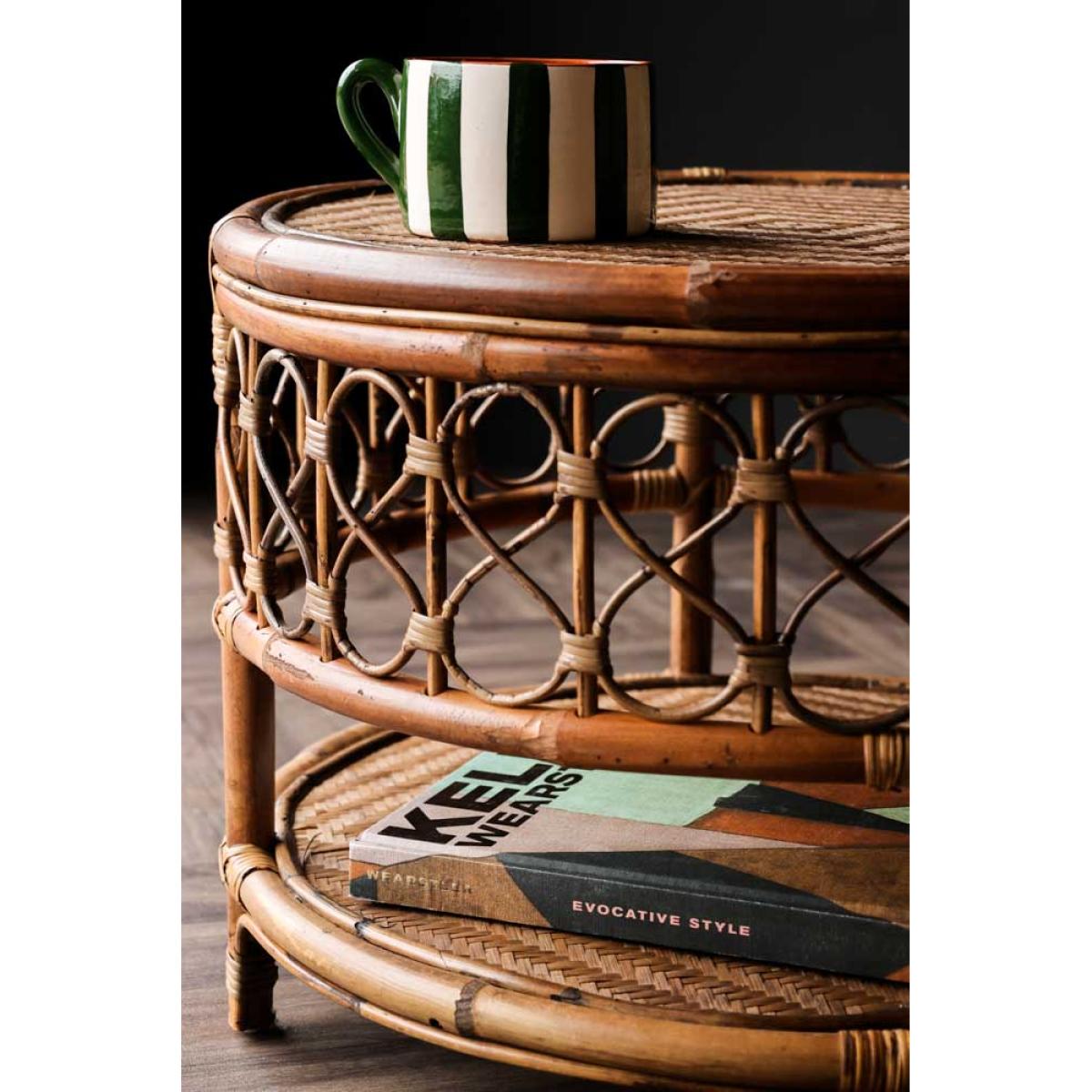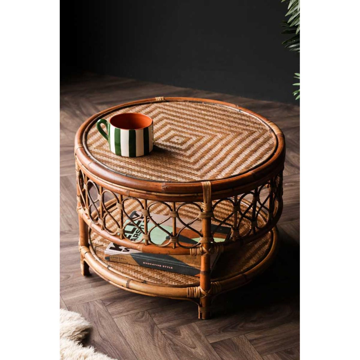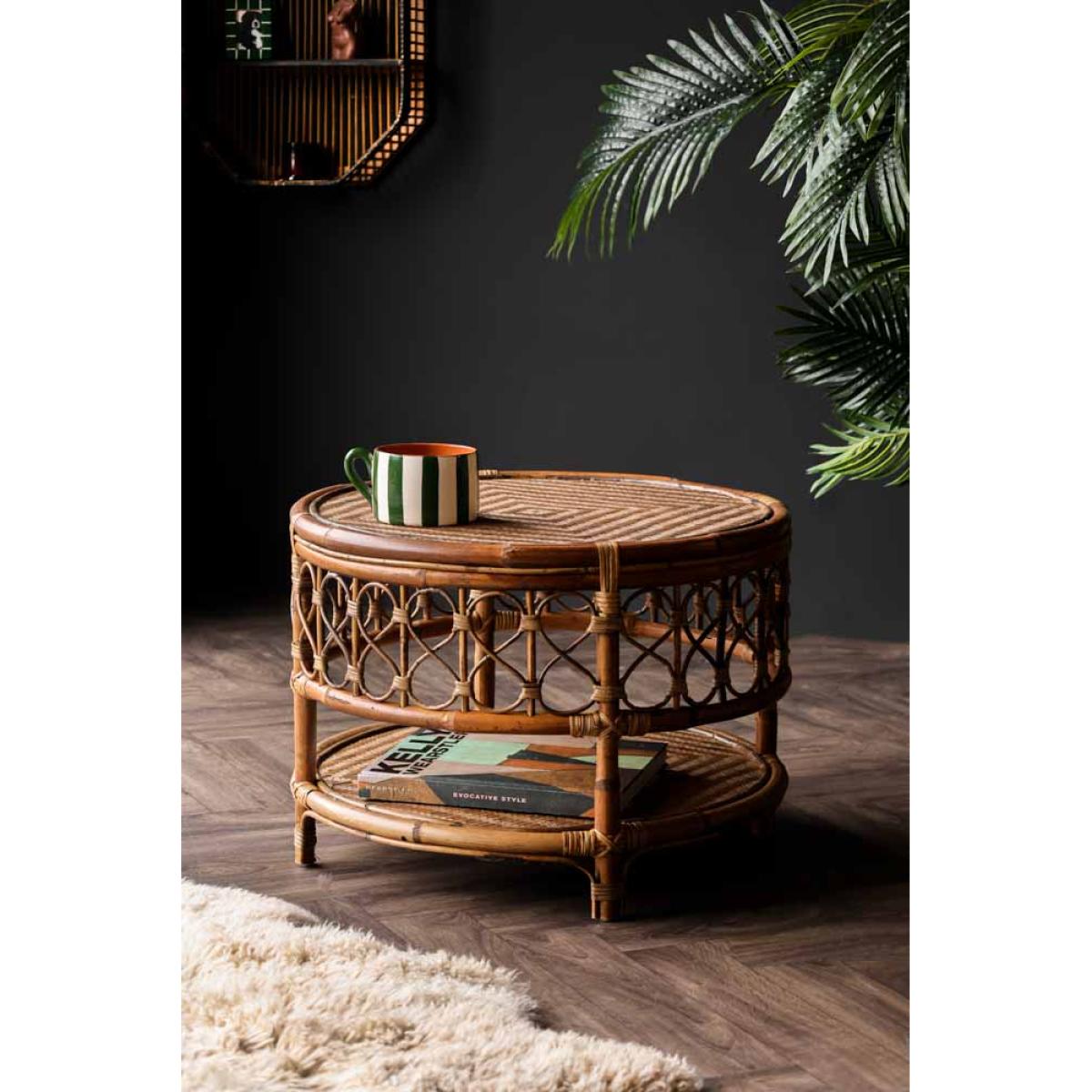 About The Wicker Coffee Table With Shelf The Wicker Coffee Table With Shelf is a gorgeous styling piece that will complete your living space. Made from rattan, the round coffee table features a wooden base with a rattan top shelf and beautifully curved wicker detailing around the side. Measuring H42cm x D58cm, the design includes a lower-level shelf that is a fabulous feature for storing books and magazines. Why We Think You’ll Love The Rattan Coffee TableCoffee tables are one of the unsung heroes of any living space and help to zone the room. As a result, the coffee table is ideal for creating a relaxing lounging area for reading books or catching up on your latest series obsession. Taking inspiration from iconic 70s style, the wicker round coffee table is the perfect piece to sit in front of your sofa. Introducing beautiful natural texture to the home, the design has a boho Palm Springs vibe that everyone needs in their life! How To Style The Living Room Coffee TableWicker and rattan materials look great in almost every interior scheme imaginable and therefore the Wicker Coffee Table With Shelf can be paired with both maximalist spaces of sumptuous velvet sofas and an indoor jungle of plants or more pared-back lounge areas with linen armchairs and jute rugs on the floor. Although designed for inside use, the rattan round coffee table can be introduced to the garden to create an outside living space on sunny summer days.