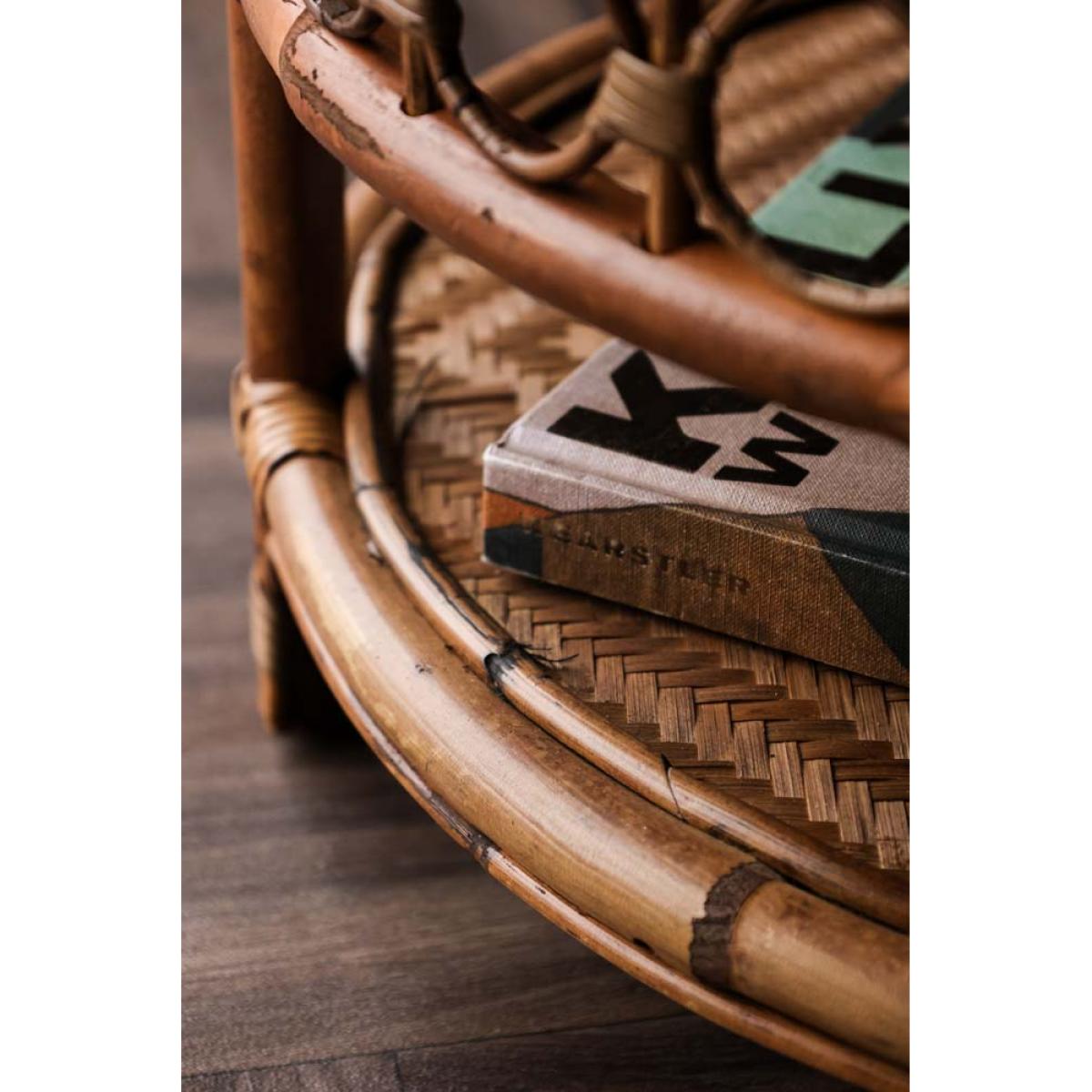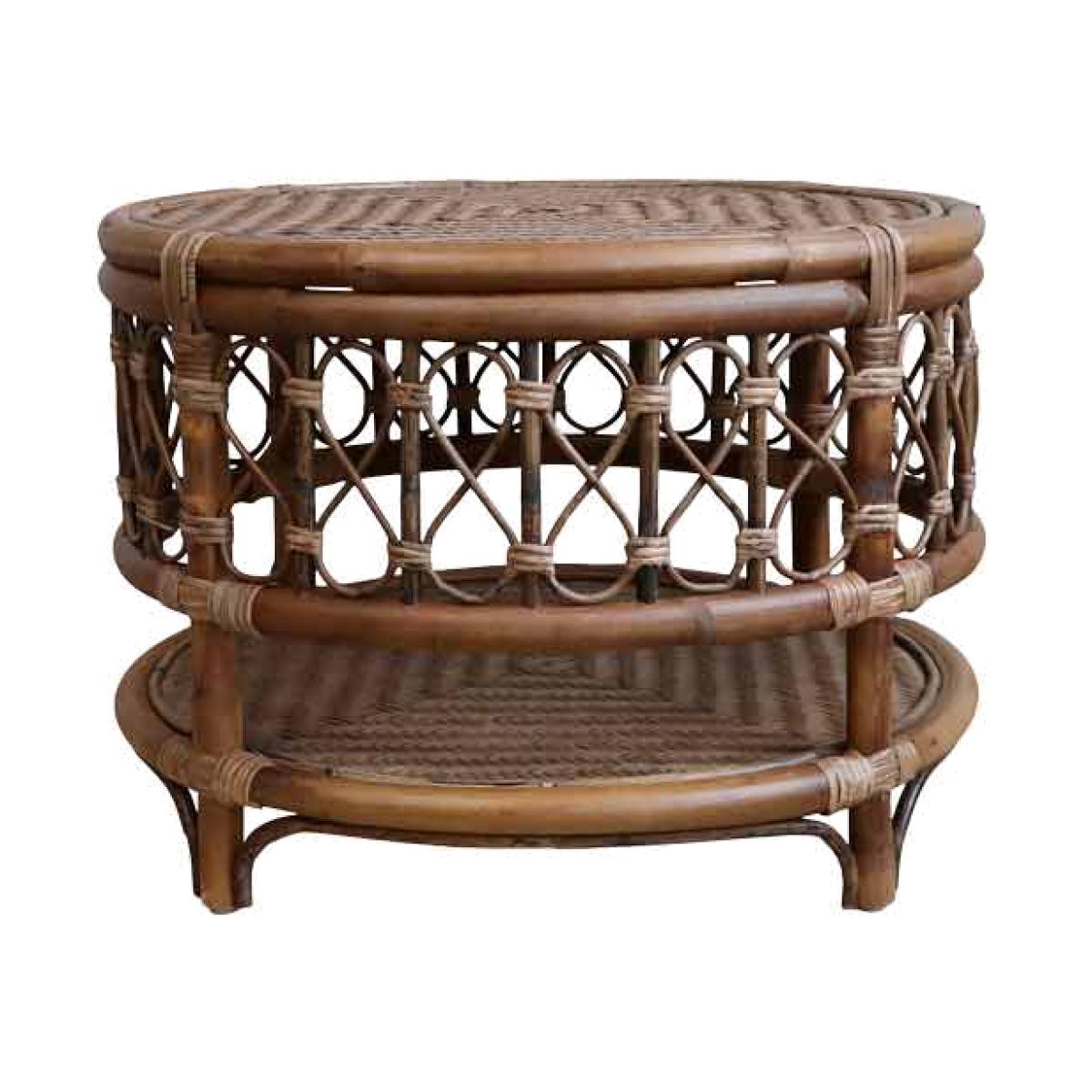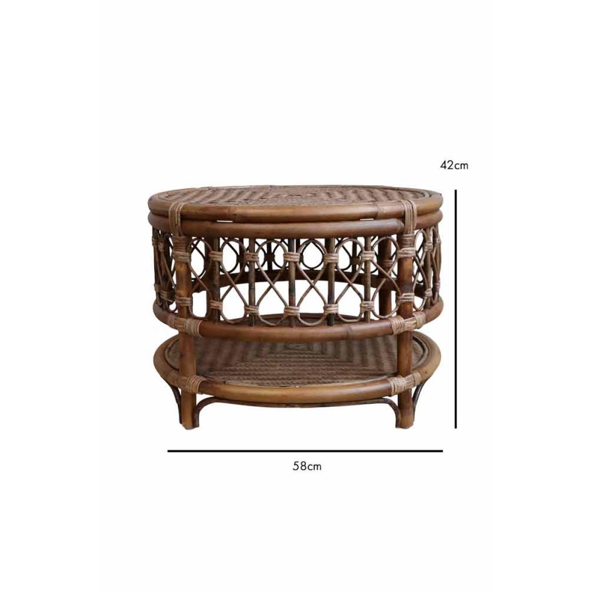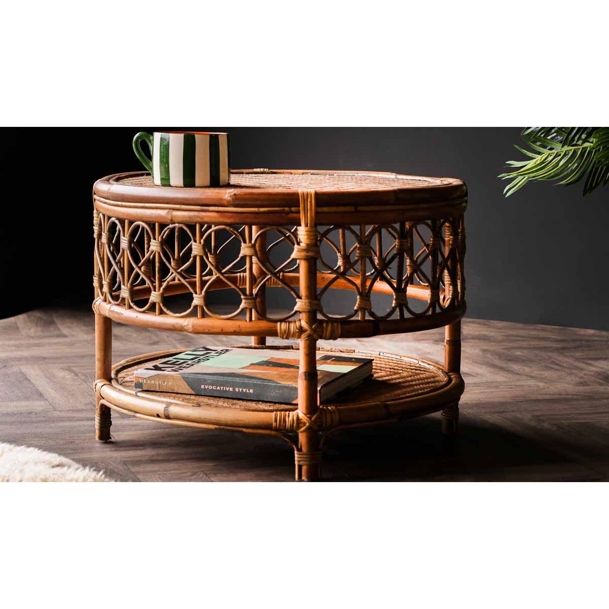 About The Wicker Coffee Table With Shelf The Wicker Coffee Table With Shelf is a gorgeous styling piece that will complete your living space. Made from rattan, the round coffee table features a wooden base with a rattan top shelf and beautifully curved wicker detailing around the side. Measuring H42cm x D58cm, the design includes a lower-level shelf that is a fabulous feature for storing books and magazines. Why We Think You’ll Love The Rattan Coffee TableCoffee tables are one of the unsung heroes of any living space and help to zone the room. As a result, the coffee table is ideal for creating a relaxing lounging area for reading books or catching up on your latest series obsession. Taking inspiration from iconic 70s style, the wicker round coffee table is the perfect piece to sit in front of your sofa. Introducing beautiful natural texture to the home, the design has a boho Palm Springs vibe that everyone needs in their life! How To Style The Living Room Coffee TableWicker and rattan materials look great in almost every interior scheme imaginable and therefore the Wicker Coffee Table With Shelf can be paired with both maximalist spaces of sumptuous velvet sofas and an indoor jungle of plants or more pared-back lounge areas with linen armchairs and jute rugs on the floor. Although designed for inside use, the rattan round coffee table can be introduced to the garden to create an outside living space on sunny summer days.