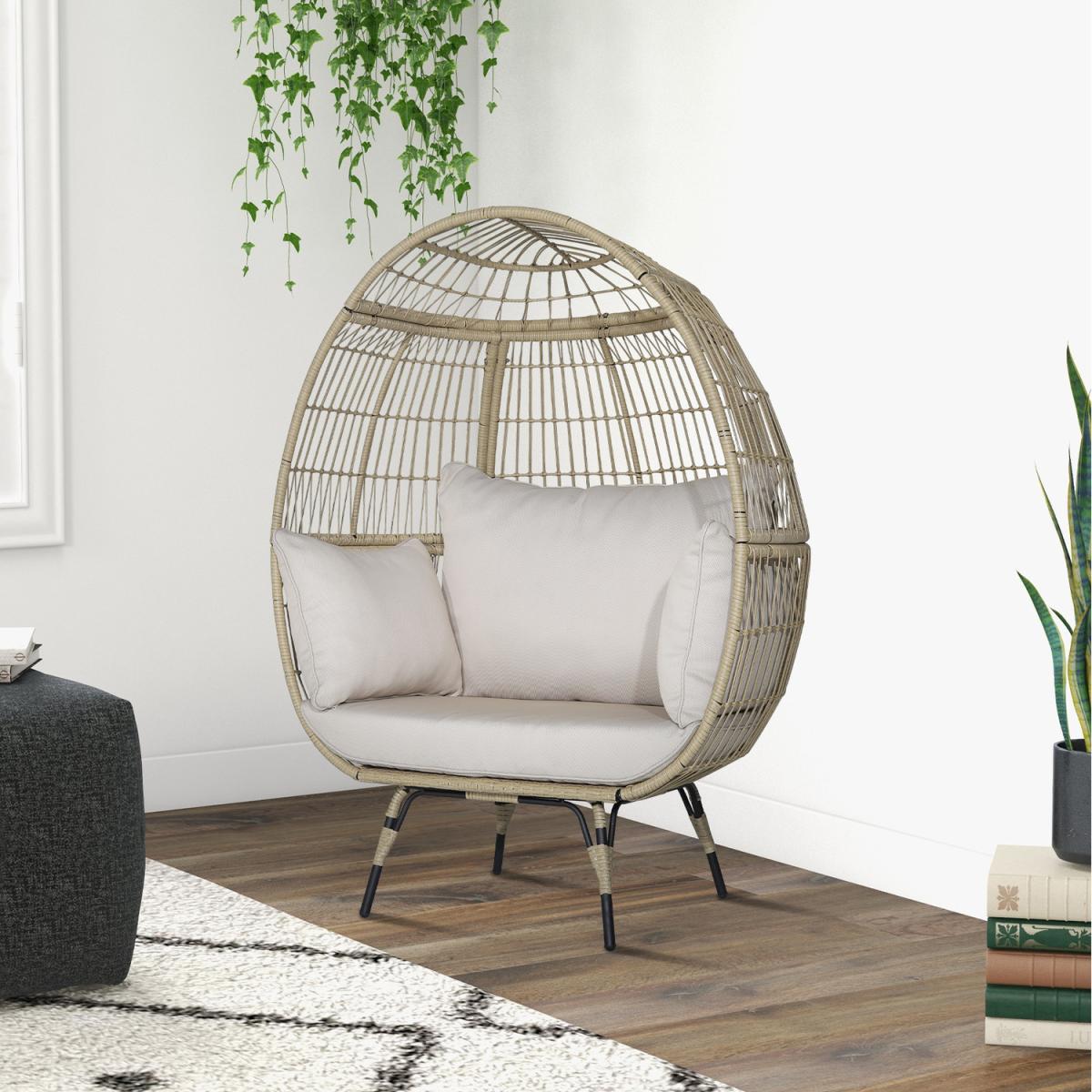 This oversize lounger measures 110 x 82 x 145cm (L x W x H) in the dimension that is aimed to provide you with a large sitting area for curling up. At the same time, the 12cm thickened seat cushion and other soft padded cushions take the comfort to the next level. What's more, the extra-wide opening and 180kg weight capacity make this lounge chair fit most users. In addition, the anti-rust and heavy-duty metal frame as well as fade-resistant and sun-protective hand-woven PE wicker give this egg chair better ability for the outdoor environment.
