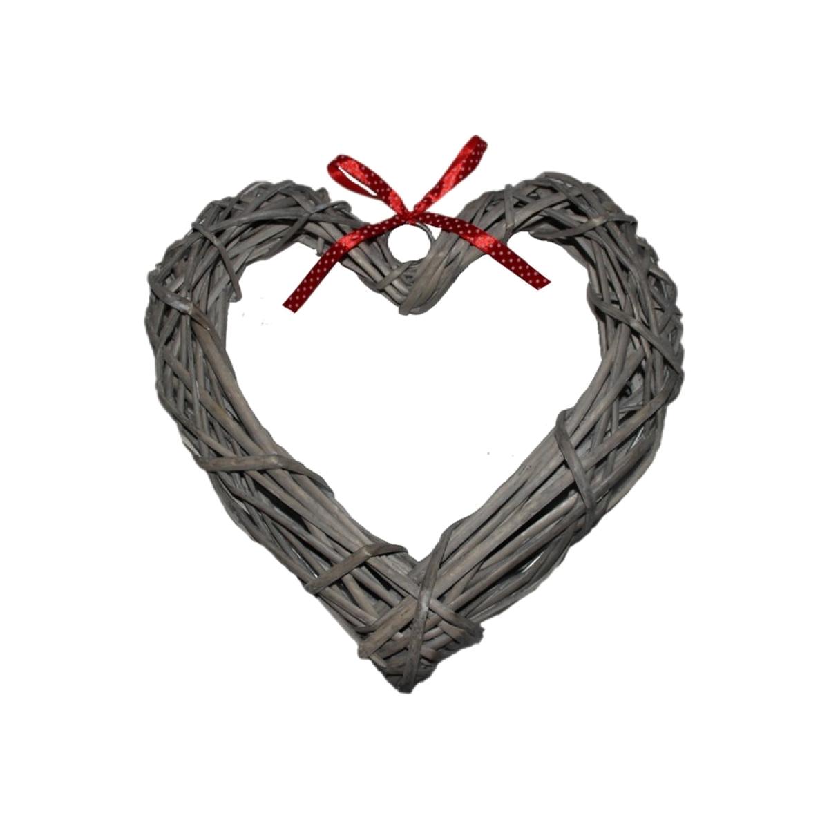Wicker Heart Wreath With Red Spotty Ribbon - Grey Brown / 28cm
