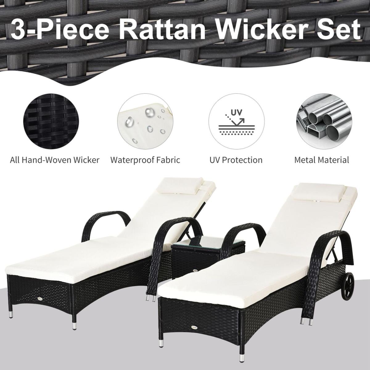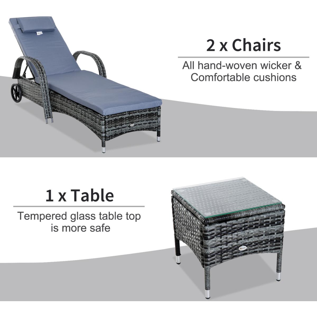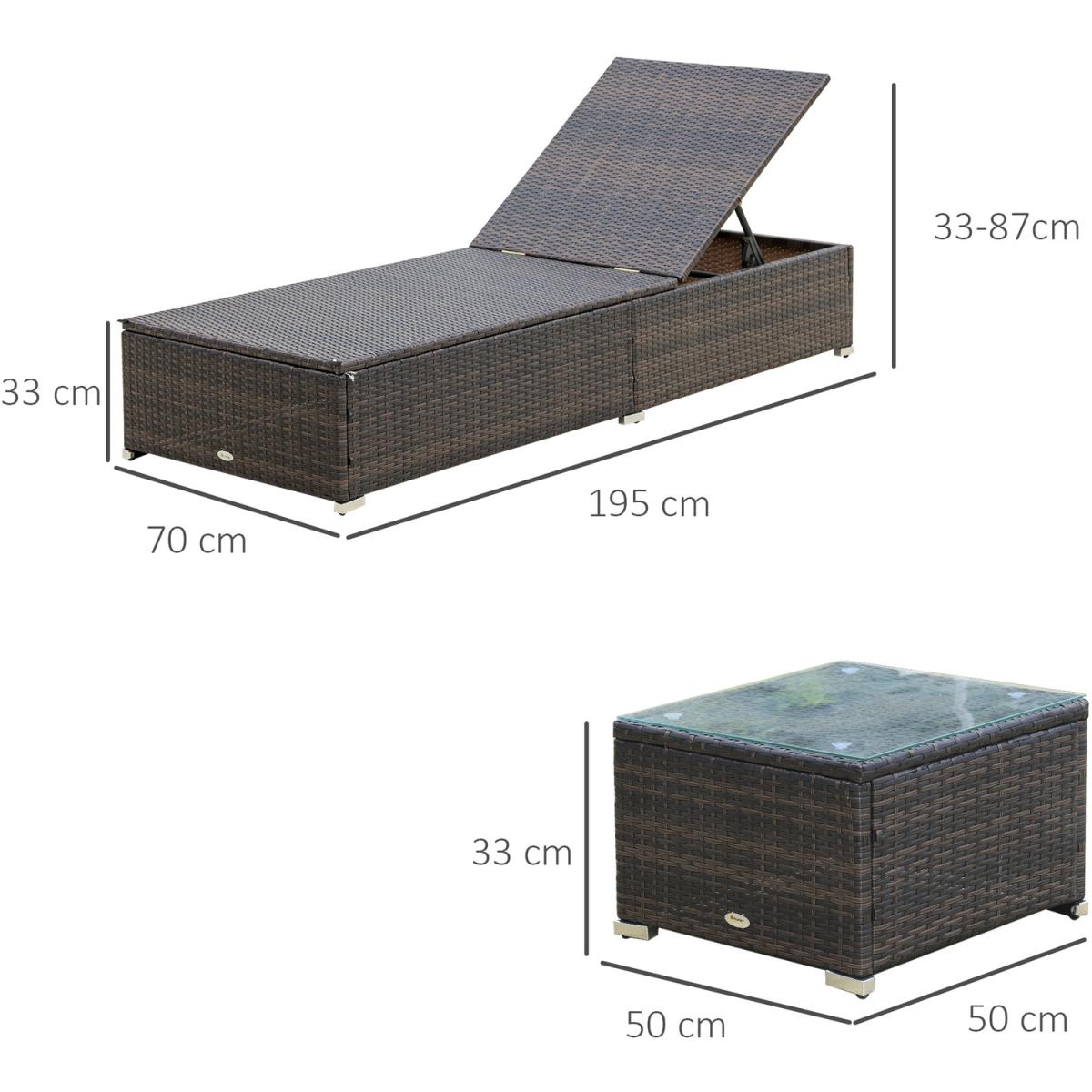 The rattan lounger set from Outsunny comes complete with 2 loungers, 1 side table and cushions. The seat has 5 adjustable positions to give maximum relaxation and comfort. The side table also has a glass top to keep your drinks at easy reach, and the set can be used indoors and outdoors.