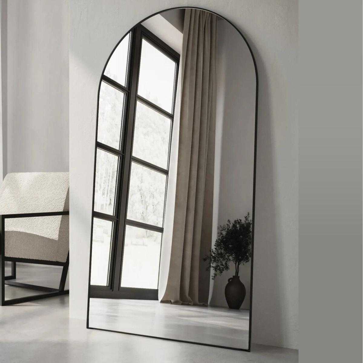 Discover our exquisite arched black full length mirror, generously sized at 150cm x 80cm! Boasting an elegant and modern design, this leaner mirror is a superb enhancement for every home. Its adaptability ensures it complements any room, infusing a hint of elegance and refinement into your interior. Whether you need to assess your attire or amplify the perception of spaciousness, this mirror is an essential addition to contemporary homes. Don't miss out! Elevate your living space today with our full length black arched mirror. It includes built in hanging brackets and fixings in the box for effortless hanging. The versatility of this piece means it can be used as a floor standing mirror or an extra large wall mirror.