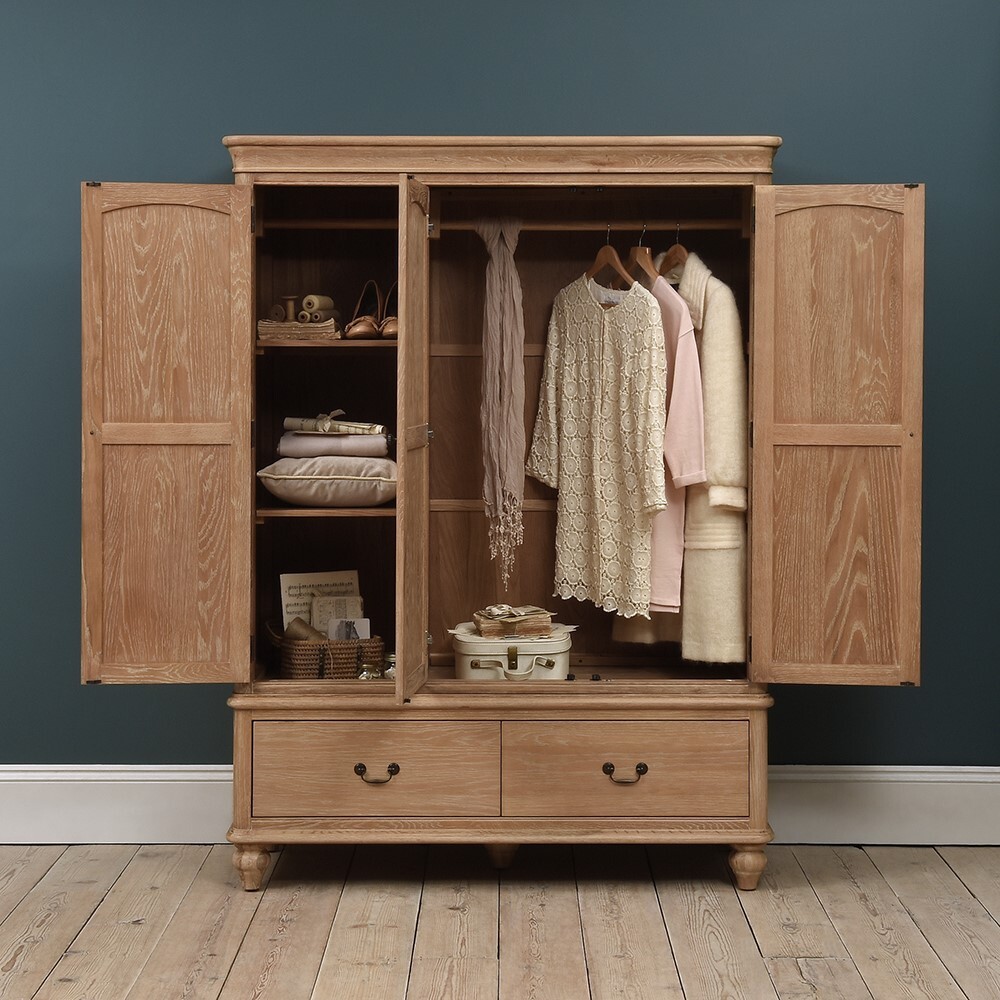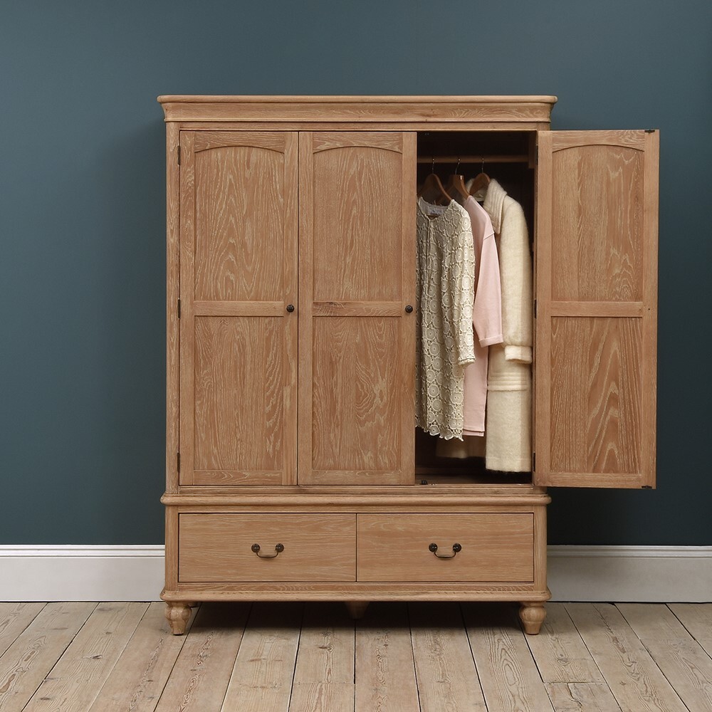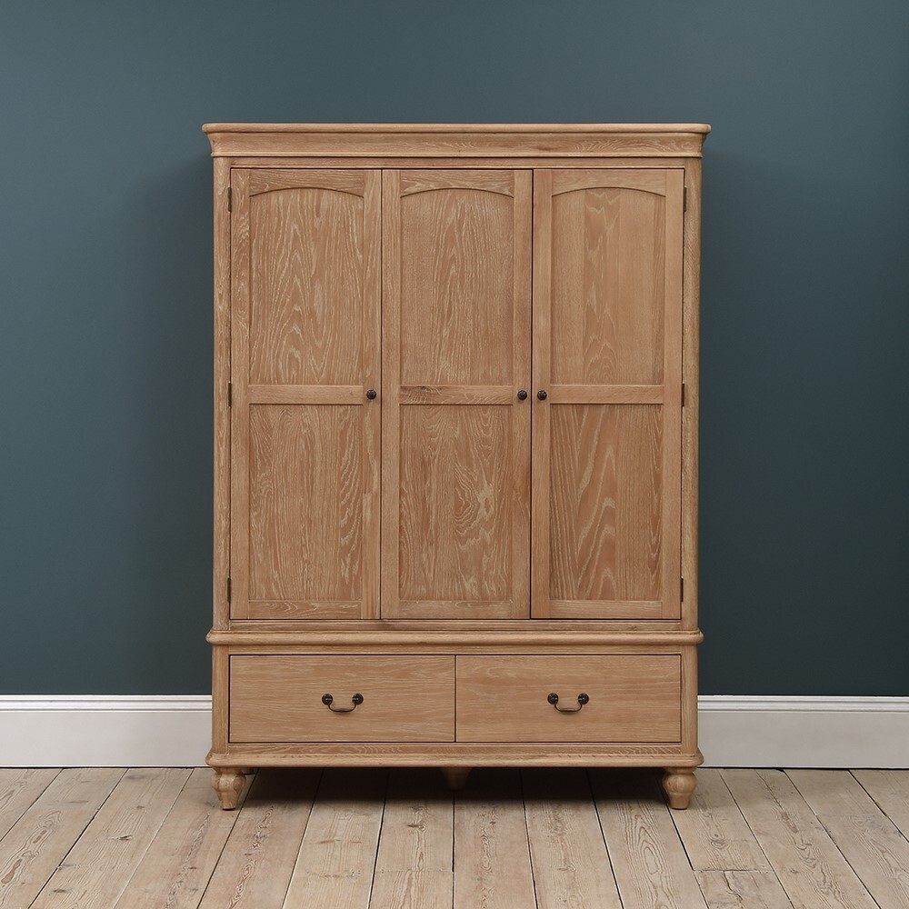 For a little more storage, our large Wickham Washed Oak Triple Wardrobe boasts ample space. With the option of having a double and single rail for hanging coats, jackets and blouses, the single rail can be switched out for shelving in which to keep jumpers, tops and jeans, should you need it. For more seasonal items, the two roomy bottom drawers are perfect for stowing away heavier clothing items or spare bedding and blankets too. A beautiful natural oak finish that exudes effortless rustic charm, the elegant turned feet and decorative handles add an altogether timeless and traditional feel.